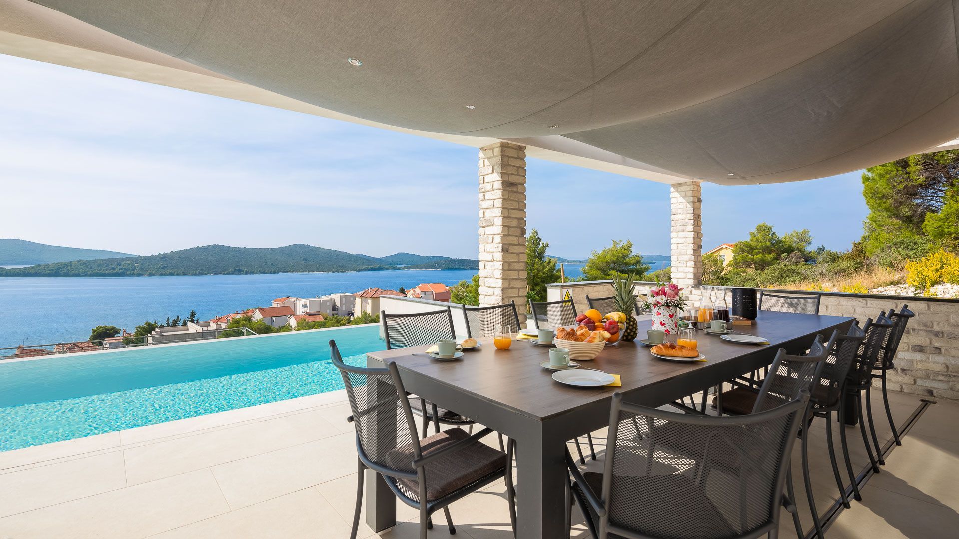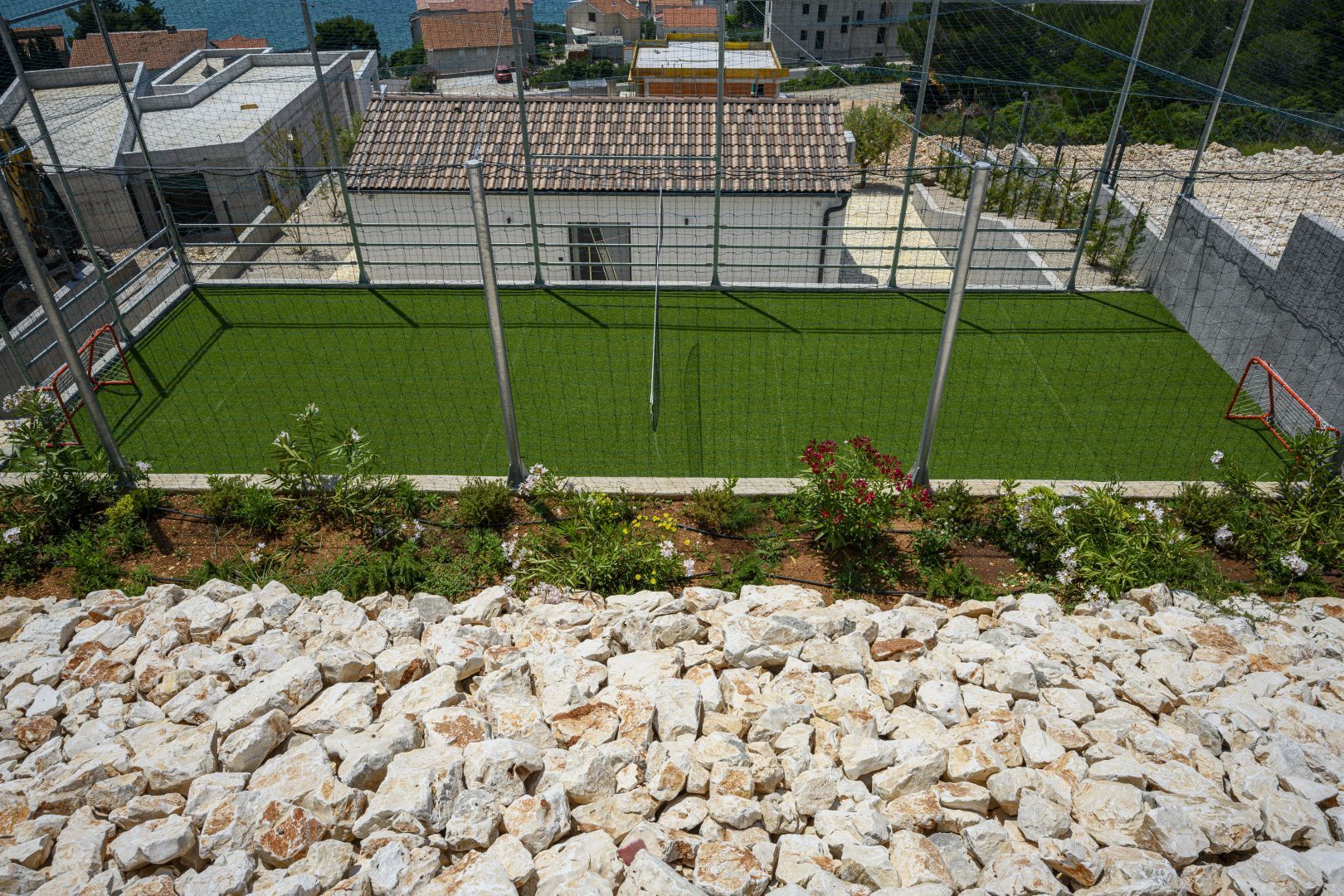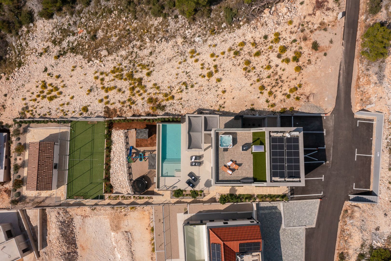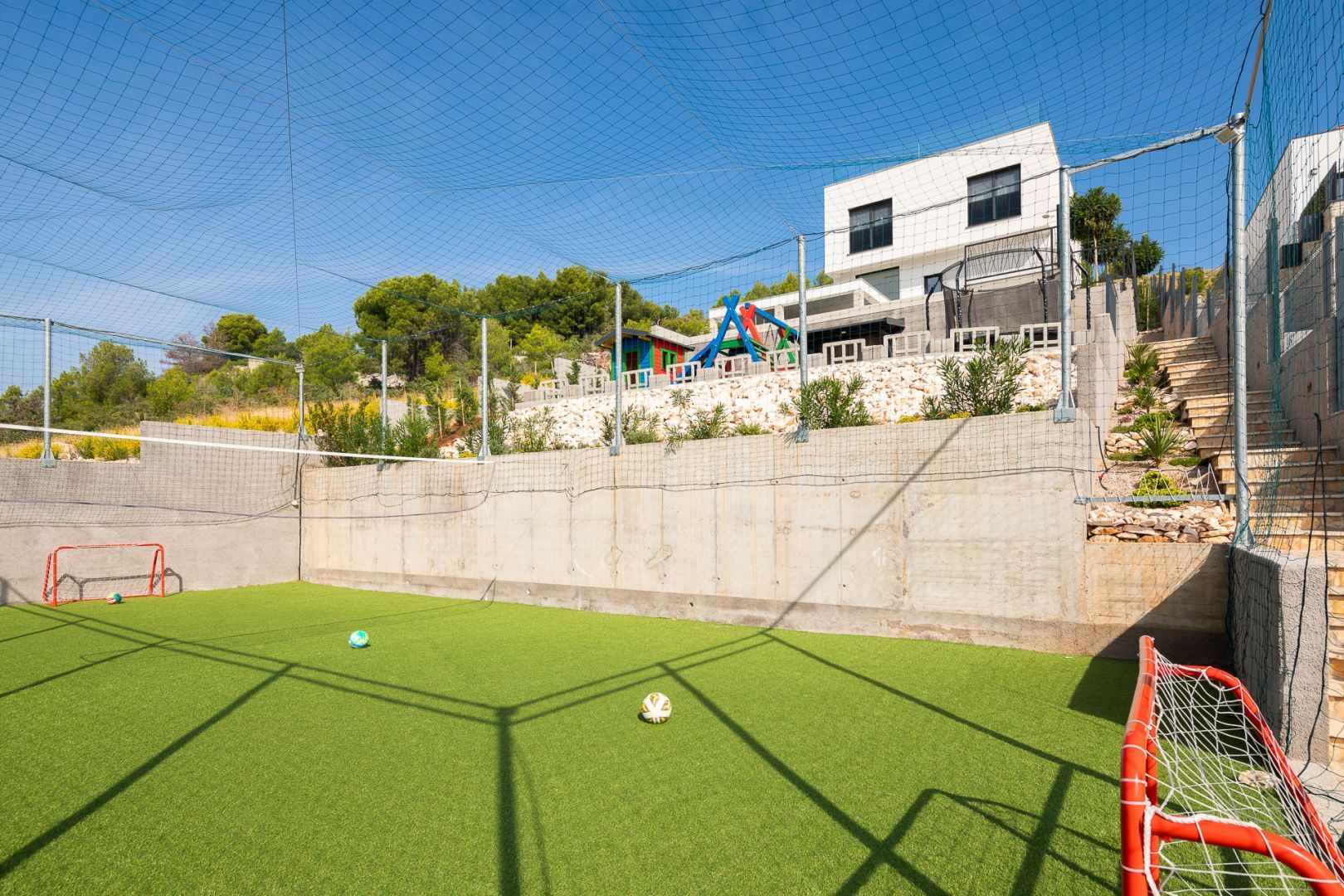 DALMATIEN, ŠIBENIK - Luxusvilla mit Swimmingpool, Fußballplatz und Sauna Wir präsentieren stolz diese äußerst luxuriöse Familienvilla in einer der luxuriösesten Siedlungen im südlichen Teil der dalmatinischen Küste. Es geht darum, sonnenverwöhnt und mit viel Grün geschmückt zu sein. Nur wenige Autominuten oder zu Fuß vom Zentrum und den wunderschönen Stränden entfernt liegt diese unumgängliche Villa, die jede Aufmerksamkeit wert ist. Was dieses Anwesen von allen anderen unterscheidet, ist die Tatsache, dass es von Anfang an als private Oase der Ruhe für die Bedürfnisse des Eigentümers und seiner Familie gebaut wurde, was gleichzeitig die hohe Qualität aller durchgeführten Arbeiten bestätigt Qualitätsniveau aller verwendeten Materialien, äußerst wertvolle und einzigartige Möbel sowie die Gestaltung des Innenraums mit dem Innenhof der Villa. Ziel war es, in jedem Raum der Villa ein Höchstmaß an Komfort und Funktionalität zu gewährleisten. Zusätzlich zu allem, was oben erwähnt wurde, wurde die Lage der Villa sorgfältig ausgewählt, um den von den Eigentümern angestrebten Bedürfnissen nach Ruhe, Privatsphäre und Luxus gerecht zu werden, während sie darüber hinaus das Leben und den Aufenthalt in der Villa einfach macht Nähe der notwendigen Einrichtungen wie Geschäfte, Restaurants, Schulen, zahlreiche Spaziergänge, der Strand und dergleichen. Begleiten Sie uns in der Geschichte dieser seltenen und wertvollen Gelegenheit, einer der attraktivsten Villen an diesem Teil der Küste. BESCHREIBUNG DER IMMOBILIE: Nur 180 m vom angelegten Strand und dem kristallklaren Meer entfernt befindet sich diese hochwertige freistehende Familienvilla mit insgesamt 360,75 m² Wohnfläche, die sich über zwei Etagen erstreckt und auf einem angelegten und angelegten Grundstück liegt gepflegte Grundstücke. Beim Betreten der Villa werden wir zunächst von einer anmutigen und luxuriösen Lobby voller Tageslicht mit Platz für eine Garderobe begrüßt, die uns dann in den als offenen Raum gestalteten Wohnbereich im Erdgeschoss führt. In diesem Teil der Villa dominiert ein komfortables und geräumiges Wohnzimmer, das mit großen Glaswänden geschmückt ist, mit deren Hilfe der Raum mit Tageslicht durchflutet wird, was ein Gefühl von Luxus, Wärme des Raumes und seiner Luftigkeit vermittelt. Ebenso eröffnet sich durch die gleichen Glaswände ein direkter Zugang zur überdachten Sommerterrasse und ein Blick auf den größeren Pool. Neben dem Wohnzimmer gibt es auch einen Essbereich, der groß genug für die ganze Familie ist, sowie eine etwas separate und etwas privatere, moderne, helle Küche, die mit erstklassigen italienischen Elementen ausgestattet ist und exklusiv für diese Villa ausgewählt wurde. Im zweiten Teil des Erdgeschosses gibt es ein zusätzliches Wohnzimmer und einen Kamin. Eine Innentreppe führt in die mittlere Etage, wo sich ein großzügiger Fitnessraum für alle Sportbegeisterten und ein Billardraum zum Entspannen mit Freunden und Familie befinden. Im zweiten Teil gibt es außerdem einen Spa-Bereich zum Entspannen, der über eine Sauna und ein eigenes Badezimmer verfügt. Durch den Flur erreichen wir den Teil, in dem sich ein Heizraum, ein Abstellraum und eine Waschküche befinden. Eine elegante Innentreppe führt in die erste Etage der Villa, wo sich vier geräumige Schlafzimmer befinden, von denen jedes über ein eigenes Bad verfügt, während das Hauptschlafzimmer über eine eigene Terrasse verfügt. Darüber hinaus bietet jedes Schlafzimmer einen unglaublichen Panoramablick auf das endlose Meer und die dalmatinischen Inseln. Und so nehmen wir die Innentreppe zum Dach, wo sich ein luxuriöser Whirlpool befindet, wo Sie die makellose Aussicht bei einem Glas Ihres Lieblingssekts genießen können. Es handelt sich um eine Villa, die ausschließlich für die Bedürfnisse des Eigentümers gebaut und mit Hilfe von Top-Designern so dekoriert wurde, dass die Villa Luxus ausstrahlt und zeitlos bleibt. Daher achteten die Eigentümer absolut auf jedes Detail und legten gleichzeitig größten Wert auf den Komfort und die Funktionalität jedes Zimmers. Ebenso legten die Eigentümer großen Wert auf den weitläufigen Garten, der vollständig eingezäunt und vor jedermanns Sicht verborgen ist und ein Höchstmaß an Privatsphäre und Ruhe bietet. Der Innenhof der Villa ist auf luxuriöseste Weise dekoriert und verfügt über einen privaten Spielplatz und einen Park für Kinder, während alle im Innenhof der Villa befindlichen Inhalte durch malerische Wege verbunden sind. So befindet sich im Garten ein großzügiger Swimmingpool mit Liegewiese, und ein besonderes Detail des Pools ist, dass er durch seine Lage auf dem Feld, die Beschaffenheit des Feldes und den Blick Richtung Meer ein Gefühl von Entspannung vermittelt endlose Verbindung mit dem Meer und den Inseln. In den warmen Sommermonaten haben Sie die Möglichkeit, Ihre Zeit in einer separaten, größeren Sommerküche mit einem echten istrischen Kamin und einer funktionalen Küche sowie Sitzgelegenheiten zu verbringen. Außerdem gibt es im Garten eine zusätzliche Wohnung von 49,50 m2, die aus einem Wohnzimmer, einer Küche und einem Esszimmer besteht. Im zweiten Teil gibt es ein Schlafzimmer und ein Badezimmer. WEITERE INFORMATIONEN; *Solarkraftwerk *Der Hof und die Umgebung verfügen über eine indirekte Beleuchtung, die ferngesteuert werden kann *Das gesamte Gebäude verfügt über Fußbodenheizung und -kühlung, jedes Zimmer verfügt über einen eigenen Thermostat (mit der Möglichkeit der Fernbedienung) und eine Wärmepumpe *Alle Zimmer verfügen über Klimaanlagen *Das Gebäude verfügt über einen Wasserenthärter im Heizraum, das Wasser im Haus ist kalkfrei *Alle Möbel sind maßgefertigt *Die Anlage und die Umgebung sind vollständig mit Videoüberwachung abgedeckt *Die Anlage ist mit einem Paradox-Alarmsystem ausgestattet *Der Pool wird durch eine eigene Wärmepumpe, Überlauf (unendlich) beheizt und für