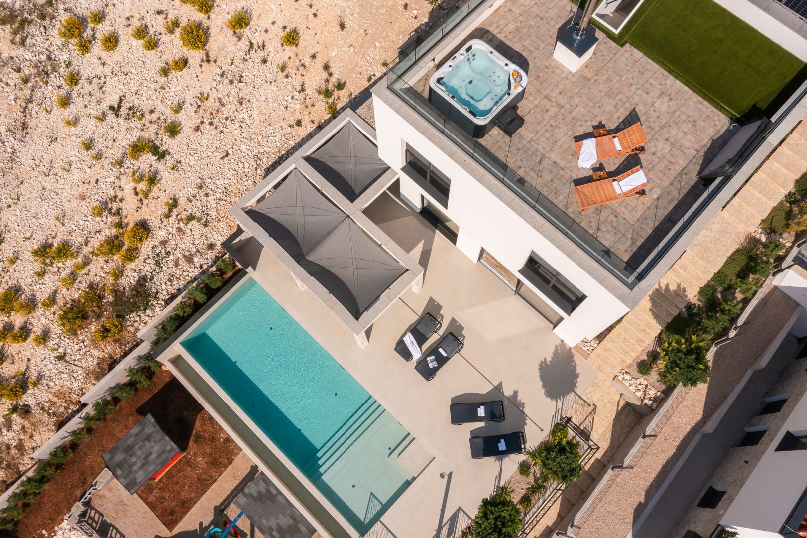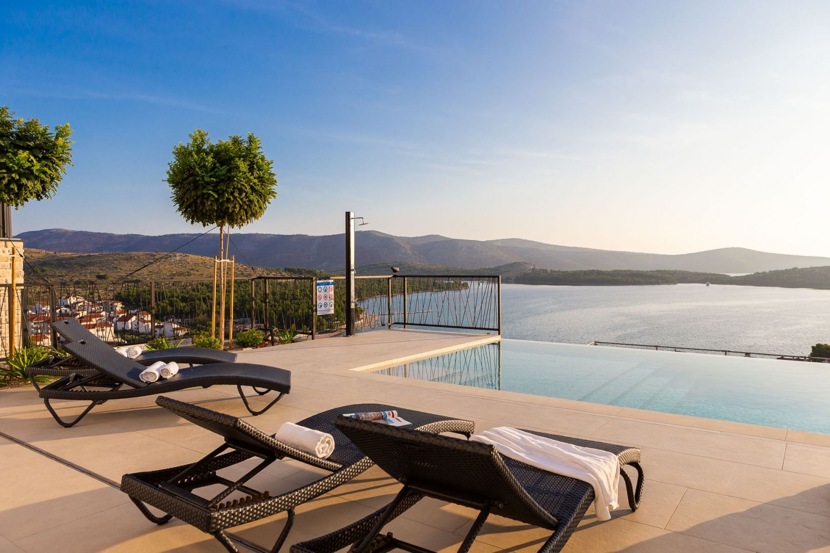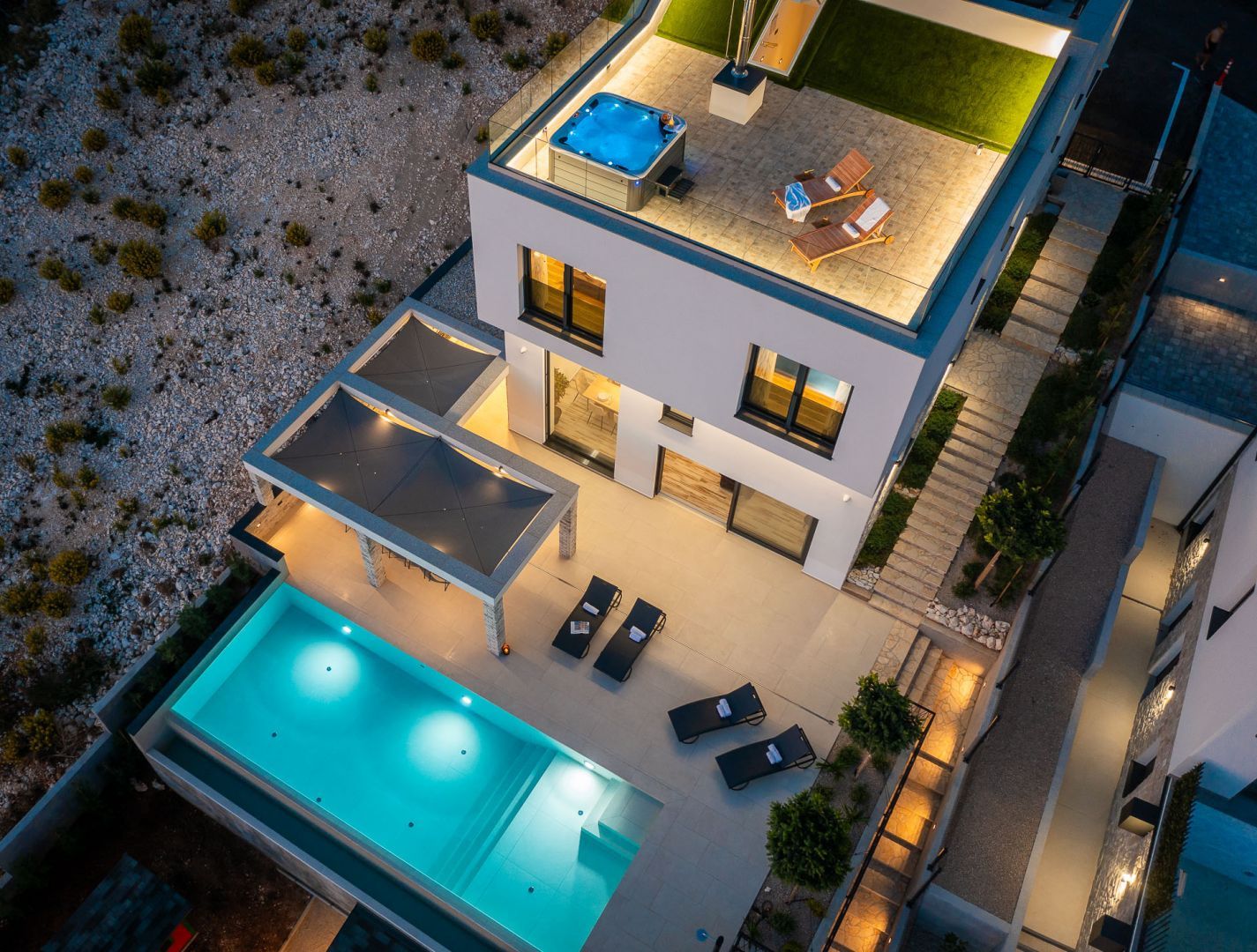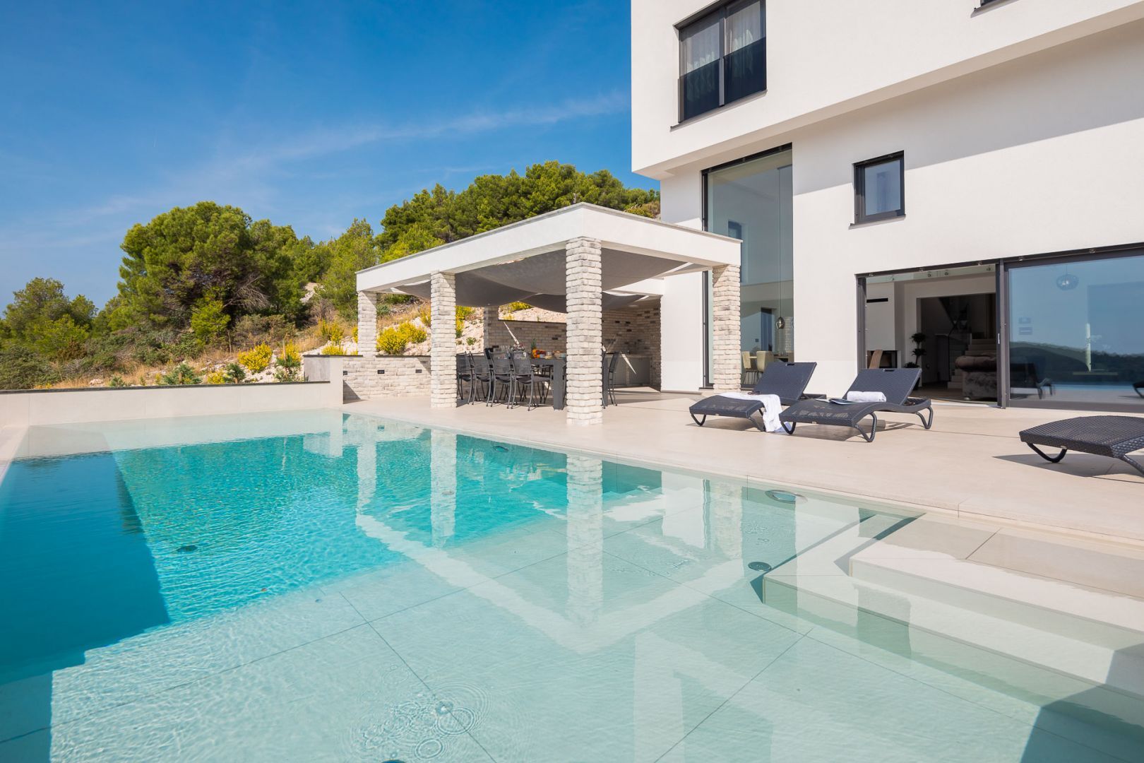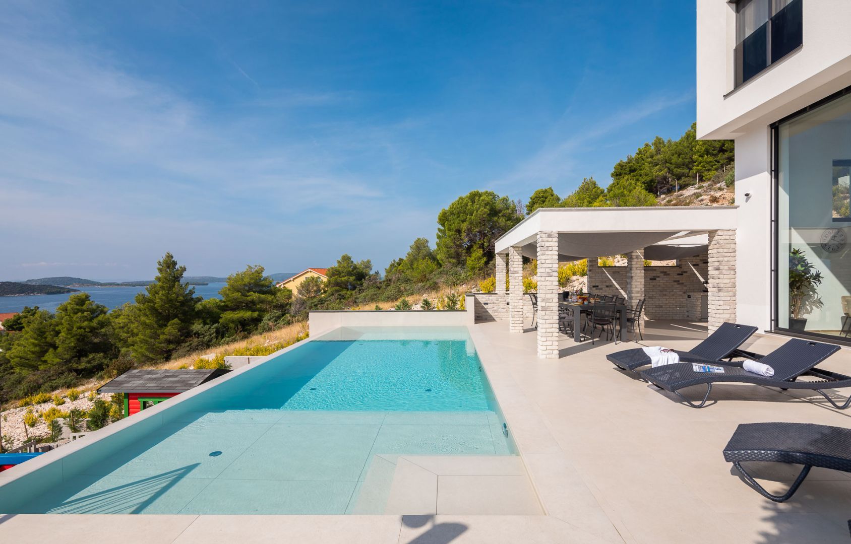 DALMATIEN, ŠIBENIK - Luxusvilla mit Swimmingpool, Fußballplatz und Sauna Wir präsentieren stolz diese äußerst luxuriöse Familienvilla in einer der luxuriösesten Siedlungen im südlichen Teil der dalmatinischen Küste. Es geht darum, sonnenverwöhnt und mit viel Grün geschmückt zu sein. Nur wenige Autominuten oder zu Fuß vom Zentrum und den wunderschönen Stränden entfernt liegt diese unumgängliche Villa, die jede Aufmerksamkeit wert ist. Was dieses Anwesen von allen anderen unterscheidet, ist die Tatsache, dass es von Anfang an als private Oase der Ruhe für die Bedürfnisse des Eigentümers und seiner Familie gebaut wurde, was gleichzeitig die hohe Qualität aller durchgeführten Arbeiten bestätigt Qualitätsniveau aller verwendeten Materialien, äußerst wertvolle und einzigartige Möbel sowie die Gestaltung des Innenraums mit dem Innenhof der Villa. Ziel war es, in jedem Raum der Villa ein Höchstmaß an Komfort und Funktionalität zu gewährleisten. Zusätzlich zu allem, was oben erwähnt wurde, wurde die Lage der Villa sorgfältig ausgewählt, um den von den Eigentümern angestrebten Bedürfnissen nach Ruhe, Privatsphäre und Luxus gerecht zu werden, während sie darüber hinaus das Leben und den Aufenthalt in der Villa einfach macht Nähe der notwendigen Einrichtungen wie Geschäfte, Restaurants, Schulen, zahlreiche Spaziergänge, der Strand und dergleichen. Begleiten Sie uns in der Geschichte dieser seltenen und wertvollen Gelegenheit, einer der attraktivsten Villen an diesem Teil der Küste. BESCHREIBUNG DER IMMOBILIE: Nur 180 m vom angelegten Strand und dem kristallklaren Meer entfernt befindet sich diese hochwertige freistehende Familienvilla mit insgesamt 360,75 m² Wohnfläche, die sich über zwei Etagen erstreckt und auf einem angelegten und angelegten Grundstück liegt gepflegte Grundstücke. Beim Betreten der Villa werden wir zunächst von einer anmutigen und luxuriösen Lobby voller Tageslicht mit Platz für eine Garderobe begrüßt, die uns dann in den als offenen Raum gestalteten Wohnbereich im Erdgeschoss führt. In diesem Teil der Villa dominiert ein komfortables und geräumiges Wohnzimmer, das mit großen Glaswänden geschmückt ist, mit deren Hilfe der Raum mit Tageslicht durchflutet wird, was ein Gefühl von Luxus, Wärme des Raumes und seiner Luftigkeit vermittelt. Ebenso eröffnet sich durch die gleichen Glaswände ein direkter Zugang zur überdachten Sommerterrasse und ein Blick auf den größeren Pool. Neben dem Wohnzimmer gibt es auch einen Essbereich, der groß genug für die ganze Familie ist, sowie eine etwas separate und etwas privatere, moderne, helle Küche, die mit erstklassigen italienischen Elementen ausgestattet ist und exklusiv für diese Villa ausgewählt wurde. Im zweiten Teil des Erdgeschosses gibt es ein zusätzliches Wohnzimmer und einen Kamin. Eine Innentreppe führt in die mittlere Etage, wo sich ein großzügiger Fitnessraum für alle Sportbegeisterten und ein Billardraum zum Entspannen mit Freunden und Familie befinden. Im zweiten Teil gibt es außerdem einen Spa-Bereich zum Entspannen, der über eine Sauna und ein eigenes Badezimmer verfügt. Durch den Flur erreichen wir den Teil, in dem sich ein Heizraum, ein Abstellraum und eine Waschküche befinden. Eine elegante Innentreppe führt in die erste Etage der Villa, wo sich vier geräumige Schlafzimmer befinden, von denen jedes über ein eigenes Bad verfügt, während das Hauptschlafzimmer über eine eigene Terrasse verfügt. Darüber hinaus bietet jedes Schlafzimmer einen unglaublichen Panoramablick auf das endlose Meer und die dalmatinischen Inseln. Und so nehmen wir die Innentreppe zum Dach, wo sich ein luxuriöser Whirlpool befindet, wo Sie die makellose Aussicht bei einem Glas Ihres Lieblingssekts genießen können. Es handelt sich um eine Villa, die ausschließlich für die Bedürfnisse des Eigentümers gebaut und mit Hilfe von Top-Designern so dekoriert wurde, dass die Villa Luxus ausstrahlt und zeitlos bleibt. Daher achteten die Eigentümer absolut auf jedes Detail und legten gleichzeitig größten Wert auf den Komfort und die Funktionalität jedes Zimmers. Ebenso legten die Eigentümer großen Wert auf den weitläufigen Garten, der vollständig eingezäunt und vor jedermanns Sicht verborgen ist und ein Höchstmaß an Privatsphäre und Ruhe bietet. Der Innenhof der Villa ist auf luxuriöseste Weise dekoriert und verfügt über einen privaten Spielplatz und einen Park für Kinder, während alle im Innenhof der Villa befindlichen Inhalte durch malerische Wege verbunden sind. So befindet sich im Garten ein großzügiger Swimmingpool mit Liegewiese, und ein besonderes Detail des Pools ist, dass er durch seine Lage auf dem Feld, die Beschaffenheit des Feldes und den Blick Richtung Meer ein Gefühl von Entspannung vermittelt endlose Verbindung mit dem Meer und den Inseln. In den warmen Sommermonaten haben Sie die Möglichkeit, Ihre Zeit in einer separaten, größeren Sommerküche mit einem echten istrischen Kamin und einer funktionalen Küche sowie Sitzgelegenheiten zu verbringen. Außerdem gibt es im Garten eine zusätzliche Wohnung von 49,50 m2, die aus einem Wohnzimmer, einer Küche und einem Esszimmer besteht. Im zweiten Teil gibt es ein Schlafzimmer und ein Badezimmer. WEITERE INFORMATIONEN; *Solarkraftwerk *Der Hof und die Umgebung verfügen über eine indirekte Beleuchtung, die ferngesteuert werden kann *Das gesamte Gebäude verfügt über Fußbodenheizung und -kühlung, jedes Zimmer verfügt über einen eigenen Thermostat (mit der Möglichkeit der Fernbedienung) und eine Wärmepumpe *Alle Zimmer verfügen über Klimaanlagen *Das Gebäude verfügt über einen Wasserenthärter im Heizraum, das Wasser im Haus ist kalkfrei *Alle Möbel sind maßgefertigt *Die Anlage und die Umgebung sind vollständig mit Videoüberwachung abgedeckt *Die Anlage ist mit einem Paradox-Alarmsystem ausgestattet *Der Pool wird durch eine eigene Wärmepumpe, Überlauf (unendlich) beheizt und für