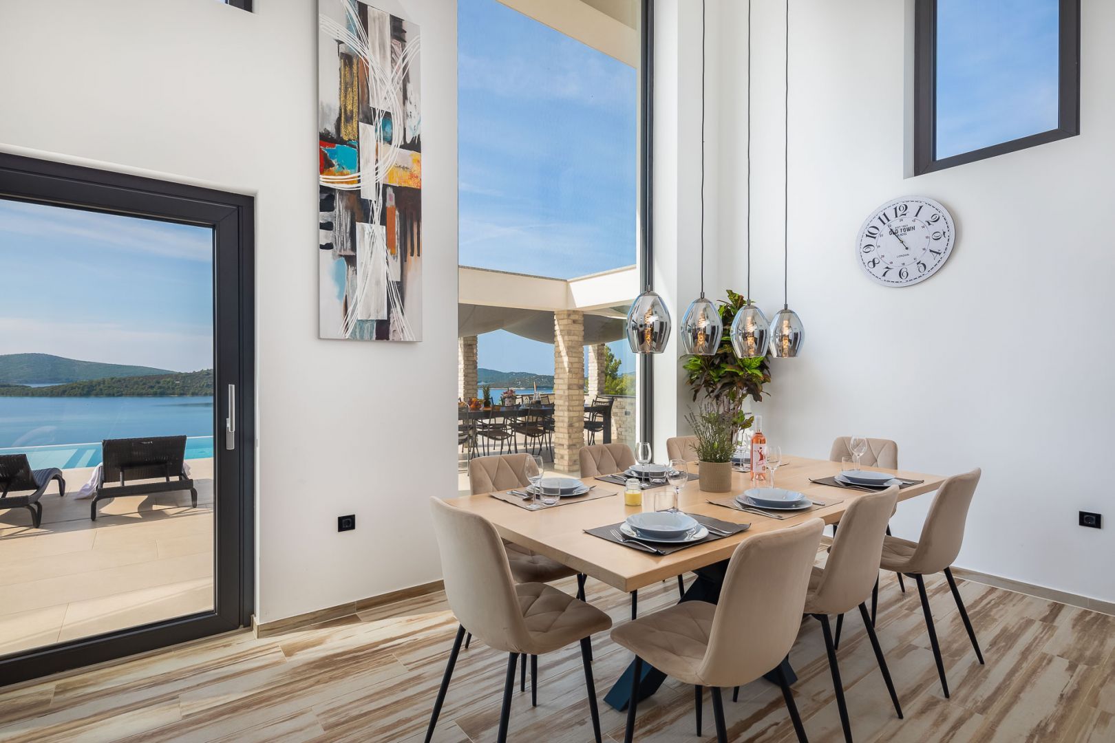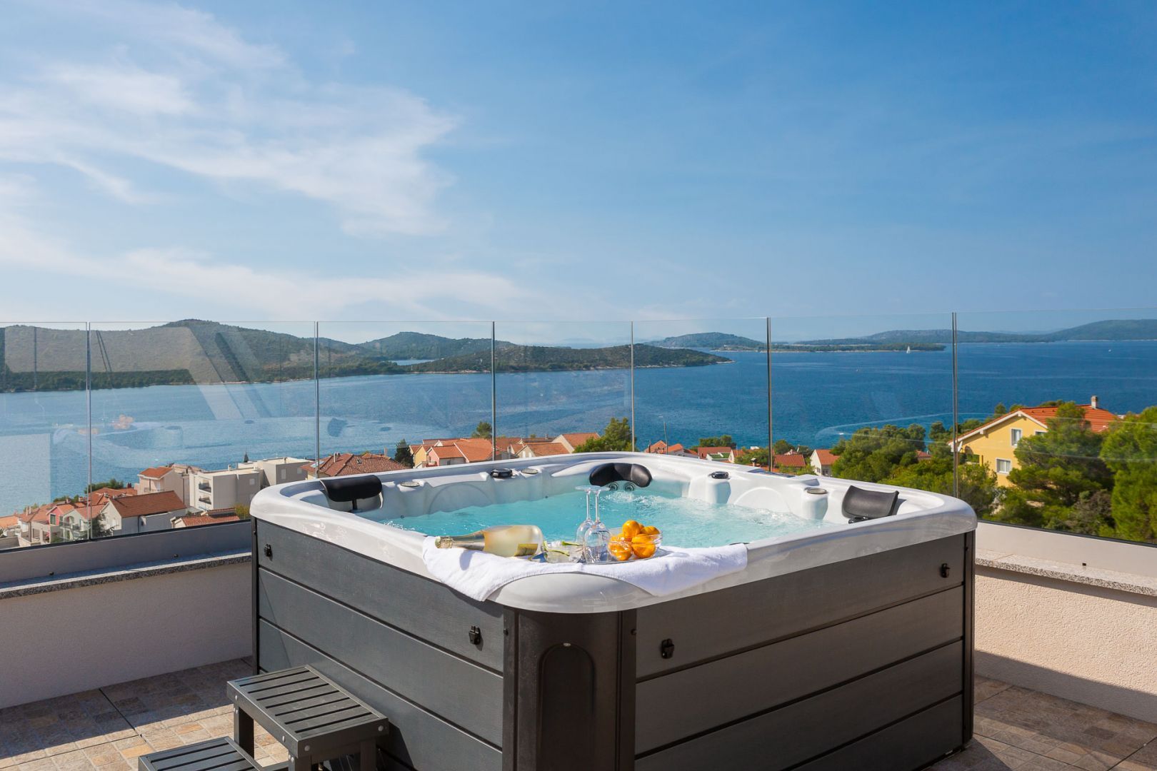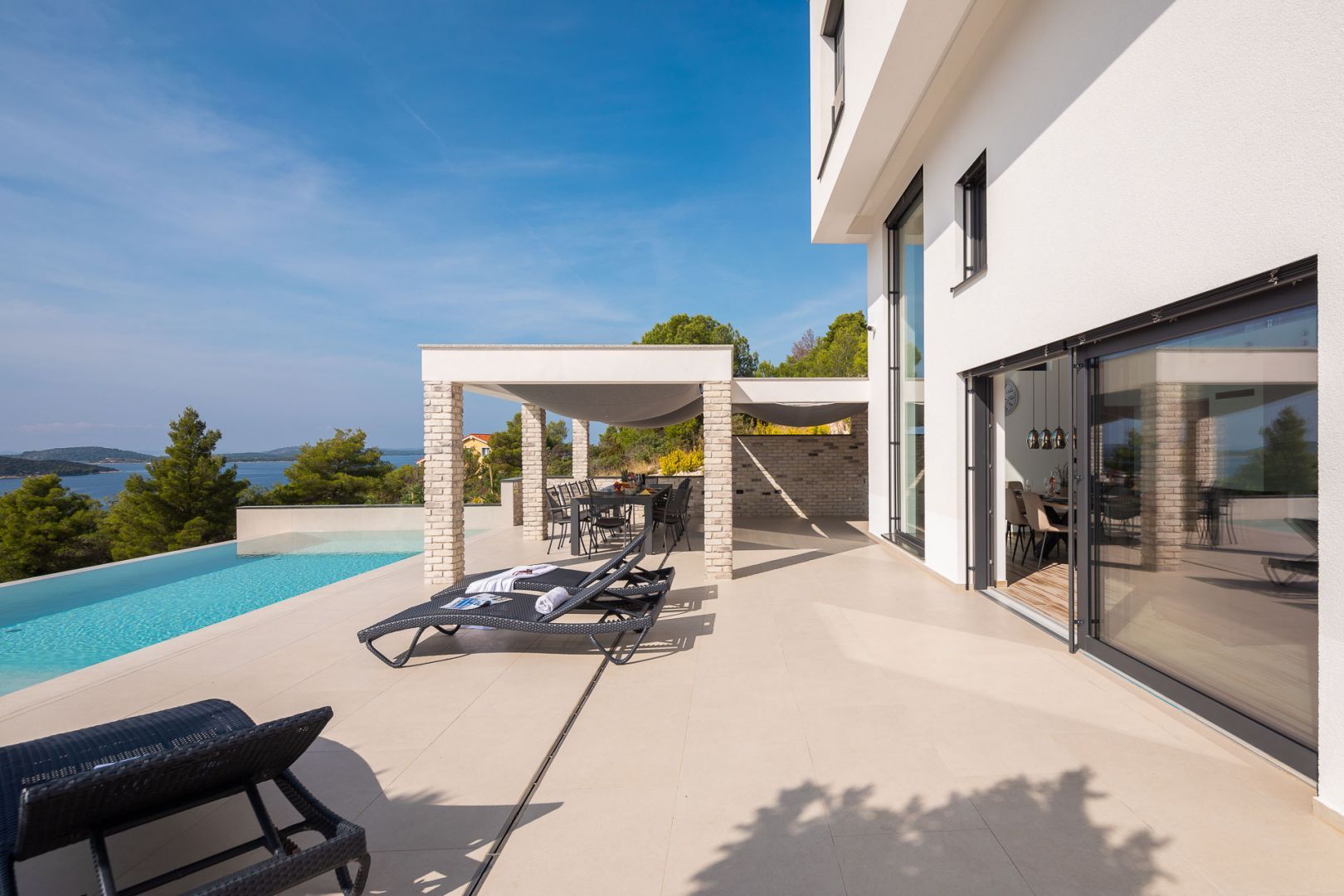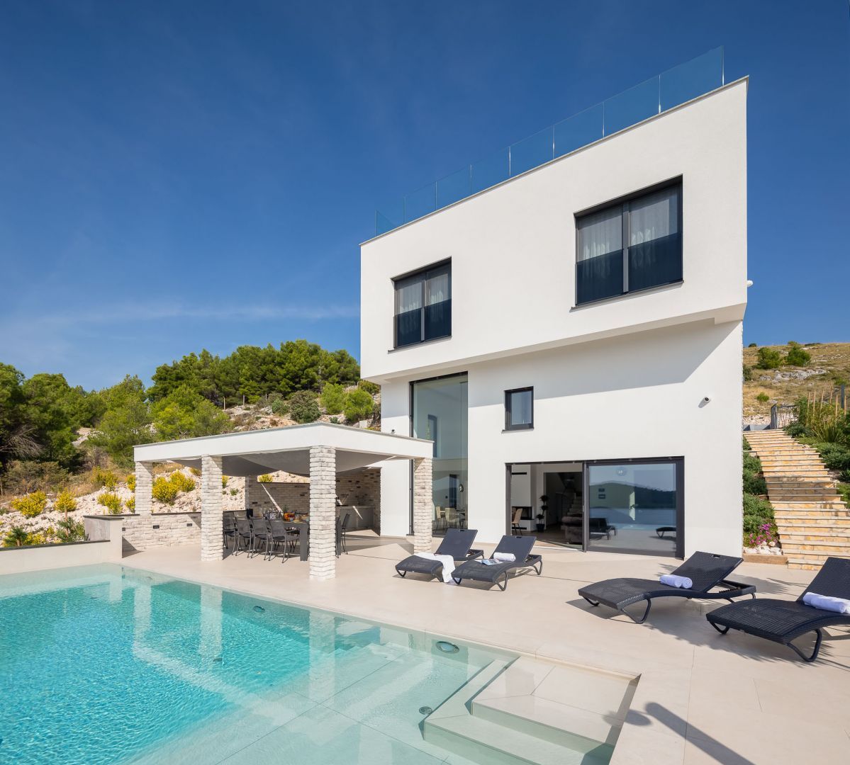 DALMATIEN, ŠIBENIK - Luxusvilla mit Swimmingpool, Fußballplatz und Sauna Wir präsentieren stolz diese äußerst luxuriöse Familienvilla in einer der luxuriösesten Siedlungen im südlichen Teil der dalmatinischen Küste. Es geht darum, sonnenverwöhnt und mit viel Grün geschmückt zu sein. Nur wenige Autominuten oder zu Fuß vom Zentrum und den wunderschönen Stränden entfernt liegt diese unumgängliche Villa, die jede Aufmerksamkeit wert ist. Was dieses Anwesen von allen anderen unterscheidet, ist die Tatsache, dass es von Anfang an als private Oase der Ruhe für die Bedürfnisse des Eigentümers und seiner Familie gebaut wurde, was gleichzeitig die hohe Qualität aller durchgeführten Arbeiten bestätigt Qualitätsniveau aller verwendeten Materialien, äußerst wertvolle und einzigartige Möbel sowie die Gestaltung des Innenraums mit dem Innenhof der Villa. Ziel war es, in jedem Raum der Villa ein Höchstmaß an Komfort und Funktionalität zu gewährleisten. Zusätzlich zu allem, was oben erwähnt wurde, wurde die Lage der Villa sorgfältig ausgewählt, um den von den Eigentümern angestrebten Bedürfnissen nach Ruhe, Privatsphäre und Luxus gerecht zu werden, während sie darüber hinaus das Leben und den Aufenthalt in der Villa einfach macht Nähe der notwendigen Einrichtungen wie Geschäfte, Restaurants, Schulen, zahlreiche Spaziergänge, der Strand und dergleichen. Begleiten Sie uns in der Geschichte dieser seltenen und wertvollen Gelegenheit, einer der attraktivsten Villen an diesem Teil der Küste. BESCHREIBUNG DER IMMOBILIE: Nur 180 m vom angelegten Strand und dem kristallklaren Meer entfernt befindet sich diese hochwertige freistehende Familienvilla mit insgesamt 360,75 m² Wohnfläche, die sich über zwei Etagen erstreckt und auf einem angelegten und angelegten Grundstück liegt gepflegte Grundstücke. Beim Betreten der Villa werden wir zunächst von einer anmutigen und luxuriösen Lobby voller Tageslicht mit Platz für eine Garderobe begrüßt, die uns dann in den als offenen Raum gestalteten Wohnbereich im Erdgeschoss führt. In diesem Teil der Villa dominiert ein komfortables und geräumiges Wohnzimmer, das mit großen Glaswänden geschmückt ist, mit deren Hilfe der Raum mit Tageslicht durchflutet wird, was ein Gefühl von Luxus, Wärme des Raumes und seiner Luftigkeit vermittelt. Ebenso eröffnet sich durch die gleichen Glaswände ein direkter Zugang zur überdachten Sommerterrasse und ein Blick auf den größeren Pool. Neben dem Wohnzimmer gibt es auch einen Essbereich, der groß genug für die ganze Familie ist, sowie eine etwas separate und etwas privatere, moderne, helle Küche, die mit erstklassigen italienischen Elementen ausgestattet ist und exklusiv für diese Villa ausgewählt wurde. Im zweiten Teil des Erdgeschosses gibt es ein zusätzliches Wohnzimmer und einen Kamin. Eine Innentreppe führt in die mittlere Etage, wo sich ein großzügiger Fitnessraum für alle Sportbegeisterten und ein Billardraum zum Entspannen mit Freunden und Familie befinden. Im zweiten Teil gibt es außerdem einen Spa-Bereich zum Entspannen, der über eine Sauna und ein eigenes Badezimmer verfügt. Durch den Flur erreichen wir den Teil, in dem sich ein Heizraum, ein Abstellraum und eine Waschküche befinden. Eine elegante Innentreppe führt in die erste Etage der Villa, wo sich vier geräumige Schlafzimmer befinden, von denen jedes über ein eigenes Bad verfügt, während das Hauptschlafzimmer über eine eigene Terrasse verfügt. Darüber hinaus bietet jedes Schlafzimmer einen unglaublichen Panoramablick auf das endlose Meer und die dalmatinischen Inseln. Und so nehmen wir die Innentreppe zum Dach, wo sich ein luxuriöser Whirlpool befindet, wo Sie die makellose Aussicht bei einem Glas Ihres Lieblingssekts genießen können. Es handelt sich um eine Villa, die ausschließlich für die Bedürfnisse des Eigentümers gebaut und mit Hilfe von Top-Designern so dekoriert wurde, dass die Villa Luxus ausstrahlt und zeitlos bleibt. Daher achteten die Eigentümer absolut auf jedes Detail und legten gleichzeitig größten Wert auf den Komfort und die Funktionalität jedes Zimmers. Ebenso legten die Eigentümer großen Wert auf den weitläufigen Garten, der vollständig eingezäunt und vor jedermanns Sicht verborgen ist und ein Höchstmaß an Privatsphäre und Ruhe bietet. Der Innenhof der Villa ist auf luxuriöseste Weise dekoriert und verfügt über einen privaten Spielplatz und einen Park für Kinder, während alle im Innenhof der Villa befindlichen Inhalte durch malerische Wege verbunden sind. So befindet sich im Garten ein großzügiger Swimmingpool mit Liegewiese, und ein besonderes Detail des Pools ist, dass er durch seine Lage auf dem Feld, die Beschaffenheit des Feldes und den Blick Richtung Meer ein Gefühl von Entspannung vermittelt endlose Verbindung mit dem Meer und den Inseln. In den warmen Sommermonaten haben Sie die Möglichkeit, Ihre Zeit in einer separaten, größeren Sommerküche mit einem echten istrischen Kamin und einer funktionalen Küche sowie Sitzgelegenheiten zu verbringen. Außerdem gibt es im Garten eine zusätzliche Wohnung von 49,50 m2, die aus einem Wohnzimmer, einer Küche und einem Esszimmer besteht. Im zweiten Teil gibt es ein Schlafzimmer und ein Badezimmer. WEITERE INFORMATIONEN; *Solarkraftwerk *Der Hof und die Umgebung verfügen über eine indirekte Beleuchtung, die ferngesteuert werden kann *Das gesamte Gebäude verfügt über Fußbodenheizung und -kühlung, jedes Zimmer verfügt über einen eigenen Thermostat (mit der Möglichkeit der Fernbedienung) und eine Wärmepumpe *Alle Zimmer verfügen über Klimaanlagen *Das Gebäude verfügt über einen Wasserenthärter im Heizraum, das Wasser im Haus ist kalkfrei *Alle Möbel sind maßgefertigt *Die Anlage und die Umgebung sind vollständig mit Videoüberwachung abgedeckt *Die Anlage ist mit einem Paradox-Alarmsystem ausgestattet *Der Pool wird durch eine eigene Wärmepumpe, Überlauf (unendlich) beheizt und für