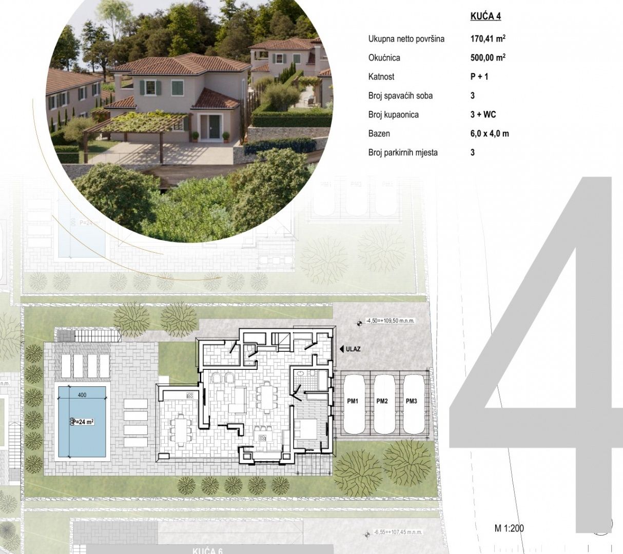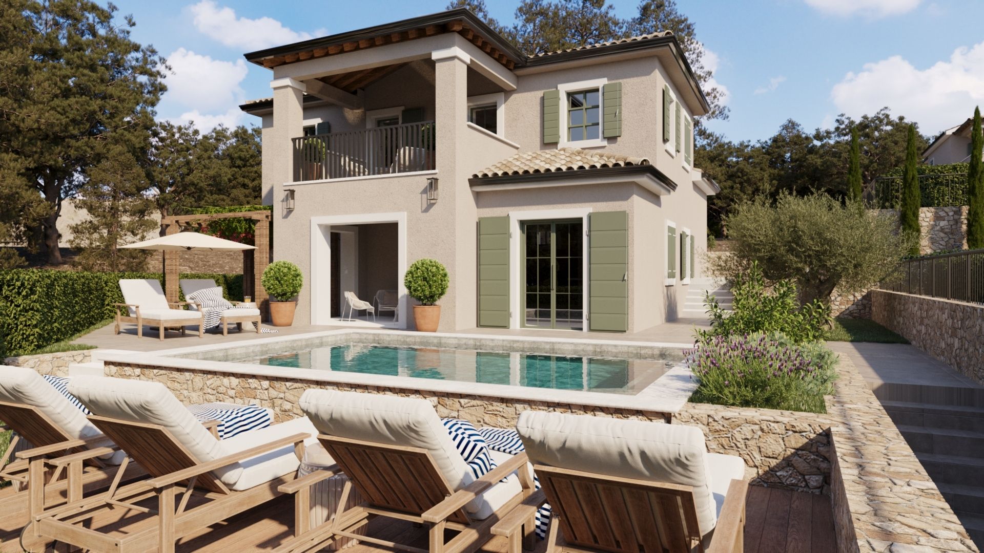 INSEL KRK, DOBRINJ – Neue Villa mit Pool, Holzpergolen und mediterranem Garten Wir präsentieren Ihnen eine exklusive Gelegenheit auf der Insel Krk! Diese moderne, freistehende Villa befindet sich in einem ruhigen Dorf nahe Šilo, innerhalb einer luxuriösen Anlage mit sechs Villen. Sie ist ideal für Käufer, die mediterrane Tradition, modernes Design und absolute Privatsphäre suchen. Die Villa ist als modernes, zweistöckiges Haus mit optimaler Raumausnutzung konzipiert, nach Süden ausgerichtet und dank großer Glasfronten lichtdurchflutet. Die funktional gestaltete Raumaufteilung umfasst eine Fläche von 170,41 m²: - Eingangsbereich: überdachter Außeneingang, Eingangshalle, Schlafzimmer mit Bad, Gäste-WC - Wohnbereich: großzügiges Wohnzimmer mit Essbereich und Küche sowie Zugang zu einer überdachten Terrasse - Schlafbereich im Obergeschoss: zwei Schlafzimmer, jeweils mit eigenem Bad und Zugang zu einer überdachten Terrasse, Waschküche Ein Zimmer verfügt über einen zusätzlichen Raum, der als Arbeits- oder Ankleidezimmer genutzt werden kann. - Zusätzlicher Außenlagerraum/Technikraum Garten: 500 m² Er ist im authentischen mediterranen Stil mit Steinelementen und sorgfältig geplanter Beleuchtung gestaltet. Im Zentrum befindet sich ein privater 24 m² großer Pool, ideal für sommerliche Erfrischung. Neben einem Grillplatz und gepflegten Grünflächen bietet die Villa drei private Parkplätze. Stein und Holz prägen die Fassade und sorgen für natürliche Isolierung und mediterranen Charme. Massive Holzbalken auf den Terrassen spenden natürlichen Schatten und schaffen die typische mediterrane Atmosphäre. Hochwertige Ausstattung: - Heizung und Kühlung: Fußbodenheizung im gesamten Haus, Klimaanlage in allen Räumen. - Sicherheit: Alarmanlage, Videoüberwachung und Sicherheitstüren. - Materialien: Hochwertige PVC-Fenster und -Türen, hochwertige Keramik und Sanitärkeramik namhafter Hersteller. Die Villa wird schlüsselfertig verkauft (geplante Fertigstellung 2027). Vorteile der Lage und Investition. Nur 2700 Meter vom Meer entfernt bietet diese Villa Ruhe und Erholung fernab vom Trubel der Touristen und ist gleichzeitig eine hervorragende Investitionsmöglichkeit im Bereich der Ferienvermietung. Da die Mehrwertsteuer im Preis enthalten ist, entfällt für den Käufer die Grunderwerbsteuer. Die Architektur vereint traditionelles Bauen mit modernem Design. Tradition und moderner Luxus – hier vereinen sich Tradition und Moderne perfekt. Nur einen Schritt von Ihrem neuen Zuhause entfernt, in dem jedes Detail sorgfältig ausgewählt wurde, um Ihnen ein einzigartiges und unvergessliches Wohnerlebnis zu bieten. Kontaktieren Sie uns vertrauensvoll und vereinbaren Sie Ihren persönlichen Besichtigungstermin. ***