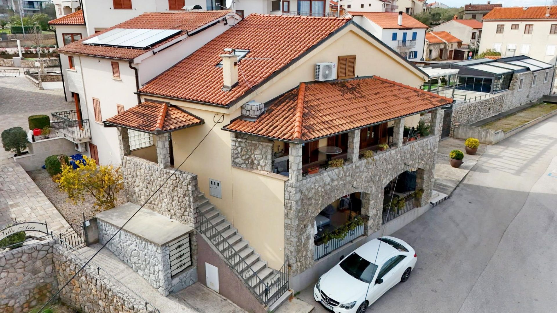 INSEL KRK, MALINSKA – Haus in erster Reihe zum Meer Dieses Anwesen besticht durch seine exzellente Lage, nur wenige Meter vom Meer entfernt. Es erstreckt sich über drei Etagen und verfügt über zwei Wohnungen. Im Erdgeschoss befindet sich eine Einzimmerwohnung mit Bad, Küche und Wohnzimmer, von dem aus man auf eine große Terrasse mit freiem Blick auf das Meer und den Hafen gelangt. Im ersten Obergeschoss befindet sich eine Maisonette-Wohnung mit Bad, Küche, Esszimmer, Wohnzimmer und einer ca. 20 m² großen Terrasse mit herrlichem Meerblick. Im Dachgeschoss befinden sich zwei Schlafzimmer und ein Badezimmer. Für Heizung und Kühlung sorgen insgesamt vier Klimaanlagen. Das Haus verfügt über drei Abstellräume und zwei Parkplätze. MALINSKA und die umliegende Region werden Dubašnica genannt und liegen im Westen der Insel Krk. Bis ins 15. Jahrhundert war Dubašnica, wie auch das südlich angrenzende Gebiet bis fast zur Stadt Krk, nahezu unbewohnt. Der Name der Gegend leitet sich von der Eiche ab, da sie von dichten Wäldern und Weiden mit einigen Ackerflächen geprägt ist. Dubašnica gehörte seit dem 12. Jahrhundert größtenteils zum Gebiet der Omišalj, ein Teil davon war jedoch auch im Besitz der Einwohner von Krk. Malinska, das Zentrum von Dubašnica, war einst ein Inselhafen für den Holzexport und ein beliebtes Reiseziel des Wiener Adels. Im 15. Jahrhundert wird der Ort als guter Ankerplatz erwähnt, wo Schiffe bei starkem Wind, insbesondere Südwind, Schutz suchten. Mit dem Aufkommen der Dampfschiffe im Jahr 1866 wandelte sich Malinska dank seines milden Klimas mit rund 260 Sonnentagen im Jahr von einem Holzexporthafen zu einem Kurort. Heute zählt Malinska zu den beliebtesten Inselreisezielen Kroatiens und ist bekannt für seine zahlreichen Strände, die gut ausgebaute Hotellerie und den Familientourismus. Unweit von Malinska liegt Porat, ein ruhiger Ort, dessen Bevölkerung einst vom Fischfang lebte und heute vom Tourismus geprägt ist. Der Name leitet sich vom italienischen Wort „porto“ (Hafen) ab. Die Strände von Malinska und der Insel Krk zählen zu den schönsten in Kroatien. Ein Vorteil der zerklüfteten und weitläufigen Küste Malinskas ist, dass Strände nie weit entfernt sind. Die abwechslungsreiche Küste bietet eine große Auswahl an Stränden: von Fels-, Sand- und Kieselstränden bis hin zu versteckten Buchten. Strände für Kinder, für Menschen mit Behinderung, Nichtschwimmer oder Senioren, Hundestrände, Strände für alle, die natürlichen Schatten und Parkplätze suchen, Strände für Sportbegeisterte und Strandbars, aber auch einen inoffiziellen FKK-Strand – Malinska hat für jeden etwas zu bieten. Die Strände der Gemeinde Malinska-Dubašnica sind durch zahlreiche Promenaden miteinander verbunden und bilden ein einzigartiges Naturparadies. Die Strände reichen von angelegten Betonplateaus über wilde, felsige Einstiege ins Meer bis hin zu vielen versteckten, ruhigen Buchten, die einen Besuch wert sind. Sie erstrecken sich entlang des westlichen Teils der Insel Krk: Sie beginnen an der Paradiesstraße zwischen Malinska und Njivice und enden hinter dem romantischen Städtchen Porto.