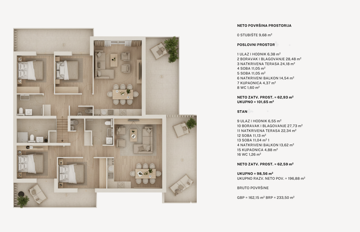 INSEL PAG, JAKIŠNICA, Luxuswohnung in einem hochwertigen Neubau Wir verkaufen diese hervorragende 2-Zimmer-Wohnung in einem luxuriösen Neubau eines bekannten Investors mit nur sechs Wohneinheiten. Wohnung S-6 im Gebäude A, im zweiten Stock, bestehend aus Eingangshalle, Gästetoilette, offenem Wohnbereich mit Küche und Esszimmer mit Zugang zu einer geräumigen überdachten Terrasse, zwei Schlafzimmern, die sich ebenfalls eine überdachte Terrasse teilen. Dieses exklusive Projekt mit sechs Wohneinheiten auf der Insel Pag in der Stadt Jakišnica ist eine ideale Gelegenheit für alle, die nach Wohnraum in Top-Design und Qualität oder einer Kapitalanlage zur Miete in phänomenaler Lage suchen. Baustandard: Die Wohnungen werden unter Verwendung hochwertiger Materialien gebaut, mit anspruchsvollem Design, großen Glasflächen, die viel natürliches Licht hereinlassen und alle modernen Anforderungen für ein komfortables Leben erfüllen. Eigenschaften: Großzügige Innenräume, offene Wohnzimmer mit Küchen, geräumige Wohn- und Esszimmer und gemütliche private Schlafzimmer. Überlegenes Design, modernes und funktionales Design mit erstklassiger Ausstattung, Fußbodenheizung, Klimaanlage. Terrassen und Wohnzimmer: Jede Wohnung hat eine eigene Terrasse mit wunderschönem und freiem Blick aufs Meer, und die Wohnungen im Erdgeschoss haben einen eigenen Swimmingpool und einen Innenhof mit Garten. Materialien und Ausstattung der Wohnungen: Keramik, Bodenbeläge: Durchgefärbte Keramik Florgres Industrial Ivory in den Maßen 60 x 120 cm für Badezimmer und Böden in einer milden Betonimitation, ideal für alle Kombinationen. Durchgefärbte Keramik Ceramica Fioranese Icciottoli Sabbia in Beige in den Maßen 60 x 120 cm auf Terrassen mit Anti-Rutsch-Beschichtung R 11. Top-Badezimmerartikel: Spülrandloses WC Laufen PRO mit Slow-Flow-System, Unterputzspülkasten GROHE RAPID. Unterputz-Duschset Hansgrohe mit Duschkopf, Umsteller, Duschkopf mit drei Funktionen. Top-Badezimmerartikel: Duschkabinen Aquaestil Artego mit minimalen Profilen, 8 mm, transparentem Glas und Antikalkbeschichtung. Waschbecken Kolpa San aus Sanitärkeramik mit zwei Schubladen mit Soft-Close-Funktion und Spiegel. Tischlerei: Moderne Aluproof-Aluminium-Schiebetüren und -Fenster mit Rollläden. Dierre Hirby, moderne einbruch- und feuerfeste Eingangstüren mit Code.