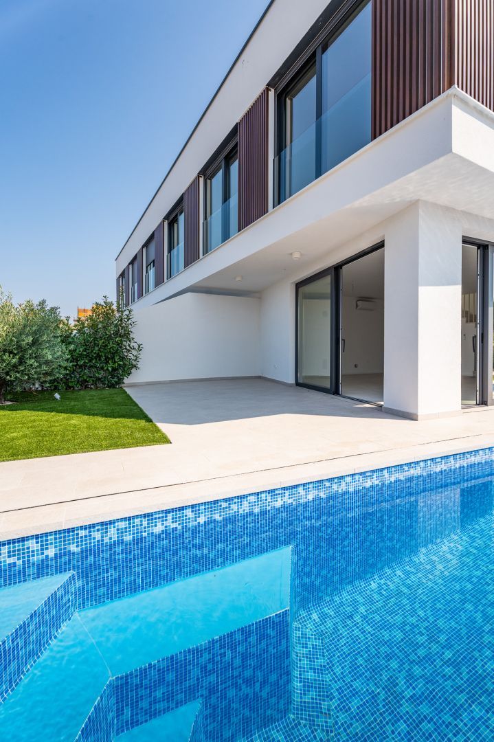 INSEL PAG, MANDRE – Luxuriöse Reihenvilla Villa 1 erstreckt sich über zwei Etagen mit einer Gesamtfläche von 101,86 m². Im Erdgeschoss befinden sich ein geräumiges Wohnzimmer mit Esszimmer, moderner Küche und Badezimmer. Im ersten Stock befinden sich zwei Hauptschlafzimmer mit Badezimmern und Zugang zu einer Terrasse mit Panoramablick. Das dritte Schlafzimmer ist etwas kleiner. Geheizt und gekühlt wird über Inverter-Klimaanlagen, jeweils in einem eigenen Raum. Alle Räume sind mit Fußbodenheizung ausgestattet, und im Wohnzimmer befindet sich ein Kamin. Zur Villa gehören drei Parkplätze. Jedes Zimmer strahlt dank sorgfältig ausgewählter Materialien und hochwertiger Verarbeitung Eleganz und Komfort aus. Besonderes Augenmerk wird auf das Äußere gelegt – die Villa verfügt über einen privaten, 21,25 m² großen Pool an der Seite, eine angelegte Sonnenterrasse und einen Garten, die eine perfekte Oase zum Entspannen und Genießen des mediterranen Lebensstils bilden. In Mandre finden Sie eine idyllische Atmosphäre, ideal für einen Familienurlaub und um dem Alltag zu entfliehen. Genießen Sie den wunderschönen Blick auf die Inseln Olib und Silba sowie die nahegelegenen Inselchen Maun und Škrda. Entspannen Sie an den über 3 km langen, mit der Blauen Flagge ausgezeichneten Stränden und tauchen Sie ein in das kristallklare Meer. Wenn Sie die Umgebung erkunden möchten, erreichen Sie die historische Stadt Pag (17 km), die ACI Marina Šimuni (4 km) und den berühmten Strand Zrće (7 km). Der nächstgelegene Flughafen ist der Flughafen Zadar, 70 km vom Apartment entfernt. Diese Immobilie ist ideal für alle, die Luxus, Privatsphäre und natürliche Schönheit kombinieren möchten, und stellt eine hervorragende Investition für touristische Zwecke oder als Ferienhaus dar.