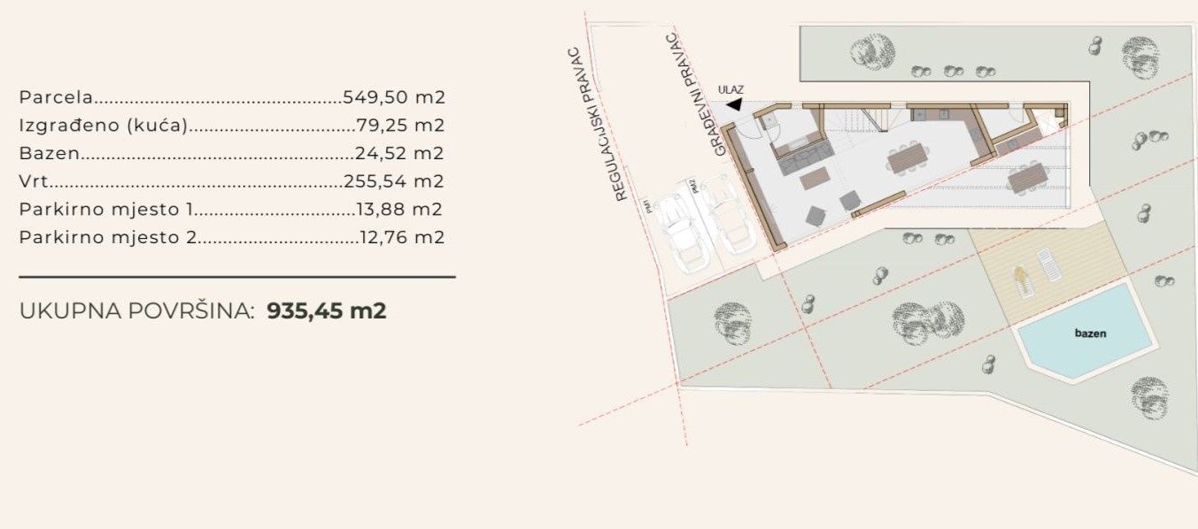 ISTRIEN, LABIN – Grundstück mit Bebauungsplan An der Südostküste Istriens, wo grüne Hügel auf das Meer treffen und Natur und Kulturerbe sich vereinen, liegen zwei Städte ähnlicher Größe mit unterschiedlichem, aber sich ergänzendem Charakter: Labin und Rabac. Das malerische Städtchen Labin erhebt sich auf einem 320 Meter hohen Hügel, nur vier Kilometer von den weißen Kieselstränden Rabacs entfernt. Geprägt von einer reichen Geschichte und dem Bergbau, der diese Region einst prägte, ist Labin, das kurzzeitig eine unabhängige Republik war, heute eine faszinierende Stadt der Gegensätze: Alt und Neu, Geschichte und Gegenwart, Tourismus und Kunst. In der Nähe von Labin steht ein Grundstück mit Bebauungsplan zum Verkauf. Das Grundstück befindet sich in einer ruhigen Siedlung mit Ferienhäusern und Einfamilienhäusern und bietet die perfekte Balance zwischen ländlicher Idylle und der Nähe zum Meer sowie städtischen Annehmlichkeiten. Das Katastergrundstück ist rechteckig, das Gelände ist flach und größtenteils unbebaut. Strom-, Wasser- und Telekommunikationsanschlüsse befinden sich in unmittelbarer Nähe. Das Grundstück verfügt über einen Bebauungsplan für ein Wohnhaus, dessen harmonische Architektur die Umgebung nicht beeinträchtigt und eine Synergie zwischen Natur und moderner Architektur schafft. Ein Nebengebäude – ein Swimmingpool – ist ebenfalls vorgesehen. Es handelt sich um ein komfortables Einfamilienhaus mit einer Wohneinheit auf zwei Etagen. Dank seiner Lage, der Aufteilung und der lückenlosen Eigentumsverhältnisse bietet dieses Grundstück eine hervorragende Gelegenheit, ein Familienhaus oder ein Ferienhaus zu errichten.