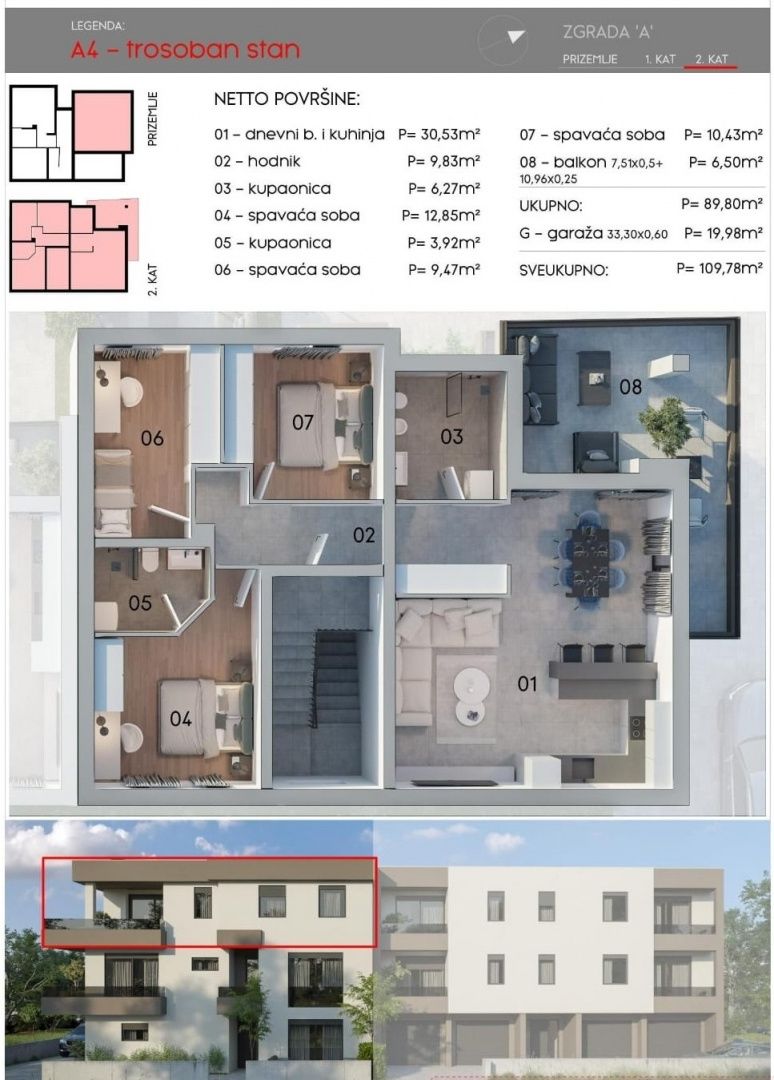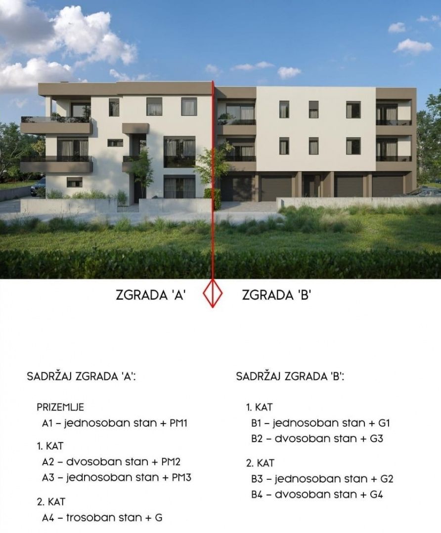 ISTRIA, PULA – Moderne 3-Zimmer-Wohnung mit Garage in einem Neubau in Monvidal In Monvidal, einem der begehrtesten Viertel von Pula, befindet sich diese moderne Wohnung in einem hochwertigen Neubauprojekt. Sie vereint zeitgenössische Architektur, Komfort und Funktionalität in ruhiger Lage und in unmittelbarer Nähe zu allen wichtigen Einrichtungen der Stadt Pula. WOHNUNGSBESCHREIBUNG: Die Wohnung liegt im 2. Obergeschoss eines Neubaus und hat eine Gesamtfläche von 109,78 m², wovon 89,90 m² auf den Wohnbereich entfallen. Die restlichen 19,98 m² bieten Platz für zwei private Garagenstellplätze (33,30 m² Bruttofläche x 0,60 Koeffizient). Beim Betreten der Wohnung empfängt Sie ein elegantes Foyer mit Garderobe, das in den zentralen Wohnbereich führt. Dieser Teil der Wohnung vereint eine moderne Küche mit Kochinsel, ein geräumiges Esszimmer für die ganze Familie und ein großzügiges Wohnzimmer zu einem fließenden und angenehmen Wohnbereich. Die Wohnung zeichnet sich durch viel Tageslicht aus, dank großer Glasfronten, die den Räumen ein großzügiges und warmes Ambiente verleihen. Vom Wohnzimmer gelangt man auf einen großen, überdachten Balkon mit Blick auf die Stadt und die umliegende Natur. Der private Bereich der Wohnung umfasst drei Schlafzimmer, zwei davon größer und eines etwas kleiner. Außerdem gibt es zwei moderne Badezimmer, eines davon als Gäste-WC in der Nähe des Wohnzimmers. Alle Badezimmer sind modern ausgestattet. Zur Wohnung gehört zudem eine private Garage mit 33,30 m² Bruttofläche im Erdgeschoss. Die Garage bietet ausreichend Platz zum Parken von Fahrzeugen sowie zusätzlichen Stauraum. ZUSÄTZLICHE INFORMATIONEN: Das Projekt befindet sich derzeit im Bau und wird voraussichtlich spätestens im Juni 2027 fertiggestellt. Besonders hervorzuheben sind: * Fußbodenheizung in allen Räumen (außer Schlafzimmern) * Klimaanlage zum Heizen und Kühlen * Hochwertige PVC-Fenster und -Türen mit elektrischen Jalousien * Sicherheitstür * Geplante hochwertige Keramikfliesen * 10 cm starke Fassadenwärmedämmung * Die Wohnung wird unmöbliert und schlüsselfertig verkauft * Eigentumsnachweis LAGEBESCHREIBUNG: Monvidal ist ein Stadtteil von Pula, der die Vorteile urbanen Lebens mit der Ruhe eines Wohngebiets verbindet. In unmittelbarer Nähe befinden sich Schulen, Hochschulen, Kindergärten, Geschäfte, Apotheken, öffentliche Verkehrsmittel und alles, was für eine hohe Lebensqualität das ganze Jahr über notwendig ist. Die Nähe zum Stadtzentrum und die gute Verkehrsanbindung steigern den Wert dieser Lage zusätzlich – sowohl als Wohnimmobilie als auch als Kapitalanlage. Bei weiteren Fragen, für weitere Informationen oder zur Vereinbarung eines Besichtigungstermins der Wohnung und des Projekts kontaktieren Sie uns bitte jederzeit.