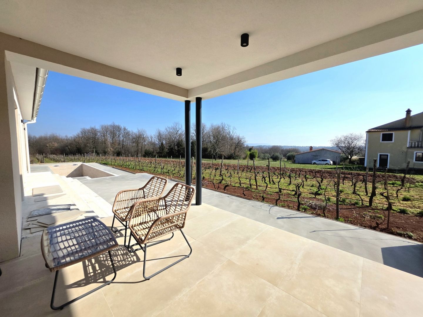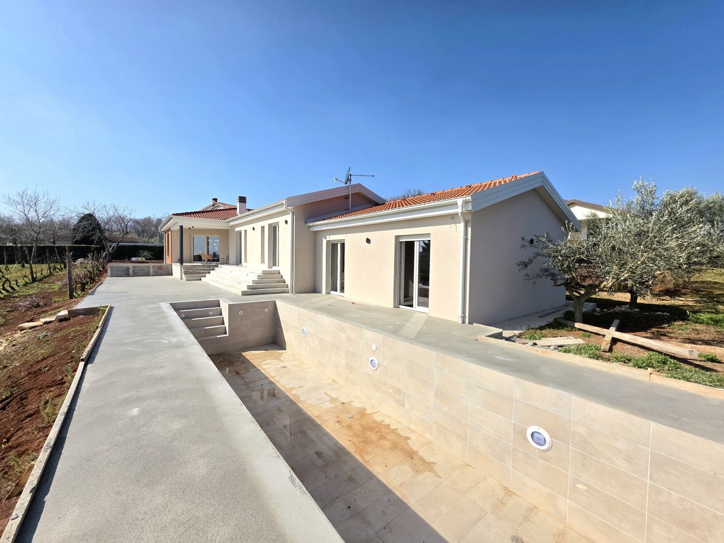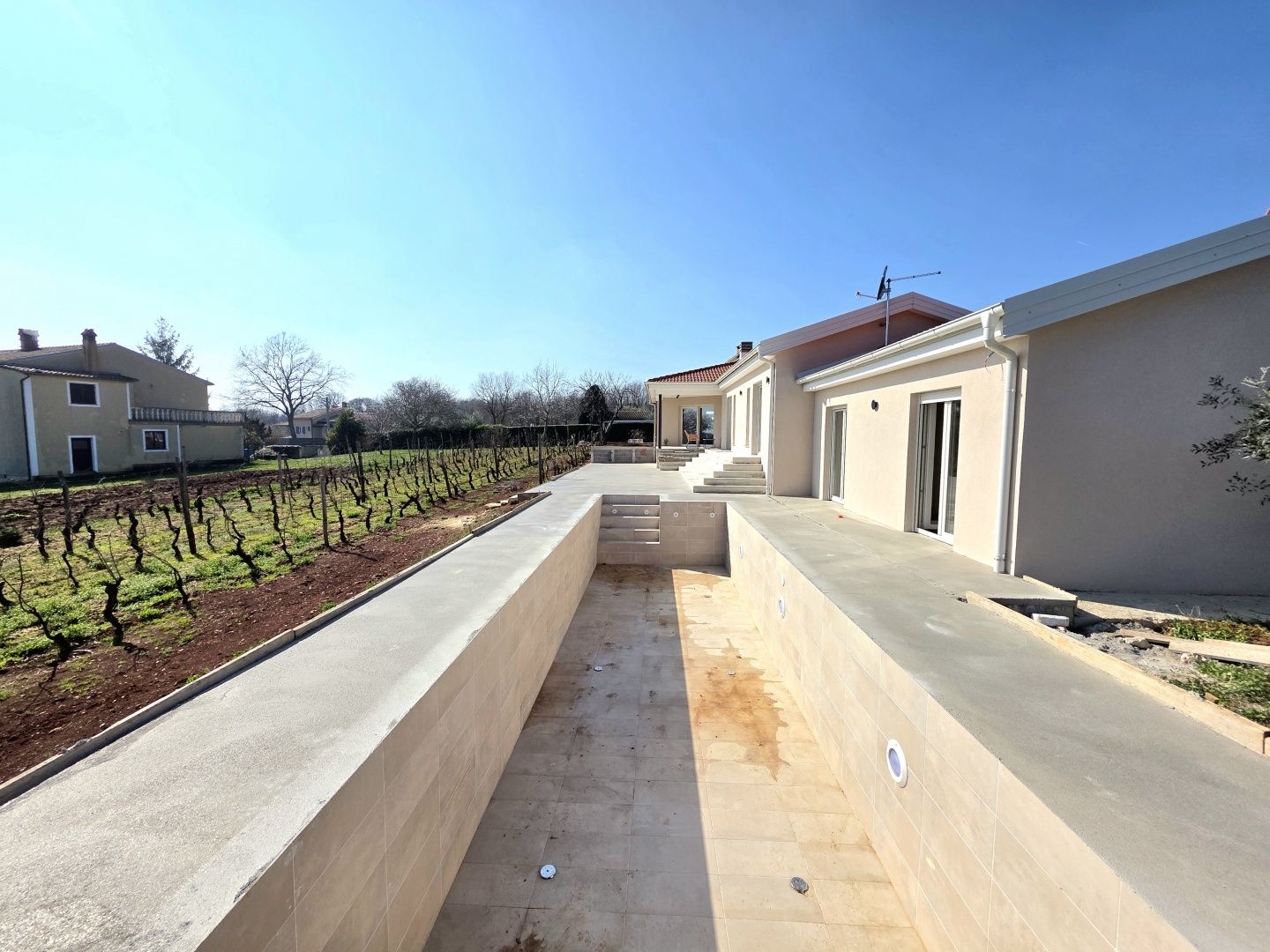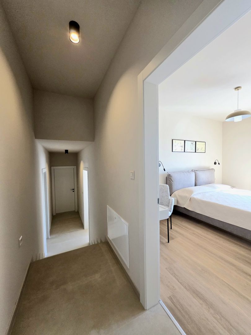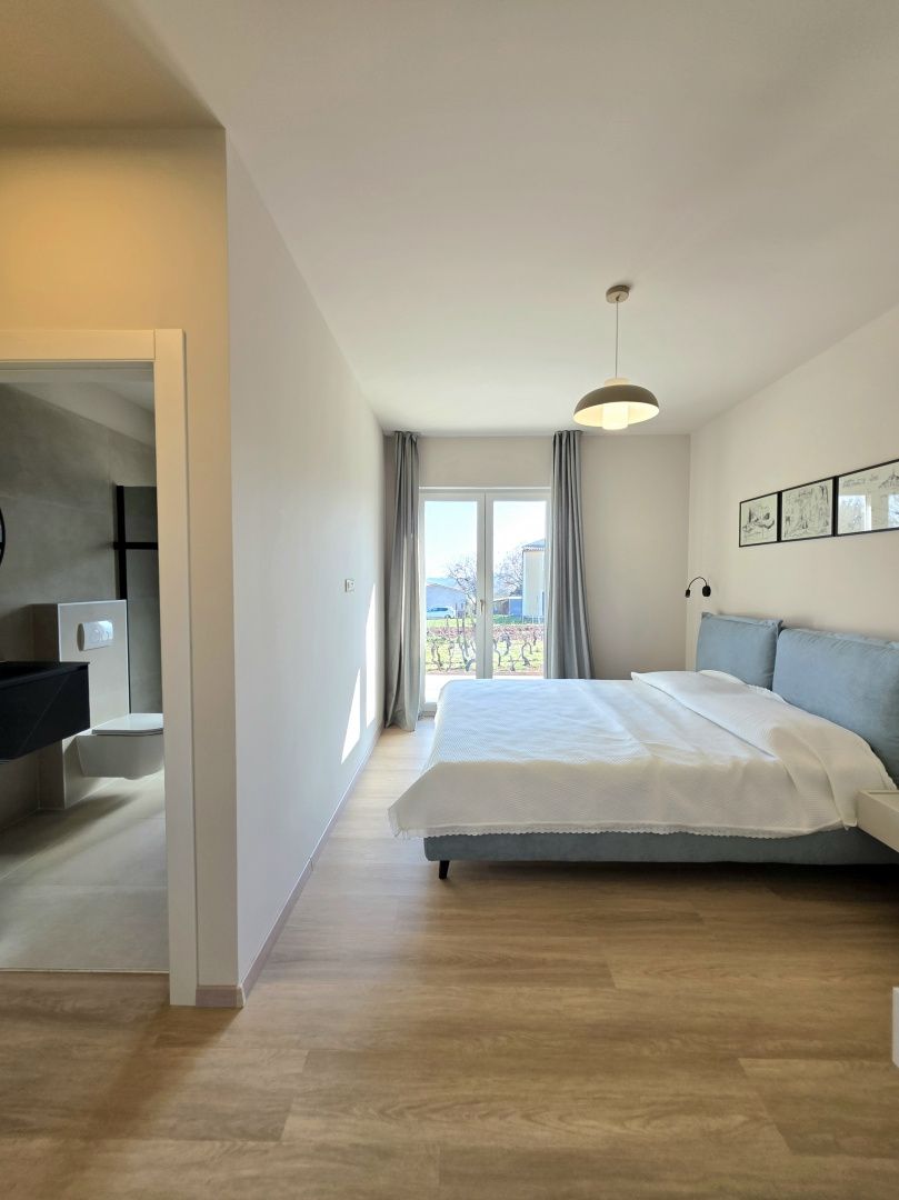 ISTRIEN, BARBAN – Neue Erdgeschossvilla inmitten von Weinbergen, Privatsphäre, Eleganz und absolute Ruhe zur Langzeitmiete In einer ruhigen und gepflegten Siedlung nahe Barban, umgeben von Grün und gepflegten Weinbergen, befindet sich diese neue, private Erdgeschossvilla. Sie vereint modernen Luxus mit authentischem istrischem Ambiente. Das 2026 erbaute Anwesen ist ideal für alle, die absolute Privatsphäre, Großzügigkeit und höchste Lebensqualität suchen – ob für das Familienleben oder als exklusive Kapitalanlage. HAUSBESCHREIBUNG – Ein lichtdurchfluteter Raum inmitten der Natur Beim Betreten der Villa öffnet sich ein beeindruckender Wohnbereich im offenen Stil. Ein komfortables Wohnzimmer, eine etwas abgetrennte, moderne und voll ausgestattete Küche mit eigenem Abstellraum sowie ein geräumiges Esszimmer für die ganze Familie bilden ein harmonisches und funktionales Ensemble. Große Glaswände lassen die Grenzen zwischen Innen und Außen verschwimmen und verbinden den Innenraum mit einer überdachten Sommerterrasse, dem Swimmingpool und dem Garten. Der gesamte Wohnbereich ist lichtdurchflutet, und von fast jedem Winkel der Villa bietet sich ein beruhigender Blick auf den gepflegten Weinberg, der das Anwesen umgibt. Neben dem Wohnbereich befinden sich ein Gäste-WC und ein Technik-/Abstellraum. Der Flur vom Wohnbereich führt in einen separaten, intimen Teil der Villa mit vier Schlafzimmern. Zwei Zimmer verfügen über ein eigenes Bad, die anderen beiden teilen sich ein geräumiges Badezimmer. Ein besonderer Vorteil dieser Villa ist der direkte Zugang jedes Schlafzimmers zum angelegten Garten und zum Swimmingpool. So entsteht ein Gefühl von Hotelkomfort und gleichzeitig eine tiefe Verbundenheit mit der Natur. Eines der Zimmer ist derzeit als Spielzimmer eingerichtet, kann aber problemlos an Ihre Bedürfnisse angepasst werden. BESCHREIBUNG DES GARTENS – Der Garten als Erweiterung des Wohnraums Der weitläufige und luftige Garten ist von den gepflegten Weinbergen der Eigentümer umgeben. Dies garantiert ein hohes Maß an Privatsphäre und einen ungestörten Ausblick ohne Befürchtungen zukünftiger Bebauung. Die Zufahrt zum Anwesen erfolgt über eine asphaltierte Straße. Am Eingang befinden sich zwei separate, überdachte Parkplätze. Das Herzstück des Gartens ist ein beeindruckender, 40 m² großer Salzwasserpool, der sich hinter der Villa befindet und maximale Ruhe und Privatsphäre bietet. Angrenzend an den Pool befinden sich eine überdachte Sommerterrasse, eine Außenküche und ein separater Bereich für einen Whirlpool – der perfekte Ort zum geselligen Beisammensein, für sommerliche Abendessen und zum Entspannen unter freiem Himmel. Der restliche Garten ist im mediterranen Stil mit sorgfältig ausgewählten Pflanzen und Bäumen gestaltet, während Rasenflächen ausreichend Platz zum Spielen für Kinder und zum Verweilen für Haustiere bieten. ZUSÄTZLICHE INFORMATIONEN: * Die Villa wird komplett möbliert vermietet, inklusive aller Möbel und Geräte. Die Inneneinrichtung besteht aus Designermöbeln, die speziell für dieses Anwesen angefertigt wurden und eine einzigartige Ästhetik mit maximaler Funktionalität vereinen. * Zu den technischen Annehmlichkeiten gehören Fußbodenheizung in allen Räumen sowie eine Klimaanlage zum Heizen und Kühlen in jedem Zimmer. Diese Villa ist die perfekte Wahl für alle, die modernen Luxus in authentisch istrischer Umgebung suchen, umgeben von Natur und dennoch in unmittelbarer Nähe zu allen Annehmlichkeiten des täglichen Bedarfs. Für weitere Fragen, Informationen oder zur Vereinbarung eines Besichtigungstermins kontaktieren Sie uns bitte jederzeit.