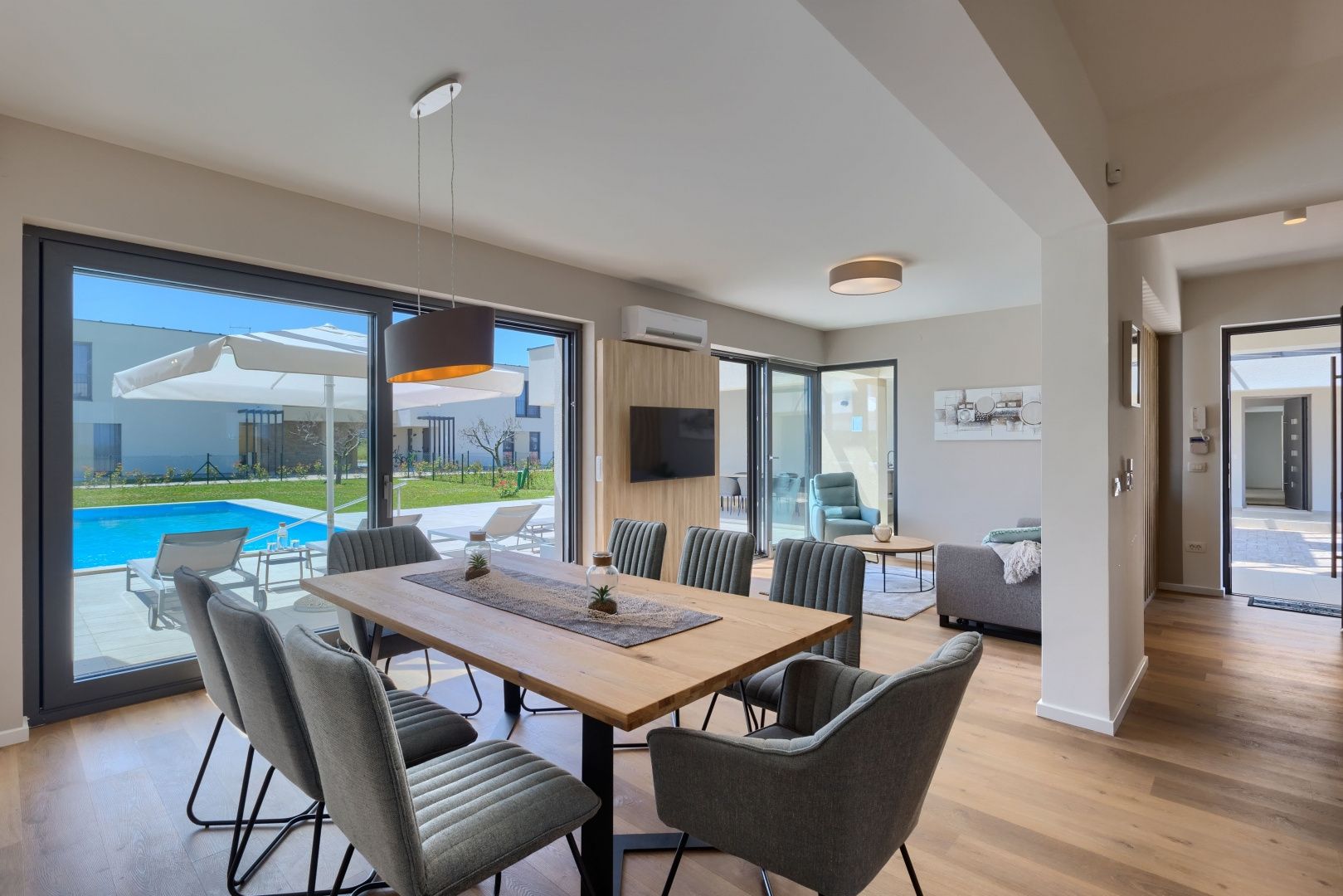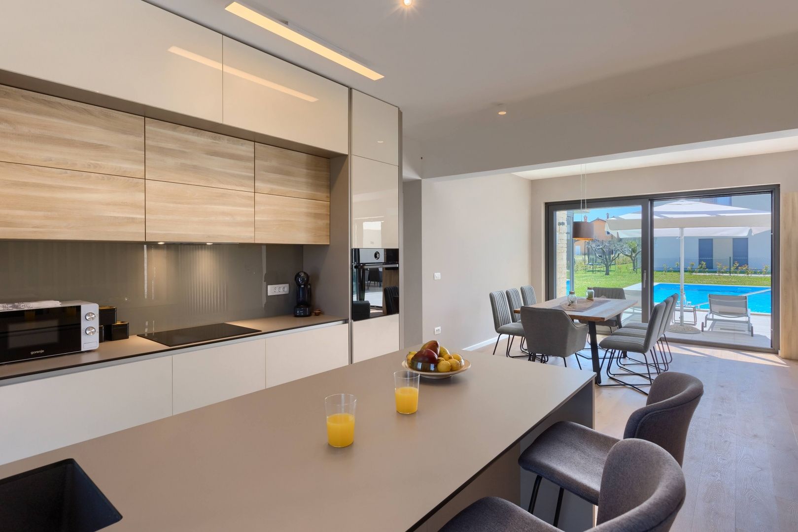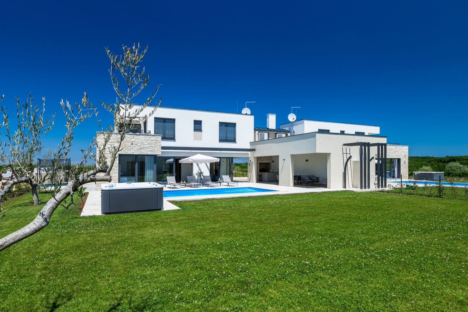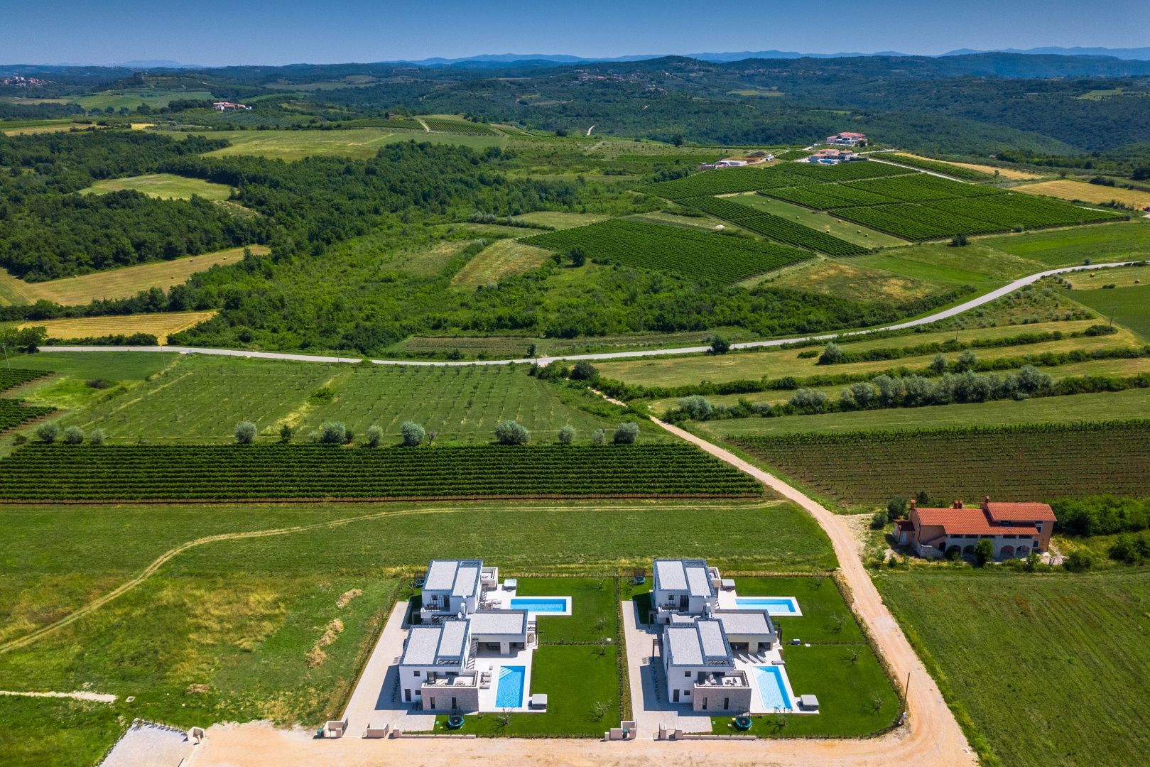 ISTRIEN, BRTONIGLA – Zwei luxuriöse Villen mit Pools in ruhiger Lage Brtonigla ist ein malerisches istrisches Städtchen im grünen Hinterland Westistriens, bekannt für seine erstklassigen Weine, Olivenöle und unberührte Natur. Die Kombination aus traditionellem istrischem Charme und hervorragender Verkehrsanbindung an das Meer, Novigrad, Umag und andere istrische Städte macht Brtonigla zu einem äußerst begehrten Wohnort, ideal für Urlaub und Immobilieninvestitionen. In einem ruhigen, naturnahen Dorf liegt dieses einzigartige Anwesen, bestehend aus zwei separaten Luxusvillen mit 264 m² bzw. 274 m² Wohnfläche. Beide Villen wurden mit Fokus auf Privatsphäre, Komfort und hohe Qualität gestaltet. Jede Villa erstreckt sich über zwei Etagen und bietet ein geräumiges und modern eingerichtetes Interieur. Das Erdgeschoss verfügt über eine Eingangshalle, ein großzügiges, offenes Wohnzimmer mit angrenzender, modern ausgestatteter Küche und Essbereich, einen Abstellraum, einen Technikraum, ein Gäste-WC mit Waschküche sowie ein Schlafzimmer mit eigenem Bad und direktem Zugang zur Terrasse und zum Pool. Im Obergeschoss befinden sich drei Schlafzimmer, jeweils mit eigenem Bad und Zugang zu einer privaten Terrasse. Beide Villen sind mit moderner Technik ausgestattet – Solaranlage, Fußbodenheizung, Klimaanlage in allen Räumen und einer kompletten Infrastruktur für energieeffiziente und wirtschaftliche Nutzung. Jede Villa liegt in einem weitläufigen und liebevoll gestalteten Garten. Der Außenbereich jeder Villa umfasst einen großen, beheizten Swimmingpool mit 40 m² Strandbereich, einen Whirlpool, eine Sonnenterrasse, einen Loungebereich und eine überdachte Sommerküche mit Grill – ideal zum geselligen Beisammensein und Entspannen im Freien. Diese Immobilie stellt eine äußerst seltene Gelegenheit auf dem Markt dar, da sie eine erstklassige Lage, luxuriöse Bauweise, einen funktionalen Grundriss und ein nachweisliches Investitionspotenzial vereint. Das Objekt ist bereits erfolgreich in der Ferienvermietung tätig und verfügt über hervorragende Bewertungen sowie ein etabliertes Geschäft, was dem zukünftigen Eigentümer eine sofortige Rendite ermöglicht. Ob Sie eine sichere Kapitalanlage, ein luxuriöses Privatgrundstück oder eine Kombination aus Eigennutzung und Ferienvermietung suchen – diese Immobilie im Herzen Istriens bietet all das und noch mehr.