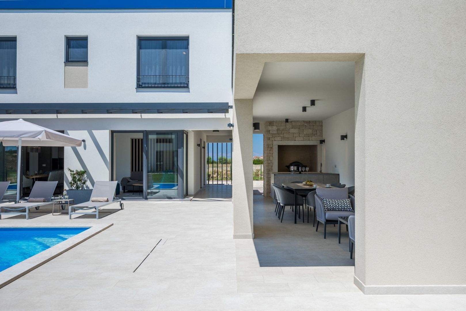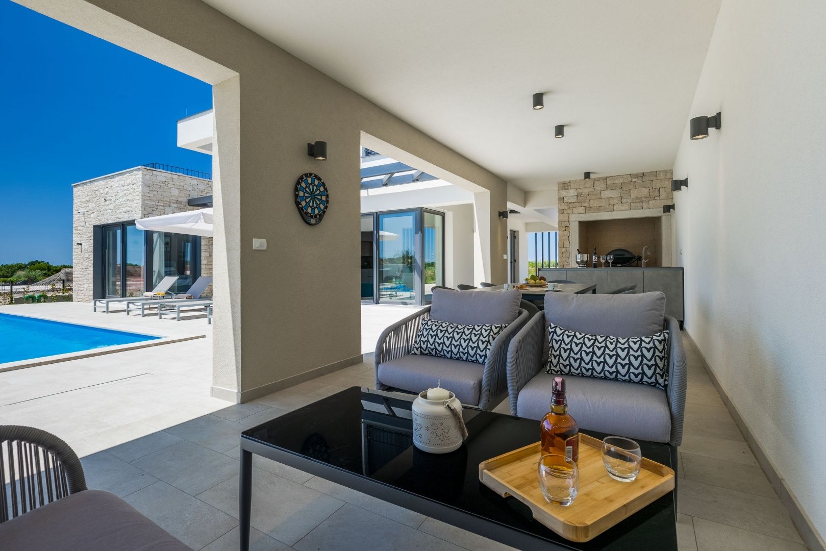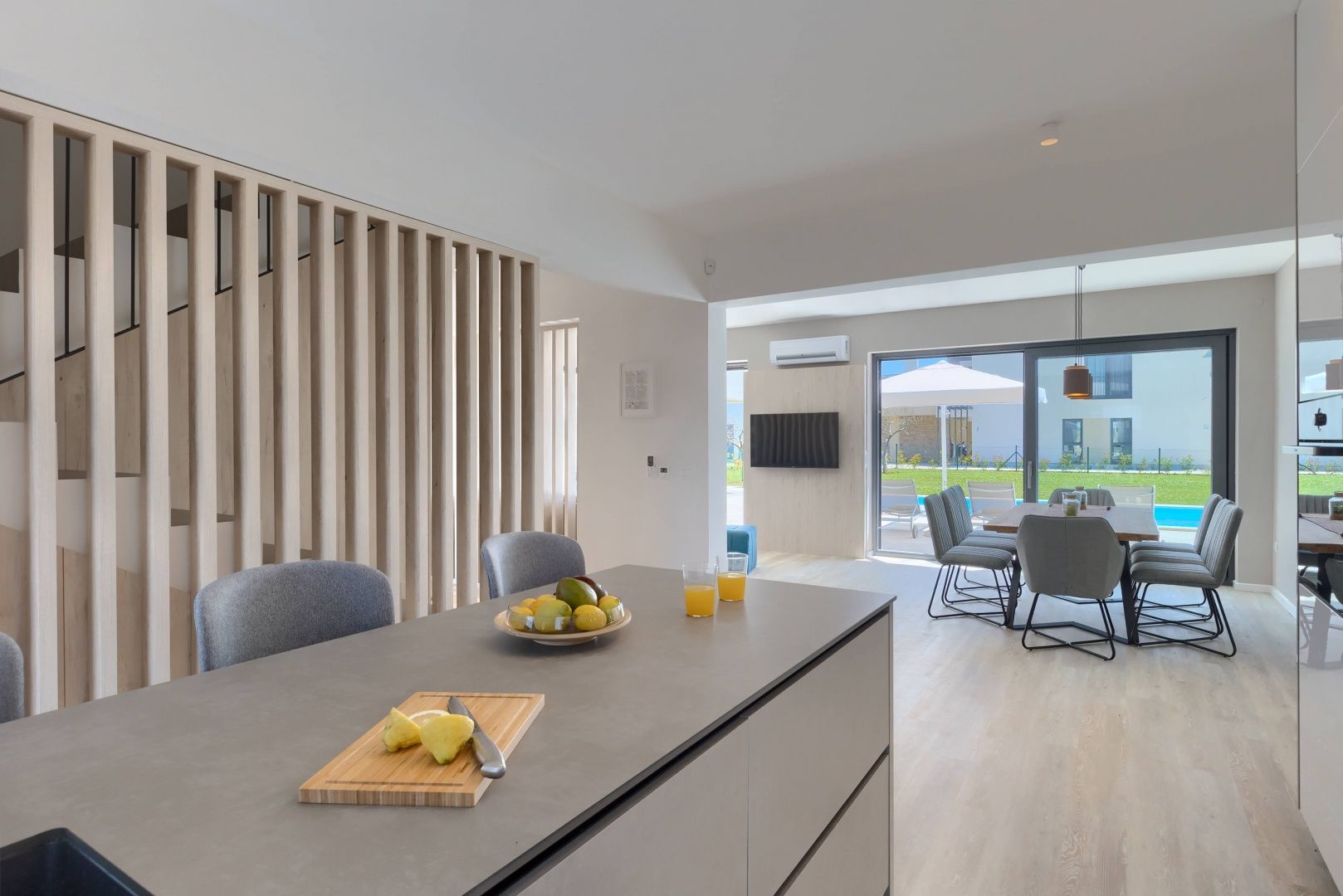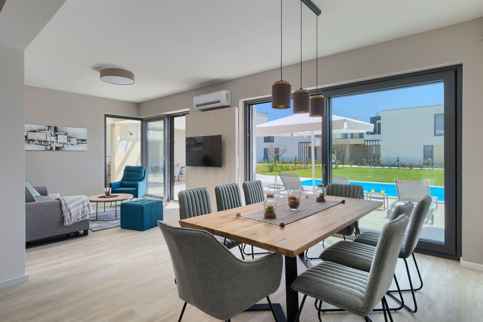 ISTRIEN, BRTONIGLA – Zwei luxuriöse Villen mit Pools in ruhiger Lage Brtonigla ist ein malerisches istrisches Städtchen im grünen Hinterland Westistriens, bekannt für seine erstklassigen Weine, Olivenöle und unberührte Natur. Die Kombination aus traditionellem istrischem Charme und hervorragender Verkehrsanbindung an das Meer, Novigrad, Umag und andere istrische Städte macht Brtonigla zu einem äußerst begehrten Wohnort, ideal für Urlaub und Immobilieninvestitionen. In einem ruhigen, naturnahen Dorf liegt dieses einzigartige Anwesen, bestehend aus zwei separaten Luxusvillen mit 264 m² bzw. 274 m² Wohnfläche. Beide Villen wurden mit Fokus auf Privatsphäre, Komfort und hohe Qualität gestaltet. Jede Villa erstreckt sich über zwei Etagen und bietet ein geräumiges und modern eingerichtetes Interieur. Das Erdgeschoss verfügt über eine Eingangshalle, ein großzügiges, offenes Wohnzimmer mit angrenzender, modern ausgestatteter Küche und Essbereich, einen Abstellraum, einen Technikraum, ein Gäste-WC mit Waschküche sowie ein Schlafzimmer mit eigenem Bad und direktem Zugang zur Terrasse und zum Pool. Im Obergeschoss befinden sich drei Schlafzimmer, jeweils mit eigenem Bad und Zugang zu einer privaten Terrasse. Beide Villen sind mit moderner Technik ausgestattet – Solaranlage, Fußbodenheizung, Klimaanlage in allen Räumen und einer kompletten Infrastruktur für energieeffiziente und wirtschaftliche Nutzung. Jede Villa liegt in einem weitläufigen und liebevoll gestalteten Garten. Der Außenbereich jeder Villa umfasst einen großen, beheizten Swimmingpool mit 40 m² Strandbereich, einen Whirlpool, eine Sonnenterrasse, einen Loungebereich und eine überdachte Sommerküche mit Grill – ideal zum geselligen Beisammensein und Entspannen im Freien. Diese Immobilie stellt eine äußerst seltene Gelegenheit auf dem Markt dar, da sie eine erstklassige Lage, luxuriöse Bauweise, einen funktionalen Grundriss und ein nachweisliches Investitionspotenzial vereint. Das Objekt ist bereits erfolgreich in der Ferienvermietung tätig und verfügt über hervorragende Bewertungen sowie ein etabliertes Geschäft, was dem zukünftigen Eigentümer eine sofortige Rendite ermöglicht. Ob Sie eine sichere Kapitalanlage, ein luxuriöses Privatgrundstück oder eine Kombination aus Eigennutzung und Ferienvermietung suchen – diese Immobilie im Herzen Istriens bietet all das und noch mehr.