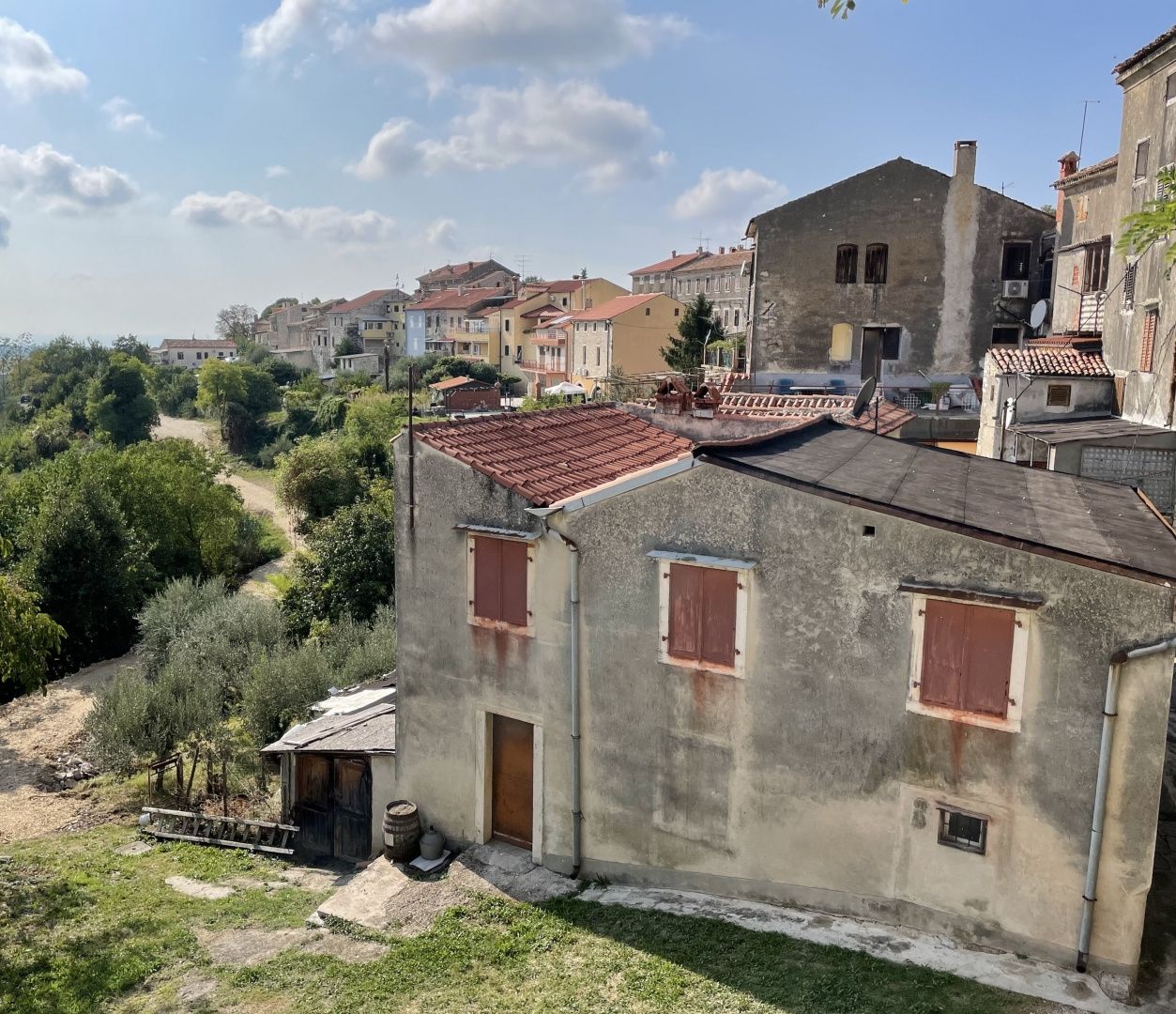 ISTRIEN, BUJE – Haus in einzigartiger Lage mit Panoramablick Die mittelalterliche Stadt Buje liegt im nordwestlichen Teil der istrischen Halbinsel und liegt auf einem Hügel mit einer wunderschönen Aussicht auf das Meer, die Hügel, Weinberge und Olivenhaine, für die diese Gegend berühmt ist. Die Nähe zum Meer, der Einfluss des mediterranen und milden kontinentalen Klimas, die Tradition in der landwirtschaftlichen Produktion, der Jagd und dem Tourismus, die hügelige Landschaft und die erhaltene und unverschmutzte Natur machen das Gebiet der Stadt Buje zu einem der attraktivsten Gebiete der istrischen Halbinsel. Zum Verkauf stehen zwei miteinander verbundene Steinhäuser im Zentrum von Buje mit wunderschönem Panoramablick auf das Meer, Olivenhaine, Weinberge und die unberührte istrische Natur. Dieses Objekt mit einer Gesamtfläche von ca. 200 m² besteht aus zwei Doppelhaushälften, die als Ganzes verkauft werden und eine Einheit bilden. Das erste Haus verfügt über eine Gesamtfläche von ca. 120 m2. Das Erdgeschoss besteht aus einem Flur-Eingang zum Haus, einem großen und einem kleineren Zimmer sowie einem Badezimmer. Die erste Etage dieses Hauses besteht aus einer Küche, einem Schlafzimmer und einem Badezimmer. Spektakuläre Ausblicke bieten sich vom Erdgeschoss und der ersten Etage. Das zweite Haus verfügt über eine Gesamtfläche von ca. 80 m2. Das Erdgeschoss besteht aus einem großen Raum und im ersten Stock befinden sich eine Küche, ein Schlafzimmer, ein kleiner Flur-Eingang zum Haus und ein Badezimmer. Wie das erste Haus bietet auch dieses Haus einen wunderschönen Blick auf das Meer, Olivenhaine, Weinberge und die allgemein wunderschöne Natur. Beide Häuser sind renovierungsbedürftig, um den zukünftigen Eigentümern die Möglichkeit zu geben, sie nach ihren eigenen Wünschen anzupassen. Es besteht auch die Möglichkeit, Häuser zu einer Einheit zusammenzufügen, die durch ein gemeinsames Dach verbunden sind, wodurch ein großzügiger und einzigartiger Wohnraum geschaffen würde. Eine der Besonderheiten dieser Immobilie ist die Möglichkeit, an den Stellen, wo sich früher Fensteröffnungen befanden, neue zu schaffen, wodurch die Helligkeit und Luftigkeit des Raumes noch weiter erhöht werden kann. Die Lage dieser Immobilie ist einzigartig. Die Häuser liegen entlang der historischen Stadtmauern von Buje, was ihnen einen besonderen Charme verleiht und es dem zukünftigen Eigentümer ermöglicht, Teil der Stadtgeschichte zu sein. Obwohl sich die Häuser unterhalb der historischen Mauern von Buje befinden, genießen sie ihre Privatsphäre und Intimität, insbesondere auf der unteren Seite des Hauses, wo das Grün und die natürliche Umgebung eine friedliche Atmosphäre schaffen. Dank der unverbauten Aussicht werden zukünftige Eigentümer die Nähe zu allen Annehmlichkeiten der Stadt zu Fuß genießen können, während das Meer und die wunderschönen Strände nur zehn Autominuten entfernt sind. Der Blick vom Haus bietet unvergessliche Ausblicke auf den nahegelegenen Ort Santa Lucia, der für seine Weinberge bekannt ist, sowie auf die nur 5 km entfernte Kleinstadt Brtonigla. Dieser Panoramablick auf die Natur und die Weinberge schafft eine besondere Atmosphäre, die dieses Anwesen wirklich einzigartig macht. Zusätzliches Grundstück: Zum Haus gehört ein 226 m² großes Baugrundstück, welches zahlreiche Möglichkeiten zur zusätzlichen Bebauung oder Anlage einer Gartenfläche eröffnet. Dieses Anwesen ist die perfekte Wahl für alle, die Geschichte, Natur und Meeresnähe in einem einzigartigen Angebot vereinen möchten.