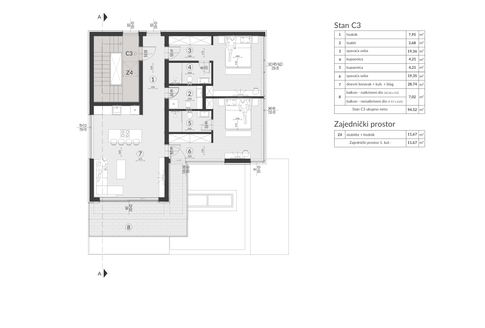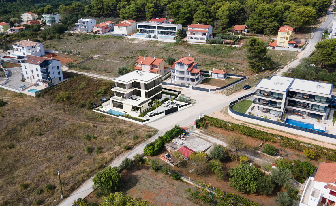 ISTRIEN, MEDULIN – Luxuriöses Penthouse mit Blick auf die Bucht von Medulin Medulin – einst ein kleines Fischerdorf, hat sich dank seiner attraktiven Lage zu einem der bekanntesten Touristenziele Istriens entwickelt. Genießen Sie die Vielfalt der Fels-, Kies- und Sandstrände und lassen Sie sich vom Charme der Natur verzaubern. Der Ort eignet sich für einen ruhigen und romantischen Urlaub, aber auch Sportbegeisterte kommen auf ihre Kosten. Fußball, Reiten, Tennis, Segeln, Minigolf, Fliegen, Bowling, Beachvolleyball oder Tauchen – Medulin bietet für jeden Geschmack das Richtige. Die Lage des Gebäudes und der Wohnung selbst sorgt durch die Glaswände, die die gesamte Wohnung umgeben, für viel Tageslicht und bietet einen unvergesslichen Blick auf die Bucht von Medulin. Ein durchdachter Grundriss und eine durchdachte Raumaufteilung trennen den privaten vom geselligen Teil der Wohnung. Am Eingang der Wohnung befindet sich ein Flur, von dem aus man in das geräumige, offene Wohnzimmer gelangt, das mit der modernen Küche und dem Esszimmer verbunden ist. Von jedem Winkel des Raumes aus hat man einen Blick auf das Meer. Der private Teil der Wohnung beherbergt zwei Schlafzimmer mit eigenem Bad und ein Gäste-WC. Vom Wohnzimmer aus gelangt man auf eine großzügige, von einem Glaszaun umgebene Terrasse, von der zukünftige Eigentümer einen einzigartigen Panoramablick auf das Meer und die Bucht von Medulin genießen können. Im Innenhof des Gebäudes befinden sich zwei private Parkplätze. Die Wohnung wird mit hochwertigen Materialien renommierter internationaler Hersteller ausgestattet. Im Innenbereich kommt Travertinstein zum Einsatz, der mit seinen natürlichen, warmen Erdtönen den Räumen und Außenbereichen eine mediterrane und rustikale Atmosphäre verleiht. Das moderne Design der Wohnungen mit hohen Schüco-Fenstern und einem Glasbalkon sorgt für viel Licht. Es sind elektrische Jalousien aus Aluminium installiert. Die Klimaanlagen sind in die abgehängte Decke integriert, sodass nur dezente Lüftungsöffnungen sichtbar sind. Dies sorgt für ein ästhetisch klares Raumkonzept. Die Luft wird über mehrere Lüftungsöffnungen verteilt, was für eine angenehme Kühlung oder Heizung ohne Zugluft sorgt. Da das Hauptgerät in die Decke integriert ist, arbeitet es leiser als Wandgeräte. Der Kauf einer Immobilie in dieser Phase ermöglicht es zukünftigen Eigentümern, die Keramik auszuwählen und sie nach ihren Wünschen zu personalisieren. Diese besondere Immobilie in Medulin ist ein wahres Juwel und eine kluge Investition für ein komfortables Leben und Wohnen sowie für eine Rendite durch Tourismus.