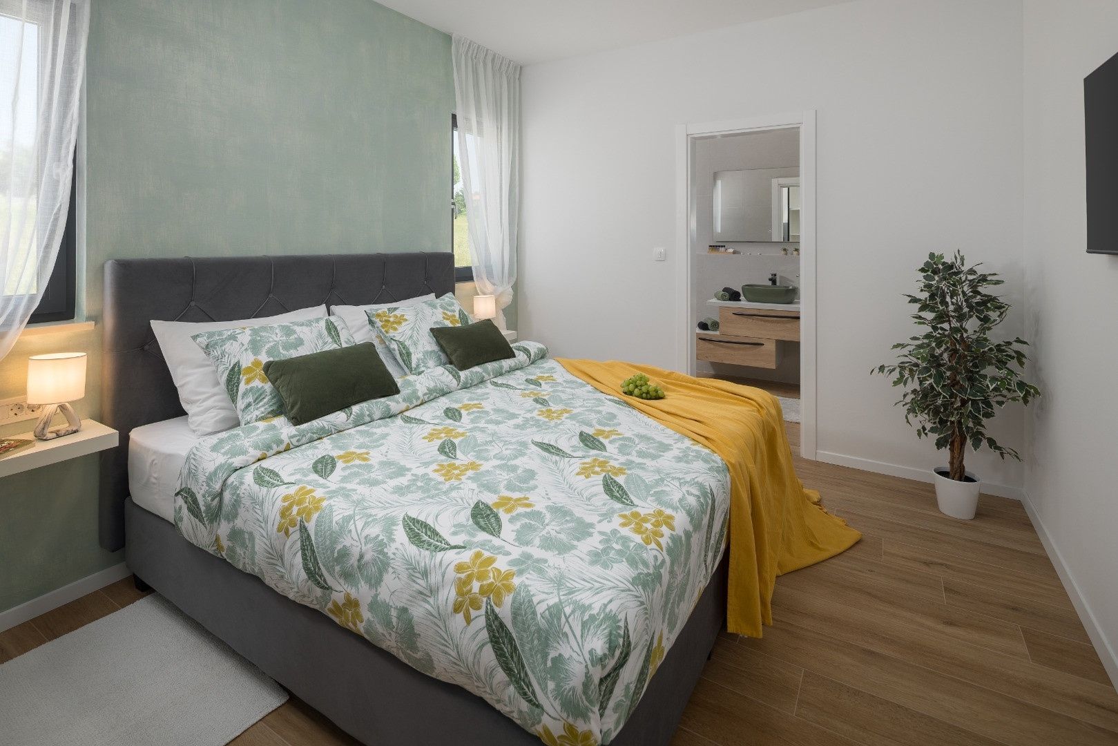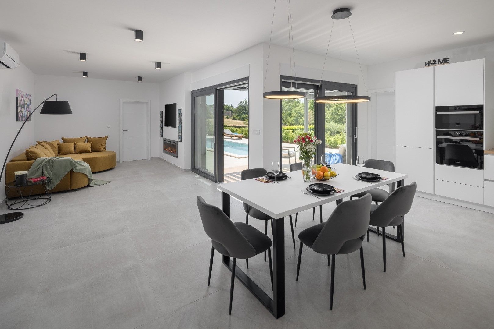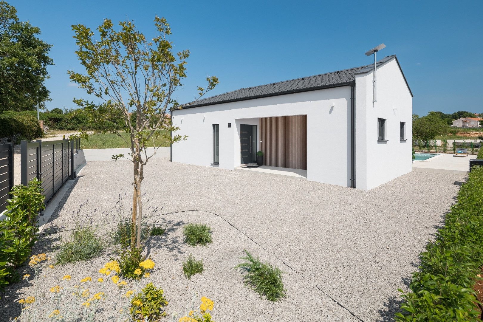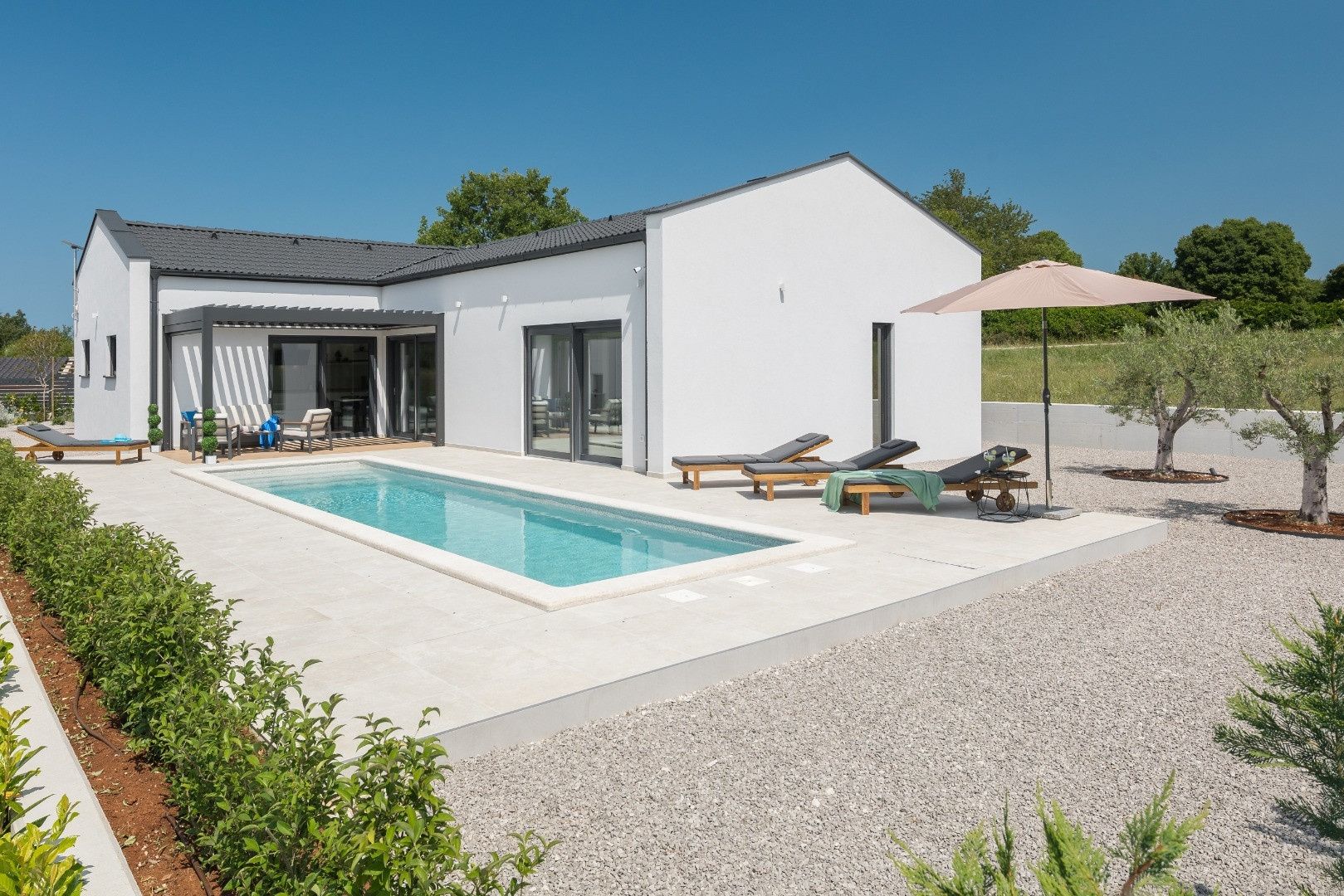 ISTRIEN, SVETI PETAR IM WALD - Hochwertiges Fertighaus mit Swimmingpool Umgeben von alten Wäldern und auf einer hügeligen Ebene gelegen, ist Sveti Petar u Šuma, Sitz der kleinsten Gemeinde Istriens, die ungewöhnlichste istrische Stadt. Typische istrische Architektur ist hier weniger vertreten, jedoch ist in ihrer Bauweise bereits ein spürbarer Einfluss des Nordens spürbar. Die meisten Häuser rund um St. Peter sind noch immer mit steinernen Fensterläden bedeckt, die von der Zeit grau geworden sind. Es ist weithin bekannt für die wunderschöne Barockkirche St. Peter und Paul und das Paulinerkloster mit Steinmauern, umgeben von einem Garten und einem großen Platz vor der Kirche und dem Kloster, wo sich eines der ältesten glagolitischen Denkmäler befindet – das Supetar-Fragment - wurde gefunden. Wir präsentieren Ihnen dieses hochwertige moderne Fertighaus mit einer Fläche von 147,70 m2 auf einem Grundstück von 630 m2. Es handelt sich um ein hochwertiges Fertighaus mit belüftetem Dach. Das neue Gebäude besteht aus: - zwei Schlafzimmern mit separaten Badezimmern - Küche, Esszimmer und Wohnzimmer im selben Raum - einem Raum für die Wäsche, in dem sich auch eine Vorrichtung zum Erhitzen von Wasser befindet - einem Raum mit direktem Zugang zum Pool ein separates WC und eine Dusche (Vorbereitungen für Sauna und Whirlpool wurden getroffen und eine ausreichende Belüftung für den Wellnessraum wurde installiert), kann aber auf Wunsch auch als weiteres Schlafzimmer oder als Fitnessraum eingerichtet werden. - ein separater Raum mit separatem Eingang von 4,70 m2, in dem sich der Hauptschaltschrank mit Sicherungen, ein Server für Kameras (die erste Phase für die Videoüberwachung wurde durchgeführt) und ein Wechselrichter für Sonnenkollektoren befinden (falls installiert, wurden auch Brunnen in den Dachboden geschoben). die Paneele einmal) und in diesem Raum gibt es eine Öffnung für den Eingang zum Dachboden und es können ein zusätzlicher Kleiderschrank oder Regale zum Aufbewahren von Dingen platziert werden. Wichtige Informationen: - PVC-Tischlerei verfügt über eingebaute elektrische. Jalousien mit Moskitonetzen und Klimasensoren im Wohnzimmer – die Eingangstür ist aus Aluminium – hochwertige Inoterm-Tür – alle Böden sind aus Keramik, darunter ist elektrische Heizung installiert. Fußbodenheizung - es gibt 3 Klimaanlagen - in den Schlafzimmern und im Wohnzimmer - die Fassadenverkleidung besteht aus Holzfasern und die Innenseite der Außenwände ist mit Zellulose als Wärmeisolator gefüllt - für die Abwasserentsorgung ein Bioreiniger mit Kompressor ist installiert - die Vorbereitung für den verschiebbaren Elektroportun am Eingang zum Hof, sowie Gewindesteckdosen für Autoladegeräte, Licht für Carports usw. - die erste Phase für die Antenne und den Fernseher ist installiert ist 3 x 10 m groß, die Beckenschale ist mit abgedeckt Mit blauer Farbe getüncht und der Maschinenraum befindet sich unter dem Strand, eine Wärmepumpe ist installiert und im Preis ist eine Winterabdeckung für den Pool enthalten. In der Ecke zwischen Küche/Pool wird eine bioklimatische Pergola von 15 m2 mit integrierter LED-Beleuchtung platziert. Wohnzimmer und der Pool. Diese neu erbaute Villa bietet ihren zukünftigen Eigentümern alles, was sie für einen sicheren und ruhigen Aufenthalt das ganze Jahr über benötigen, und ist außerdem die perfekte Immobilie für die Entwicklung Ihres eigenen touristischen Angebots mit einer sicheren Kapitalrendite.