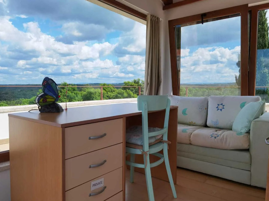 ISTRIEN, VIŠNJAN – Anwesen mit zwei Steinhäusern inmitten der Natur und Meerblick Višnjan ist eine malerische und lebendige Stadt und Gemeinde im Westen Istriens. Die Gemeinde Višnjan umfasst 56 Ortschaften und liegt zwischen dem Fluss Mirna im Norden und dem Lim-Kanal im Süden. Das romantische Višnjan schmiegt sich an einen sanften Hügel, 244 m über dem Meeresspiegel, umgeben von Wiesen, Ackerland und Wäldern aus Steineichen und Weißbuchen. Heute ist Višnjan vor allem für seine einzigartige Sternwarte bekannt, die gemessen an der Anzahl der entdeckten Asteroiden zu den zwölf produktivsten Sternwarten der Welt zählt. Zum Verkauf stehen zwei istrische Steinhäuser mit Swimmingpool im Zentrum eines wunderschönen, gut erhaltenen istrischen Dorfes nahe Višnjan. Das erste Haus mit Swimmingpool erstreckt sich über vier Etagen. Im Untergeschoss befindet sich eine große, wunderschön eingerichtete Taverne mit Kamin, Küche und Badezimmer. Das Erdgeschoss besteht aus Küche, Esszimmer und Wohnzimmer mit Zugang zu einer überdachten Terrasse sowie einem Balkon, einem Schlafzimmer, einem Badezimmer und einer Eingangshalle. Eine Innentreppe verbindet das Erdgeschoss mit dem ersten Obergeschoss, wo sich drei Schlafzimmer, ein Badezimmer, ein Abstellraum und ein großer, offener Balkon befinden. Eine weitere Innentreppe führt vom ersten Obergeschoss in das ausgebaute Dachgeschoss mit einem verglasten Atelier und einer Terrasse mit freiem Panoramablick auf die Stadt, den umliegenden Wald, die Felder und die Olivenhaine. Ein atemberaubender Ausblick, der die Zeit stillstehen lässt. Im gepflegten Garten befinden sich ein 23 m² großer Swimmingpool, eine Sonnenterrasse und ein Nebengebäude. Das zweite Steinhaus im Erdgeschoss verfügt über eine Garage, einen Keller und einen Abstellraum. Im ersten Obergeschoss befinden sich eine überdachte Terrasse, ein großes Schlafzimmer, ein Wohnzimmer mit Küche, ein Esszimmer und ein großes Badezimmer. Im ausgebauten Dachgeschoss befinden sich zwei geräumige Schlafzimmer. Das Anwesen verfügt über einen großen Garten mit mehreren überdachten und nicht überdachten Parkplätzen. Im Hof befinden sich außerdem ein alter Brunnen und ein Brotbackofen. Das Anwesen ist ideal für eine Auszeit vom Stadttrubel oder zur touristischen Vermietung.