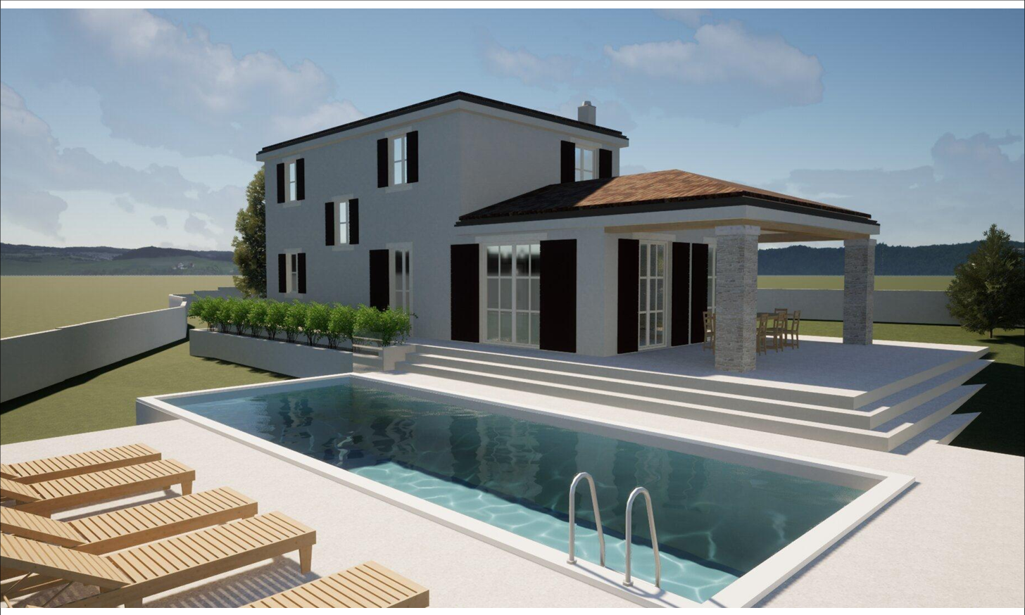 ISTRIEN, VIŠNJAN – Baugrundstück mit Baugenehmigung Višnjan ist eine malerische und lebendige Stadt und Gemeinde im Westen Istriens. Die Gemeinde Višnjan umfasst 56 Ortschaften und liegt zwischen dem Fluss Mirna im Norden und dem Lim-Kanal im Süden. Das romantische Višnjan schmiegt sich an einen sanften Hügel von 244 m ü. d. M., umgeben von Wiesen, Ackerland und Wäldern aus Steineichen und Weißbuchen. Heute ist Višnjan vor allem für seine einzigartige Sternwarte bekannt, die gemessen an der Anzahl der entdeckten Asteroiden zu den zwölf produktivsten Sternwarten der Welt zählt. Ein attraktives Baugrundstück von 925 m² mit gültiger Baugenehmigung und einem fertigen Entwurf für ein modernes Einfamilienhaus mit Swimmingpool steht zum Verkauf. Dieses Grundstück bietet eine hervorragende Gelegenheit für alle, die sofort mit dem Bau beginnen möchten, ohne sich mit langwierigen Genehmigungsverfahren und Planungsarbeiten herumschlagen zu müssen. Das Projekt präsentiert sich in einem modernen Architekturstil und bietet eine funktionale Raumaufteilung, großzügige Glasflächen, eine Terrasse und einen privaten Pool – ideal für ein komfortables Familienleben oder ein luxuriöses Ferienhaus. Die Infrastruktur ist vorhanden, und Wasser- sowie Stromanschlüsse sind auf dem Grundstück verfügbar, was den Baubeginn zusätzlich erleichtert und beschleunigt. Das Grundstück erstreckt sich über 925 m² und bietet ausreichend Platz für ein Haus, einen Hof, einen Garten und weitere Annehmlichkeiten. Das Projekt wurde sorgfältig geplant, um das Grundstück optimal zu nutzen und Privatsphäre sowie einen hochwertigen Außenbereich zu gewährleisten.