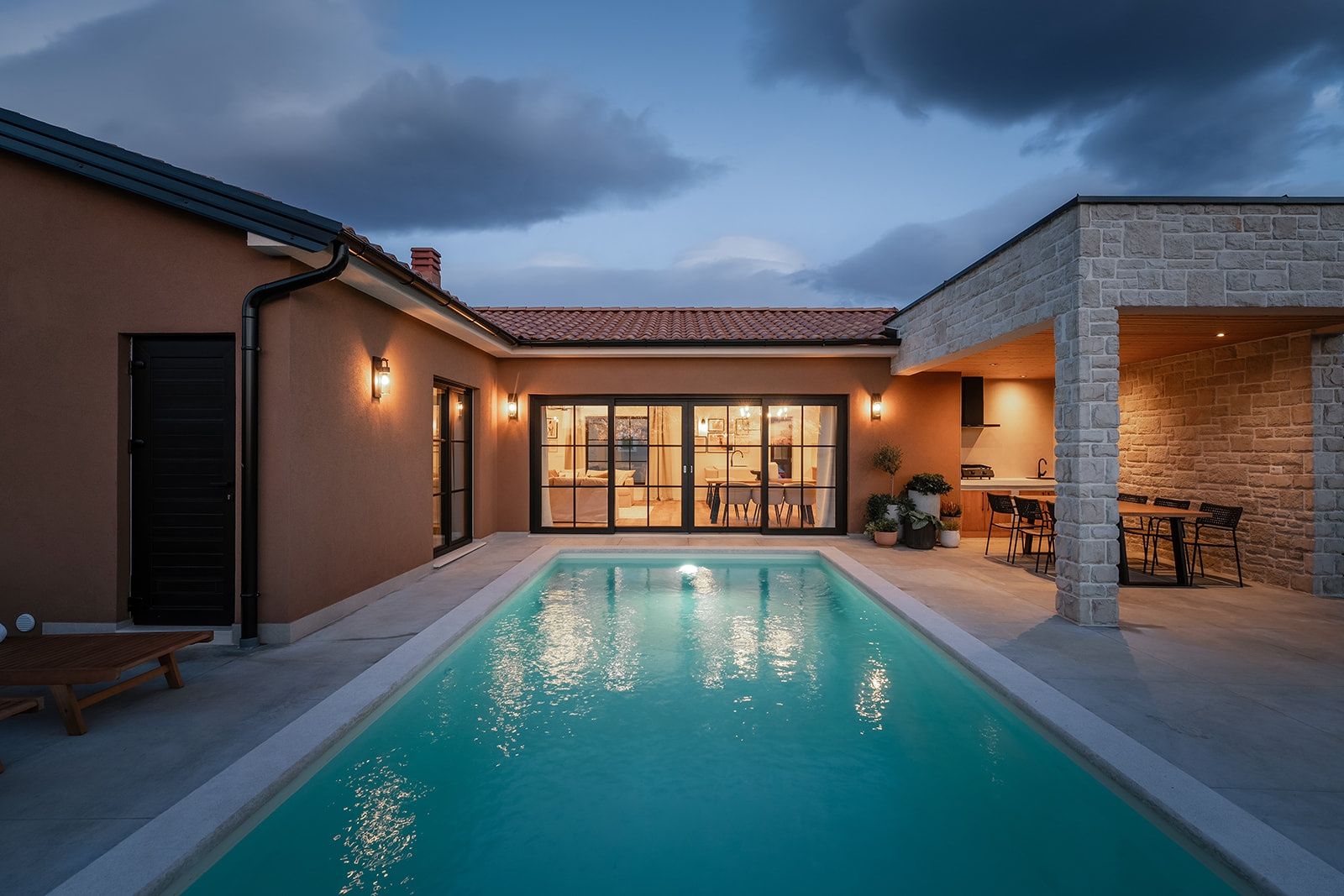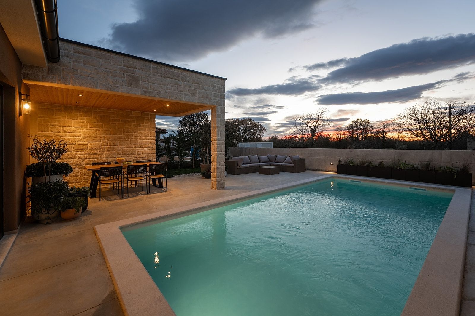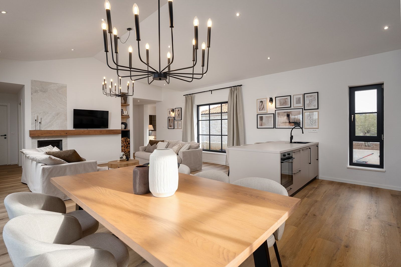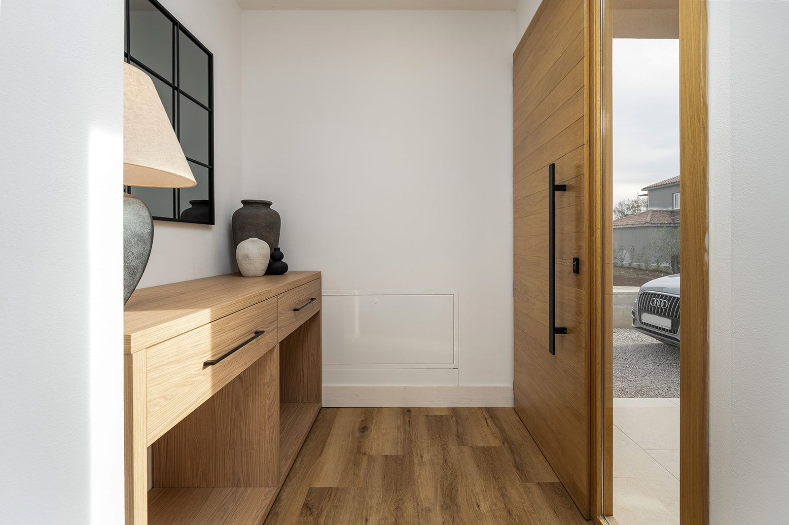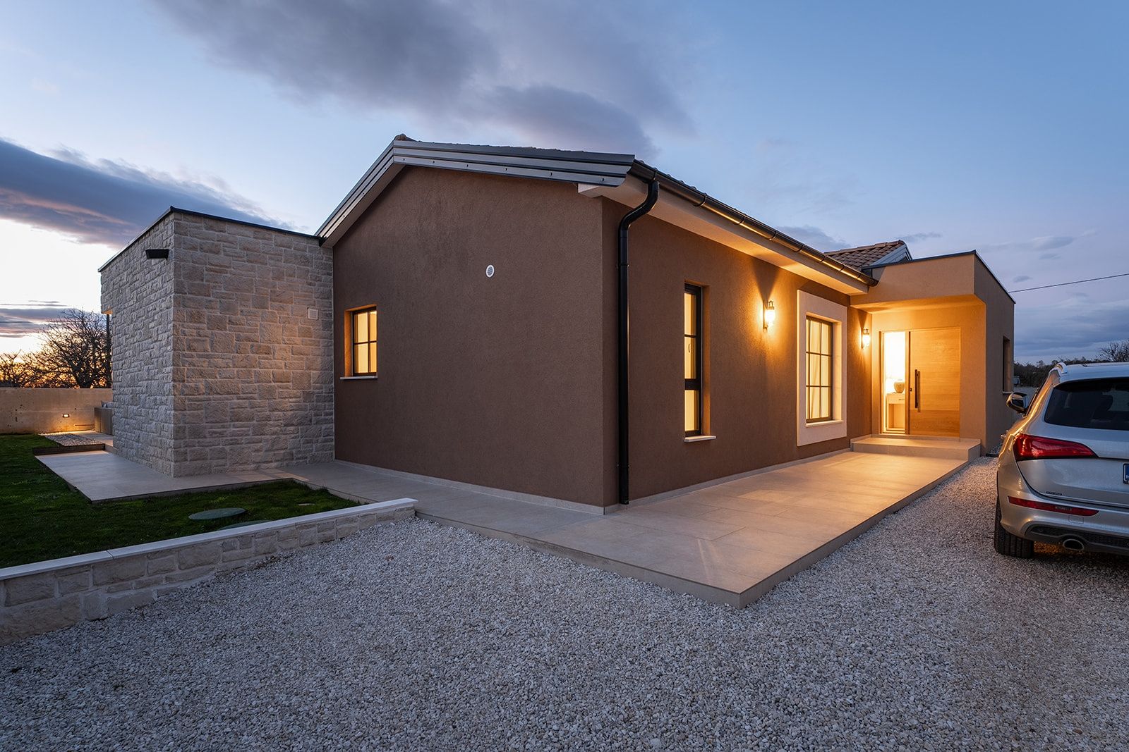 ISTRIEN, ŽMINJ – Ein traumhaftes Einfamilienhaus in einer privaten Anlage! DUX Real Estate präsentiert ein traumhaftes Einfamilienhaus mit erstklassiger Ausstattung! Dieses neu erbaute Haus befindet sich in ruhiger Lage, nur 5 Autominuten vom Zentrum von Žminj entfernt! Das Haus besticht durch ein offenes Raumkonzept mit exzellenter Raumaufteilung und einem großzügigen, fließend ineinander übergehenden Wohnbereich, der Wohnzimmer, Küche und Esszimmer miteinander verbindet. Zwei Schlafzimmer mit jeweils eigenem Bad, eines davon mit begehbarem Kleiderschrank, ein Hauswirtschaftsraum und ein Gäste-WC runden das Angebot ab. Wir laden alle Interessenten herzlich zu einer Besichtigung ein. Das wunderschöne, rustikal-moderne Interieur sorgt für ein ganz besonderes Ambiente. Das Haus wird möbliert verkauft. 90 % der Möbel wurden exklusiv für dieses traumhafte Einfamilienhaus maßgefertigt. Warum betonen wir immer wieder das Wort „traumhaft“? Weil dieses Haus wirklich etwas ganz Besonderes ist. Das Hausprojekt selbst und die Funktionalität der Räume heben sich deutlich von vielen anderen Immobilien auf dem Markt ab. Die Einrichtung wird sowohl Liebhaber des rustikalen als auch des modernen Stils begeistern und Ihnen gleichzeitig ein Gefühl von istrischem Flair vermitteln! Überzeugen Sie sich selbst! Für wohlige Wärme und Kühlung sorgt eine Fußbodenheizung im gesamten Haus, und selbstverständlich ist auch eine Klimaanlage vorhanden! Der Garten bietet alles, was Sie brauchen, ohne dass Sie viel Zeit und Geld in die Pflege investieren müssen. Es gibt einen Swimmingpool, eine Sonnenterrasse und eine überdachte Terrasse mit Sommerküche, deren Gestaltung sich harmonisch in das Gesamtkonzept des Anwesens einfügt. Zwei Parkplätze stehen zur Verfügung. Das Erdgeschoss ist umgeben von anderen Neubauten und Natur! Ein sicheres Zuhause! Wir stehen Ihnen für alle weiteren Fragen und die Organisation von Besichtigungen gerne zur Verfügung! Liebe
