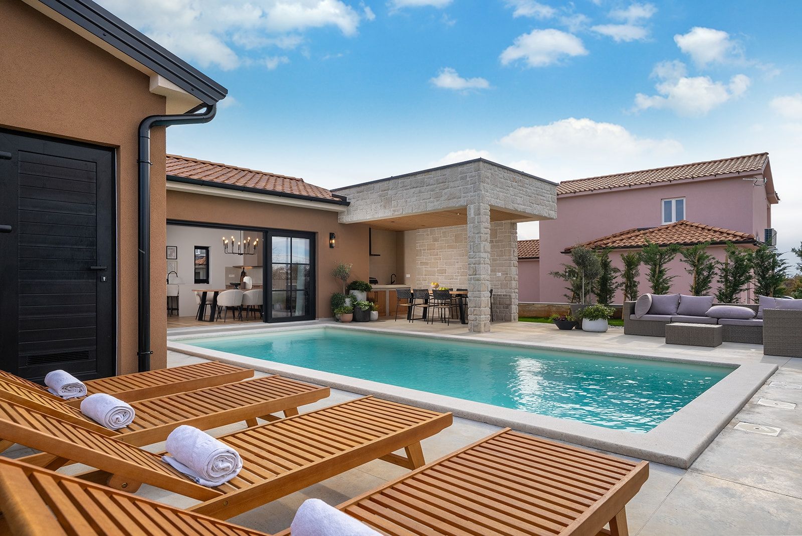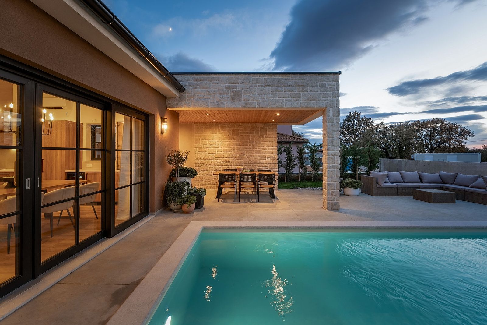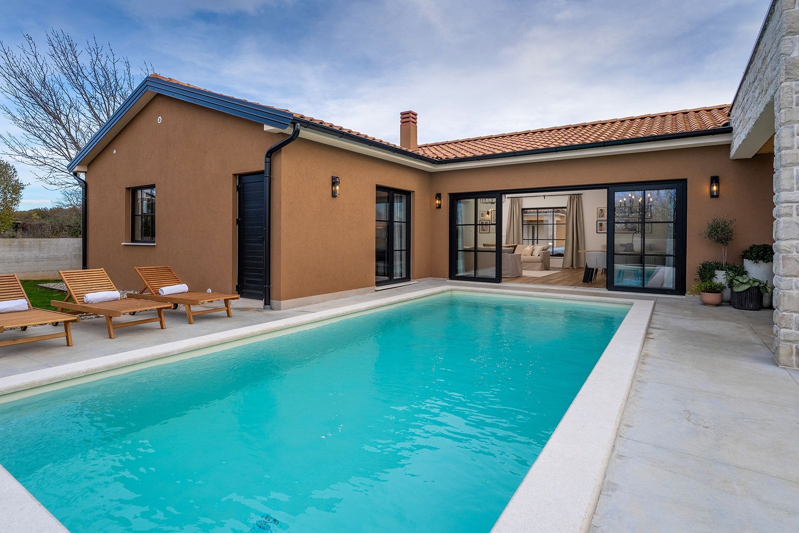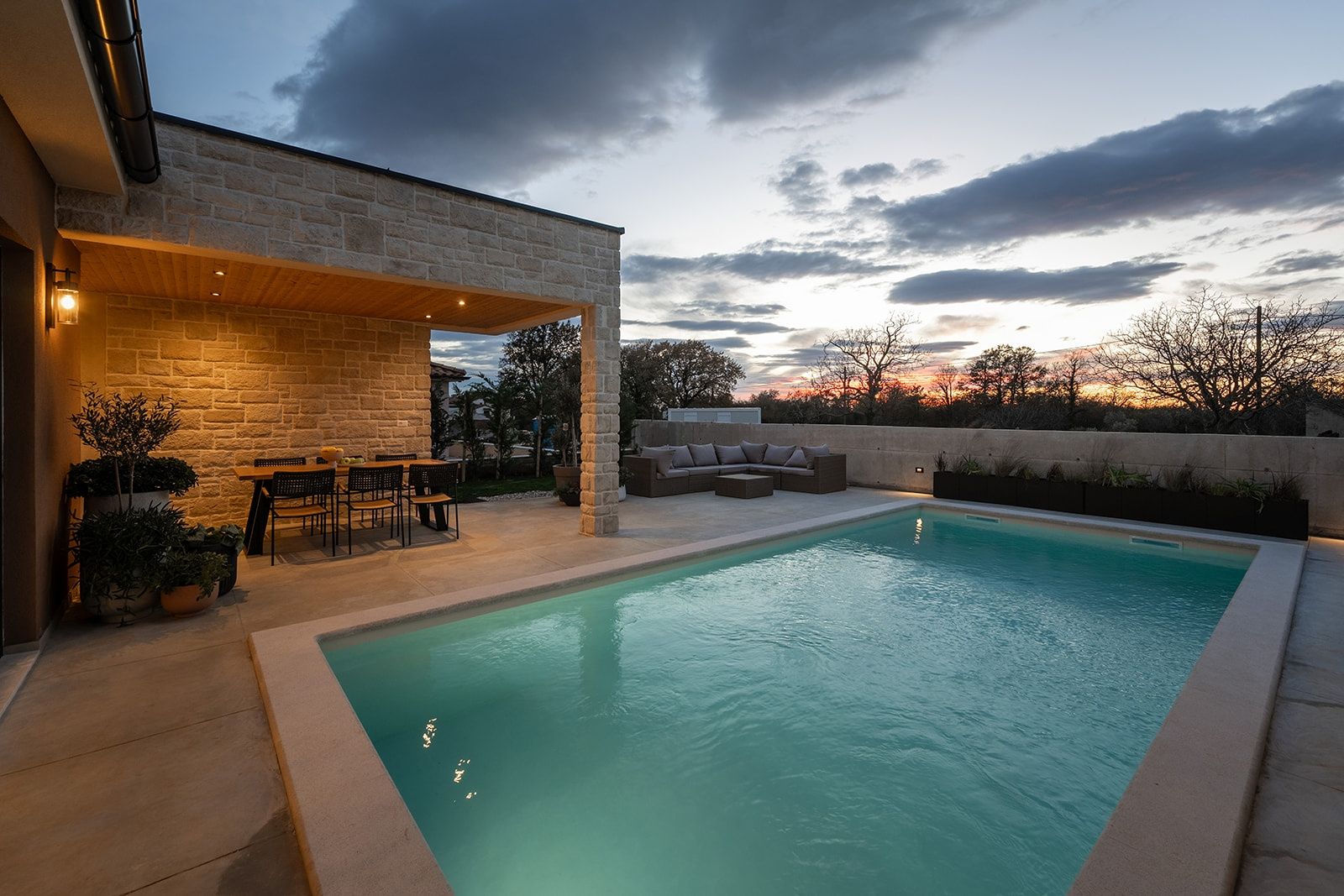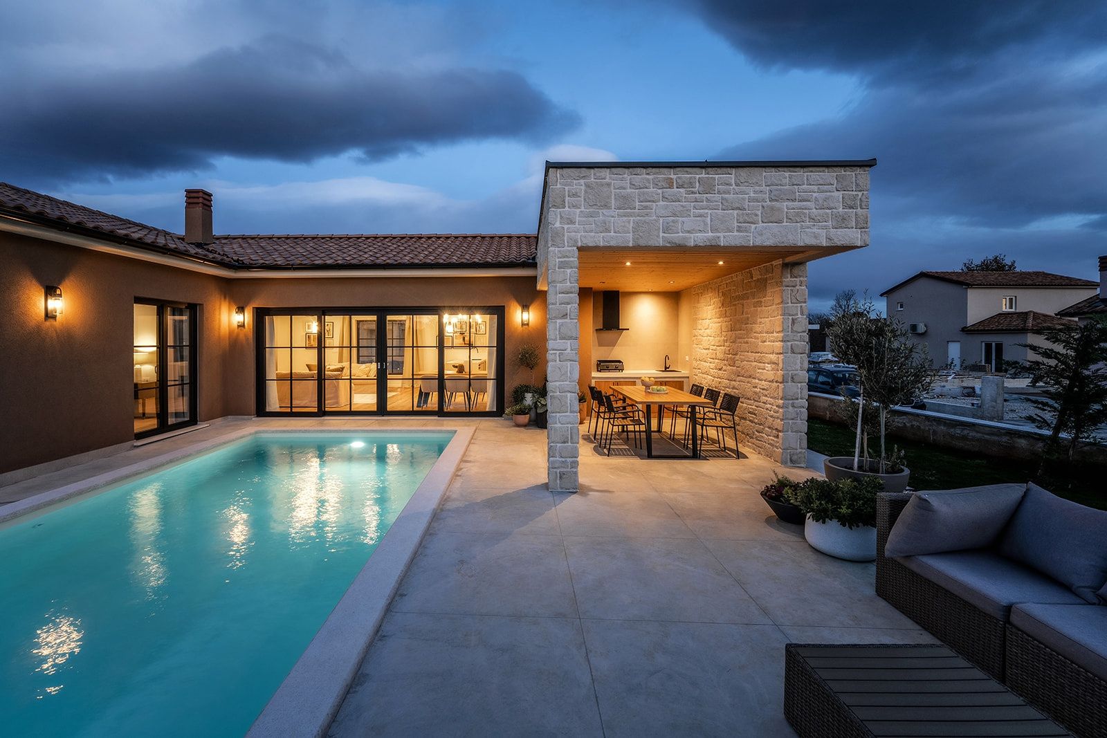 ISTRIEN, ŽMINJ – Ein traumhaftes Einfamilienhaus in einer privaten Anlage! DUX Real Estate präsentiert ein traumhaftes Einfamilienhaus mit erstklassiger Ausstattung! Dieses neu erbaute Haus befindet sich in ruhiger Lage, nur 5 Autominuten vom Zentrum von Žminj entfernt! Das Haus besticht durch ein offenes Raumkonzept mit exzellenter Raumaufteilung und einem großzügigen, fließend ineinander übergehenden Wohnbereich, der Wohnzimmer, Küche und Esszimmer miteinander verbindet. Zwei Schlafzimmer mit jeweils eigenem Bad, eines davon mit begehbarem Kleiderschrank, ein Hauswirtschaftsraum und ein Gäste-WC runden das Angebot ab. Wir laden alle Interessenten herzlich zu einer Besichtigung ein. Das wunderschöne, rustikal-moderne Interieur sorgt für ein ganz besonderes Ambiente. Das Haus wird möbliert verkauft. 90 % der Möbel wurden exklusiv für dieses traumhafte Einfamilienhaus maßgefertigt. Warum betonen wir immer wieder das Wort „traumhaft“? Weil dieses Haus wirklich etwas ganz Besonderes ist. Das Hausprojekt selbst und die Funktionalität der Räume heben sich deutlich von vielen anderen Immobilien auf dem Markt ab. Die Einrichtung wird sowohl Liebhaber des rustikalen als auch des modernen Stils begeistern und Ihnen gleichzeitig ein Gefühl von istrischem Flair vermitteln! Überzeugen Sie sich selbst! Für wohlige Wärme und Kühlung sorgt eine Fußbodenheizung im gesamten Haus, und selbstverständlich ist auch eine Klimaanlage vorhanden! Der Garten bietet alles, was Sie brauchen, ohne dass Sie viel Zeit und Geld in die Pflege investieren müssen. Es gibt einen Swimmingpool, eine Sonnenterrasse und eine überdachte Terrasse mit Sommerküche, deren Gestaltung sich harmonisch in das Gesamtkonzept des Anwesens einfügt. Zwei Parkplätze stehen zur Verfügung. Das Erdgeschoss ist umgeben von anderen Neubauten und Natur! Ein sicheres Zuhause! Wir stehen Ihnen für alle weiteren Fragen und die Organisation von Besichtigungen gerne zur Verfügung! Liebe