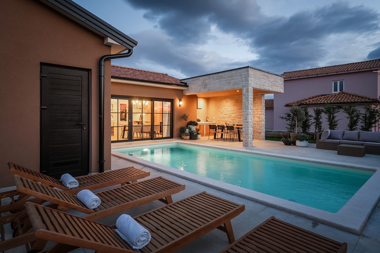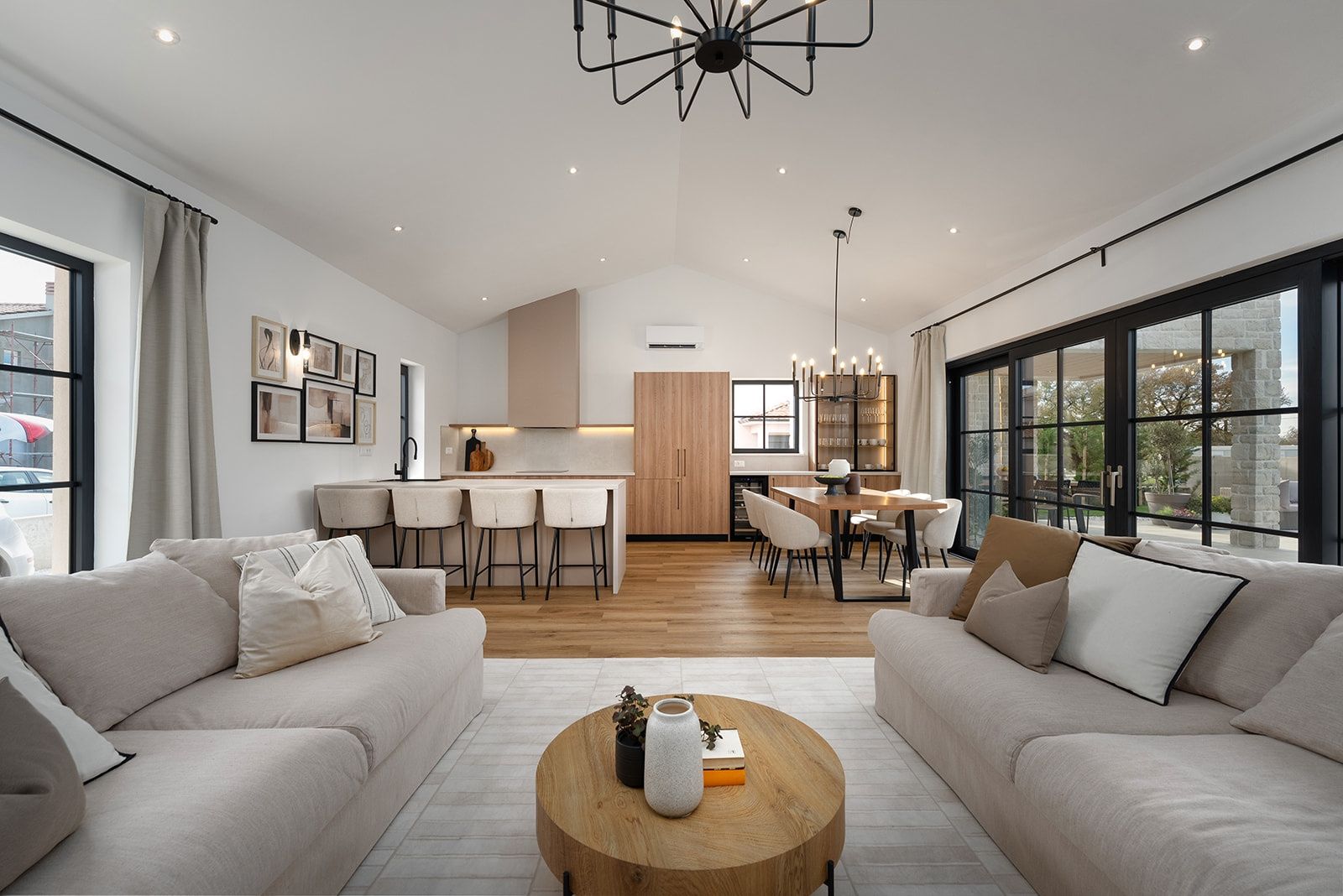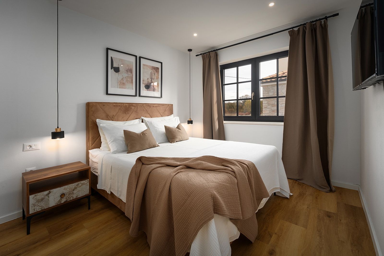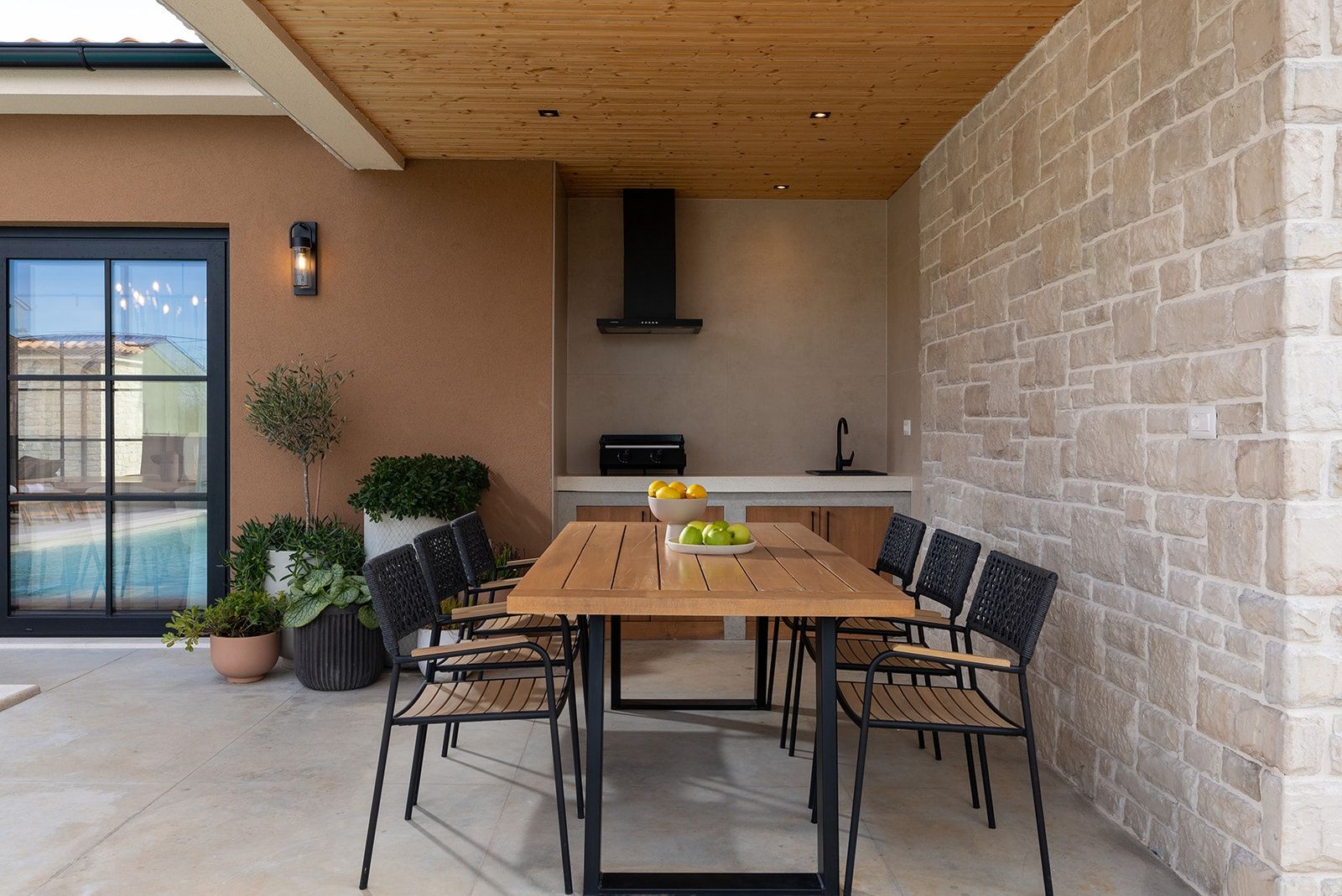 ISTRIEN, ŽMINJ – Ein traumhaftes Einfamilienhaus in einer privaten Anlage! DUX Real Estate präsentiert ein traumhaftes Einfamilienhaus mit erstklassiger Ausstattung! Dieses neu erbaute Haus befindet sich in ruhiger Lage, nur 5 Autominuten vom Zentrum von Žminj entfernt! Das Haus besticht durch ein offenes Raumkonzept mit exzellenter Raumaufteilung und einem großzügigen, fließend ineinander übergehenden Wohnbereich, der Wohnzimmer, Küche und Esszimmer miteinander verbindet. Zwei Schlafzimmer mit jeweils eigenem Bad, eines davon mit begehbarem Kleiderschrank, ein Hauswirtschaftsraum und ein Gäste-WC runden das Angebot ab. Wir laden alle Interessenten herzlich zu einer Besichtigung ein. Das wunderschöne, rustikal-moderne Interieur sorgt für ein ganz besonderes Ambiente. Das Haus wird möbliert verkauft. 90 % der Möbel wurden exklusiv für dieses traumhafte Einfamilienhaus maßgefertigt. Warum betonen wir immer wieder das Wort „traumhaft“? Weil dieses Haus wirklich etwas ganz Besonderes ist. Das Hausprojekt selbst und die Funktionalität der Räume heben sich deutlich von vielen anderen Immobilien auf dem Markt ab. Die Einrichtung wird sowohl Liebhaber des rustikalen als auch des modernen Stils begeistern und Ihnen gleichzeitig ein Gefühl von istrischem Flair vermitteln! Überzeugen Sie sich selbst! Für wohlige Wärme und Kühlung sorgt eine Fußbodenheizung im gesamten Haus, und selbstverständlich ist auch eine Klimaanlage vorhanden! Der Garten bietet alles, was Sie brauchen, ohne dass Sie viel Zeit und Geld in die Pflege investieren müssen. Es gibt einen Swimmingpool, eine Sonnenterrasse und eine überdachte Terrasse mit Sommerküche, deren Gestaltung sich harmonisch in das Gesamtkonzept des Anwesens einfügt. Zwei Parkplätze stehen zur Verfügung. Das Erdgeschoss ist umgeben von anderen Neubauten und Natur! Ein sicheres Zuhause! Wir stehen Ihnen für alle weiteren Fragen und die Organisation von Besichtigungen gerne zur Verfügung! Liebe