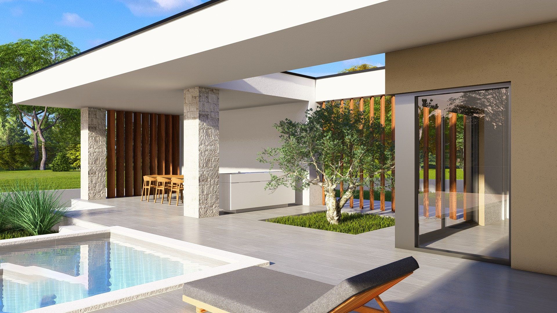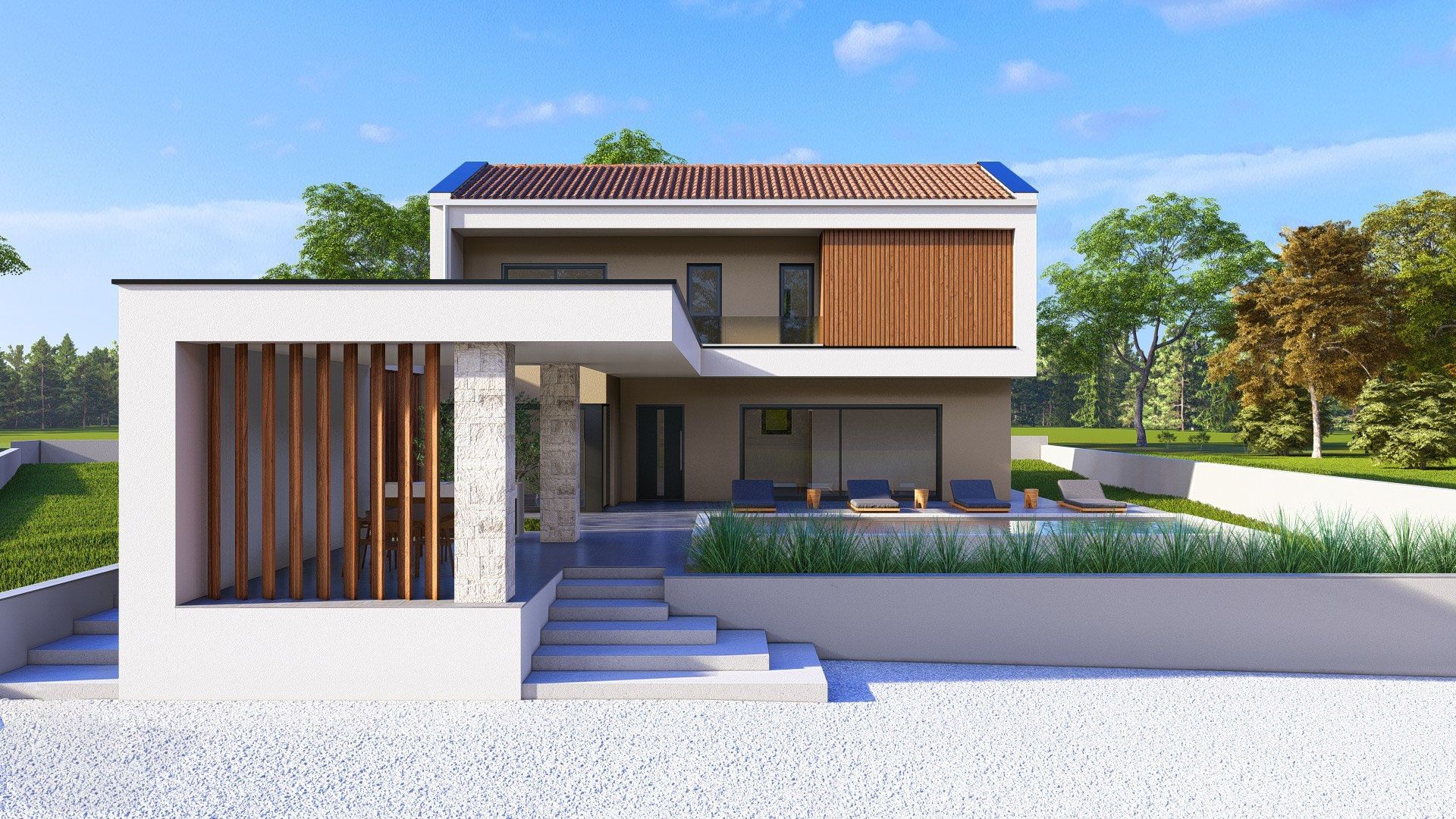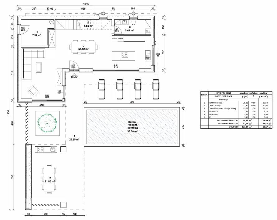 ISTRIEN, ŽMINJ – Moderne Luxusvilla mit Pool, Solaranlage und hochwertiger Ausstattung Žminj ist ein charmantes istrisches Städtchen im Herzen der Halbinsel, bekannt für sein authentisches Ambiente, seine traditionelle Architektur und die hervorragende Verkehrsanbindung nach Pula, Rovinj und Pazin. Dank seiner zentralen Lage und der steigenden Nachfrage nach hochwertigen Immobilien im istrischen Hinterland ist es die ideale Wahl für ein ruhiges Familienleben oder eine Investition in den Tourismus. Unweit des Zentrums von Žminj, in ruhiger und privater Lage, steht eine moderne Villa in erstklassiger Bauqualität mit einer Wohnfläche von 161,5 m² und einem 30,6 m² großen Pool auf einem 932 m² großen Grundstück zum Verkauf. INTERIEUR – FUNKTIONALITÄT UND ELEGANZ Die Villa wurde sorgfältig gestaltet, um maximalen Komfort und Großzügigkeit zu bieten. Die 161,5 m² große Wohnfläche umfasst: • ein geräumiges Wohnzimmer • eine Wohnküche • 3 Schlafzimmer • 2 Badezimmer • 1 Gäste-WC • einen Technikraum Das Haus ist klimatisiert (LG Split-Klimaanlagen in jedem Schlafzimmer und im Wohnzimmer) und verfügt über Fußbodenheizung. Warmwasser wird in einem 200-Liter-Boiler erzeugt, der an eine LG Wärmepumpe angeschlossen ist. Die Badezimmer sind mit hochwertigen Armaturen ausgestattet: • Hansgrohe Armaturen und Unterputzduschen in Schwarz • begehbare Duschen mit Sicherheitsglas • Villeroy & Boch WCs mit Soft-Close-Sitz Die Böden und Wände sind mit erstklassiger Keramik (Keraterm/Feroterm 60x60 oder 60x120 cm) gefliest. Die Wände sind maschinell verputzt, doppelt geglättet und weiß gestrichen. Die Fenster und Türen bestehen aus Rehau ALU/PVC mit dreifach verglastem LOW-E-Glas (6-16-6, Gas, Ug=0,8 W/m²K), Panorama-ALU-Wänden, Sicherheitsglas und elektrischen Aluminium-Rollläden, die per Smartphone gesteuert werden. Die Eingangstür ist aus Aluminium und verfügt über ein 3-Punkt-Sicherheitsschloss, ein zusätzliches Sicherheitsschloss sowie eine moderne Innentür mit schwarzem Magnetverschluss und verdeckten Scharnieren. TECHNISCHE DATEN UND KONSTRUKTION Konstruktion: • Stahlbeton-Fundamentstreifen und -platten • 25 cm tragende Wände aus Wienerberger-Ziegeln • 10 cm starke Trennwände (Wienerberger) • Stahlbetonstützen und -träger Wärmedämmung und Fassade: • Abdichtung mit Teerfolie • 10 cm EPS + Baumit Fassadensystem • 2 cm Ziersteinpflaster • Dach: 15 cm XPS-Dämmung + Abdichtung Blechverkleidung: Aluminium und verzinktes, lackiertes Blech Entwässerung: biologisch abbaubare Grube Auf dem Dach ist eine 10-kW-Photovoltaikanlage mit N-Typ-Modulen installiert. Sicherheit: • Videoüberwachung (Überwachung per Mobiltelefon) • Diebstahlsicherung • Internetanschluss über Mobilfunknetz Zusätzlich: • Schneider Electric EV-Ladegerät 11 kW (Typ 2, Kabel 5 m) GARTEN – 932 m² PRIVATSPHÄRE UND KOMFORT Das 932 m² große Grundstück ist vollständig von einer Mauer und einem grünen Zaun umgeben. Lorbeer, Kirsche und Thuja sorgen für maximale Privatsphäre. Der angelegte Garten bietet: • 30,6 m² großer Swimmingpool (1,3 m tief) • Skimmersystem • Elektrolyse (Salz & Swim 2.0) • automatische Filteranlage • Wärmepumpe für Heiz- und Kühlwasser • LED-Beleuchtung • Blaue Duraston-Mikrozementverkleidung • Vorbereitung für eine Außendusche • Rasenfläche • 3 Olivenbäume mit Beleuchtung • Tropfbewässerungssystem mit Programmierer • Elektrisches Aluminium-Einfahrtstor mit Fernbedienung • Außenstellplatz • Ladestation für Elektrofahrzeuge Die Terrassen sind mit hochwertigen 60x60 cm großen Keramikfliesen belegt. Geplante Fertigstellung: Oktober 2026 Diese Villa vereint moderne Technologie, Energieeffizienz (10-kW-Solaranlage), luxuriöse Ausstattung und absolute Privatsphäre in bester Lage im Herzen Istriens. Sie eignet sich ideal als Familienhaus, luxuriöse Ferienresidenz oder als Kapitalanlage für die gehobene touristische Vermietung. Mit dem Kauf dieser Immobilie sichern Sie sich langfristigen Wert, eine sichere Bauweise durch einen erfahrenen Bauunternehmer und ein Zuhause, das höchsten Ansprüchen modernen Wohnens gerecht wird.