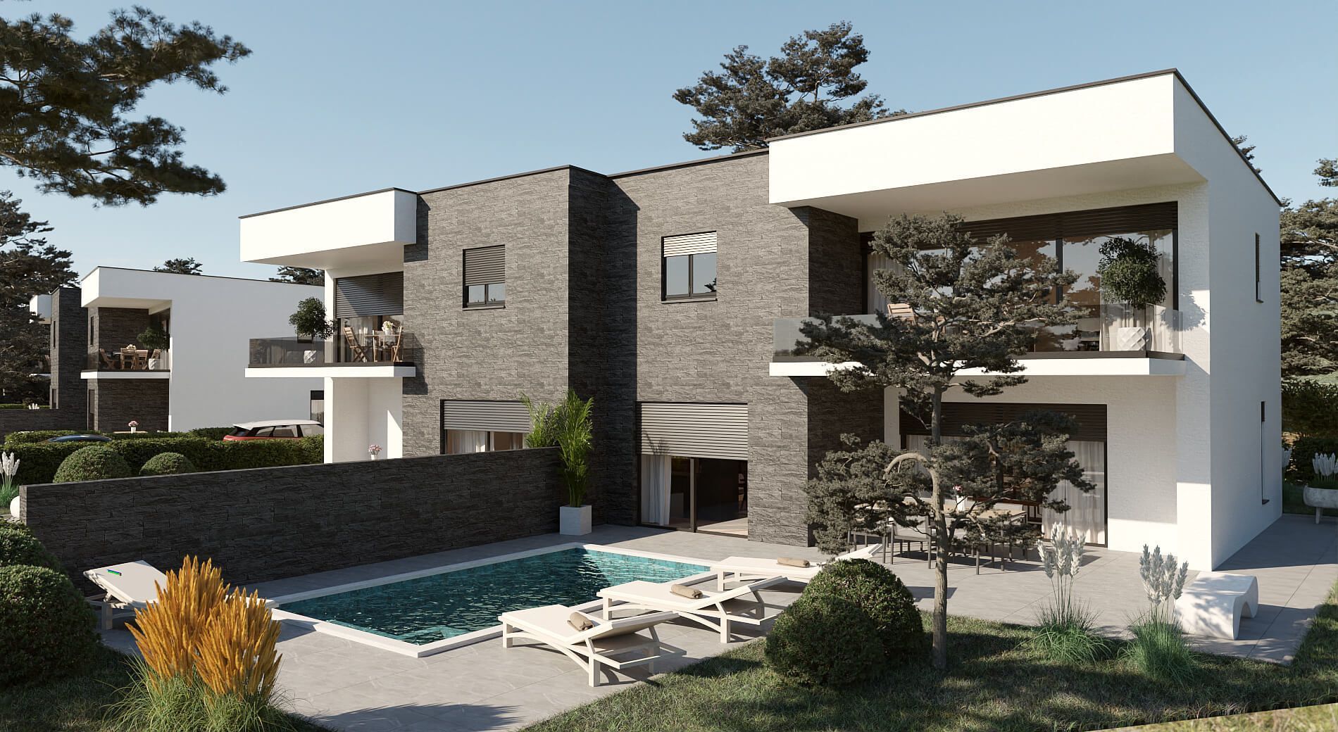 KRALJEVICA – Doppelhaushälfte mit Pool in Meeresnähe! Wir vermitteln den exklusiven Verkauf eines Projekts mit luxuriösen Doppelhaushälften in Kraljevica, nur wenige Gehminuten vom Meer entfernt! In ruhiger Lage entstehen insgesamt sechs Doppelhaushälften, also zweistöckige Wohneinheiten. Jede Einheit ist nach modernsten Baustandards errichtet und verfügt über eine Terrasse sowie einen Pool, dessen Betrieb nach Wunsch des Käufers vollautomatisch gesteuert werden kann. Die Villen bieten zwei zusätzliche Parkplätze, Meerblick vom ersten Stock, eine hochwertige Ausstattung und das Meer, das nur etwa hundert Meter entfernt ist. Wir legen Wert auf die mögliche Energieunabhängigkeit jeder Wohneinheit dank ihrer hohen Energieeffizienz und eines Designs, das die Nachrüstung mit einer einfachen Photovoltaikanlage zur Stromerzeugung oder Solarwarmwasserbereitung ermöglicht. Jede der zweigeschossigen Wohneinheiten verfügt über eine Gesamtfläche von 151 m², jeweils mit eigenem Pool und Garten (die Doppelhaushälften haben einen eigenen Pool und Garten, die Größe variiert zwischen 140 m² und 350 m² – individuell festgelegt). Das Erdgeschoss jeder Villa besteht aus: Eingangshalle, Wohn-/Esszimmer, Gäste-WC, Treppenhaus, überdachter Terrasse und offener Terrasse mit Pool. Im Obergeschoss befinden sich: Flur, Hauptschlafzimmer mit eigenem Bad und großer Terrasse, zwei Doppelschlafzimmer und ein Gemeinschaftsbad. Die Fertigstellung ist für Sommer 2026 geplant. Die beiden verbleibenden Doppelhaushälften stehen noch zum Verkauf!