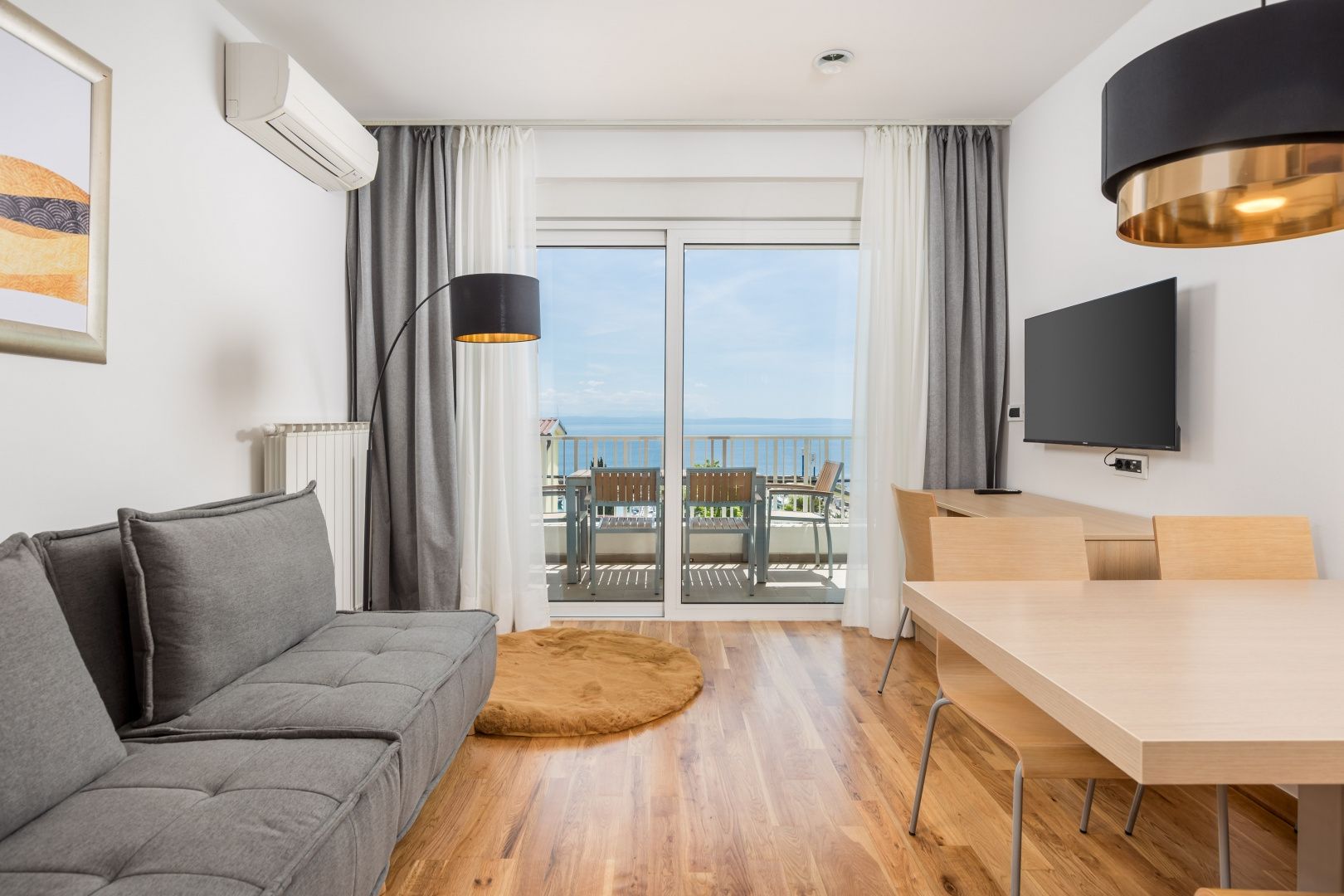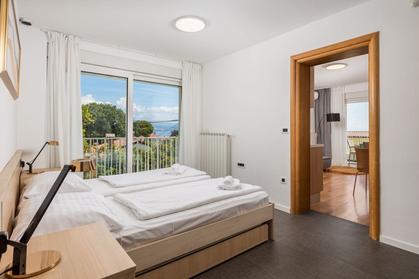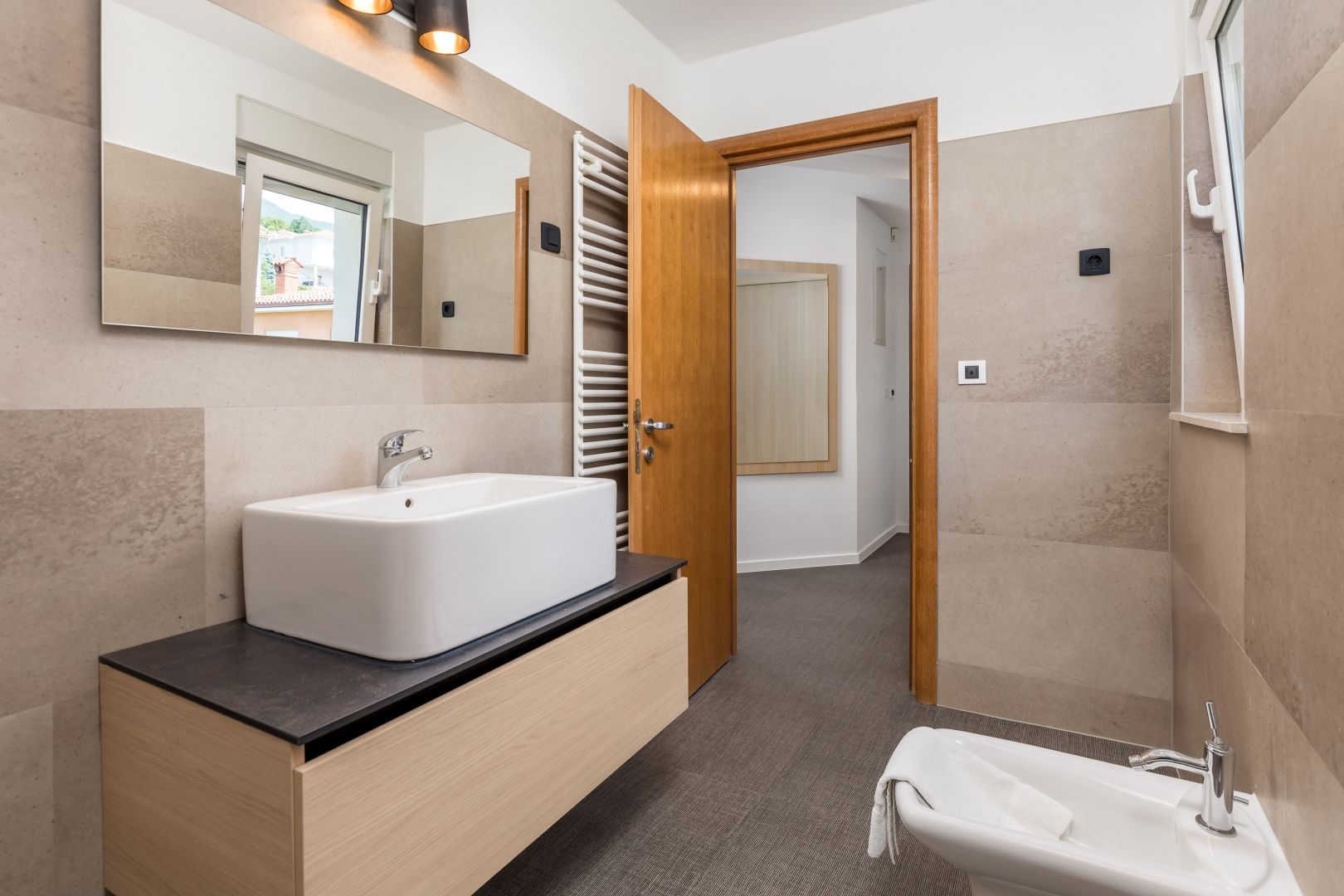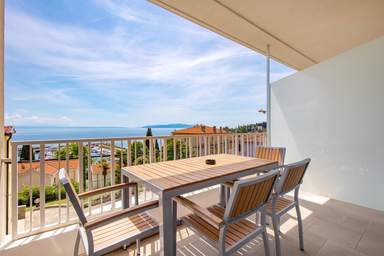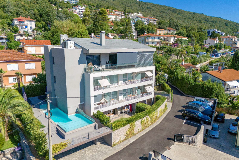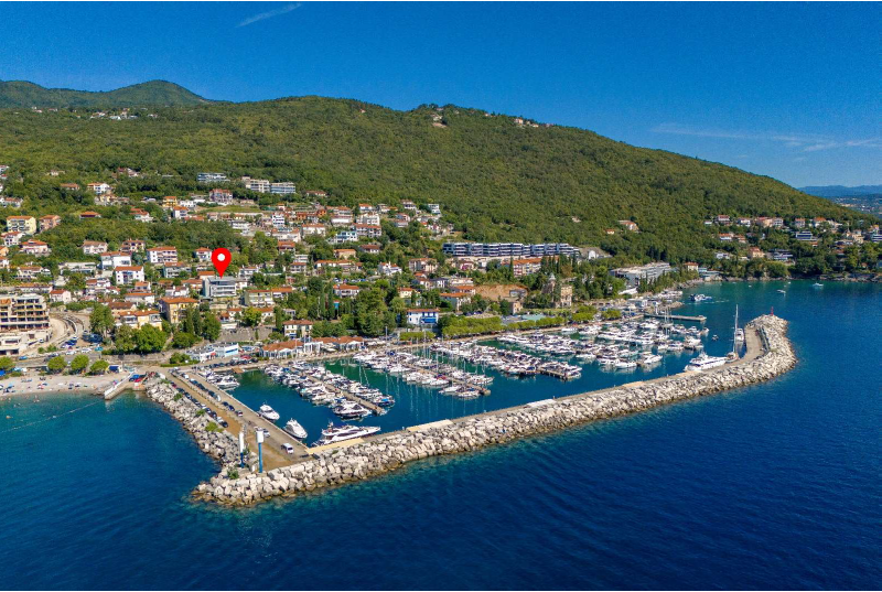 OPATIJA, IČIĆI – Moderne Wohnung (51 m²) zur Langzeitmiete mit Swimmingpool und Panoramablick auf das Meer In außergewöhnlicher Lage am Meer, in einem ruhigen Teil von Ičići bei Opatija, steht eine moderne und luxuriös ausgestattete Wohnung in einem Mehrfamilienhaus mit Aufzug zur Miete. Die Wohnung E5 befindet sich im 1. Stock und verfügt über zwei geräumige Terrassen – eine mit offenem und die andere mit seitlichem Blick auf das Meer und Ičići. Der Innenraum ist sorgfältig eingerichtet und funktional gestaltet. Er besteht aus einem Eingangsbereich mit Garderobe, einem Schlafzimmer, einem Badezimmer mit ebenerdiger Dusche, Bidet und WC sowie einem eleganten Wohnzimmer, das mit Küche und Esszimmer verbunden ist. Die Wohnung verfügt über eine Wärmepumpe zum Heizen und Kühlen. Eine Lüftung mit Wärmerückgewinnung sorgt das ganze Jahr über für optimale Temperatur und frische Luft. Ein videoüberwachter Parkplatz steht zur Verfügung. Die Mieter können außerdem den Außenpool nutzen, der mit den anderen Wohnungen im Gebäude geteilt wird. Monatsmiete: 950 € zzgl. Nebenkosten. Für eine Besichtigung kontaktieren Sie bitte einen unserer Makler – Beratung auf Deutsch möglich.