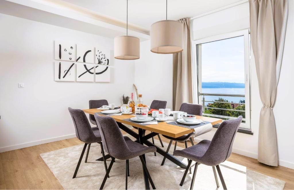 OPATIJA, IČIĆI – luxuriöses Apartment mit 2 Schlafzimmern + Wohnzimmer und Panoramablick auf das Meer Wir verkaufen diese schöne Luxuswohnung in einem hochwertigen Wohngebäude in Ičići. Bei der Wohnung handelt es sich grundsätzlich um eine Zweizimmerwohnung mit Wohnzimmer, die Nettowohnfläche beträgt 109m2, mit Miteigentumsanteilen und Garage sind es 121,7m2. Die Wohnung wurde im Jahr 2024 komplett renoviert und vollständig mit modernen Designermöbeln, Weißwaren und Haushaltsgeräten renommierter Marken möbliert und wird so verkauft. Die Wohnung ist mit einer Fußbodenheizung und einer Klimaanlage ausgestattet und verfügt über zwei Stellplätze, einen in der Garage und einen im Freien. Erstklassiges Anwesen, das jede Aufmerksamkeit verdient, saubere Eigentumsverhältnisse, ordentliche Dokumentation. berechnet