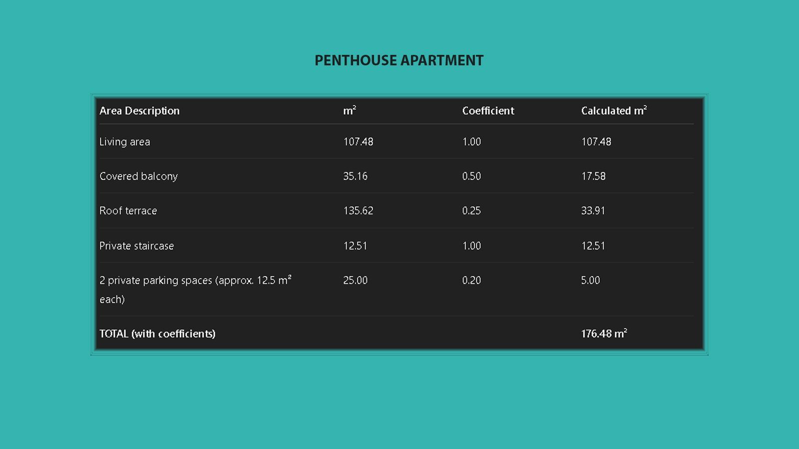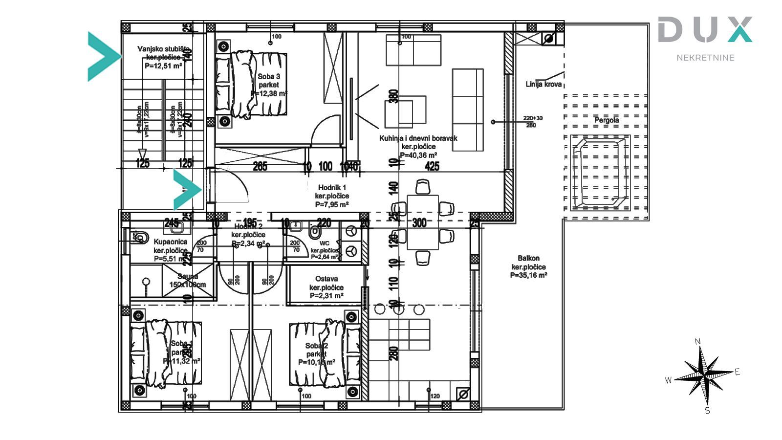 OPATIJA, IKA – Penthouse mit Panoramablick, riesiger Dachterrasse und erstklassiger Ausstattung Wir bieten Ihnen ein exklusives Penthouse in einem Neubau in außergewöhnlicher Lage in Ika zum Kauf an, nur 10 Gehminuten vom ersten Strand und der Uferpromenade entfernt. Diese einzigartige Immobilie befindet sich im obersten Stockwerk des Gebäudes und verfügt über einen separaten Zugang über eine eigene Außentreppe. Das Apartment ist für einen komfortablen und hochwertigen Aufenthalt das ganze Jahr über konzipiert und bietet gleichzeitig Luxus, Funktionalität und absolute Privatsphäre – eine Kombination, die man nur selten findet. Das Apartment besteht aus einem großzügigen Wohnzimmer mit Küche und Essbereich (40,36 m²), drei Schlafzimmern, zwei Badezimmern, zwei Fluren, einem Hauswirtschaftsraum und einem überdachten Balkon (35,16 m²). Zusätzlich verfügt das Apartment über eine geräumige Dachterrasse (135,62 m²), die als Erweiterung des Wohnraums unter freiem Himmel konzipiert wurde. Die außergewöhnliche Dachterrasse bietet eine ca. 30 m² große Pergola, Platz für eine Sommerküche mit allen notwendigen Anschlüssen sowie einen Whirlpool oder Pool. So wird die Terrasse zu einer privaten Oase, die zum Genießen, geselligen Beisammensein und Entspannen mit freiem Meerblick einlädt. Die Wohnung ist mit Fußbodenheizung, einer Wärmepumpe und einer Split-Klimaanlage ausgestattet, die ganzjährigen Komfort garantiert. Dank der durchdachten Raumaufteilung bietet die Wohnung ausreichend Platz für einen komfortablen Aufenthalt von bis zu sechs Personen. Zur Wohnung gehören außerdem zwei private Parkplätze. Die Gesamtfläche beträgt 176,48 m² (einschließlich Balkon, Dachterrasse und Parkplätzen). Diese Kombination aus Größe, Ausstattung, Lage und hochwertiger Verarbeitung stellt eine außergewöhnliche Gelegenheit auf dem Immobilienmarkt und eine Rarität in diesem Teil der Riviera von Opatija dar. Die Entfernung zum Meer beträgt 500 Meter Luftlinie, der Yachthafen ACI Ičići ist nur wenige Autominuten entfernt. Das Zentrum von Opatija erreichen Sie in ca. 10 Minuten mit dem Auto. Wohnfläche: 107,48 m² Überdachter Balkon: 35,16 m² (50 % = 17,58 m²) Dachterrasse: 135,62 m² (25 % = 33,91 m²) Privates Treppenhaus: 12,51 m² 2 private Parkplätze: ca. 25,00 m² (20 % = 5,00 m²) Gesamtfläche: 176,48 m² Für weitere Informationen und zur Vereinbarung eines Besichtigungstermins kontaktieren Sie bitte den Makler. Die geplante Fertigstellung ist Sommer 2026.