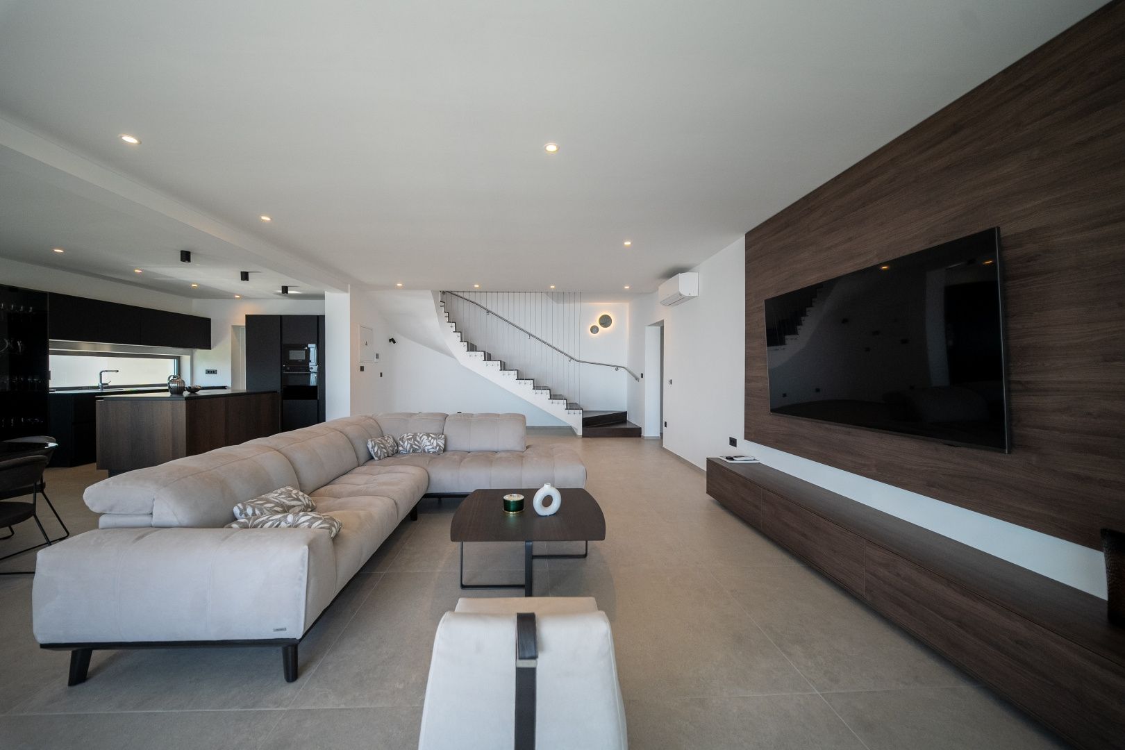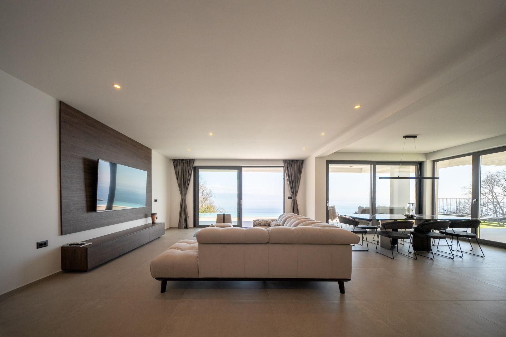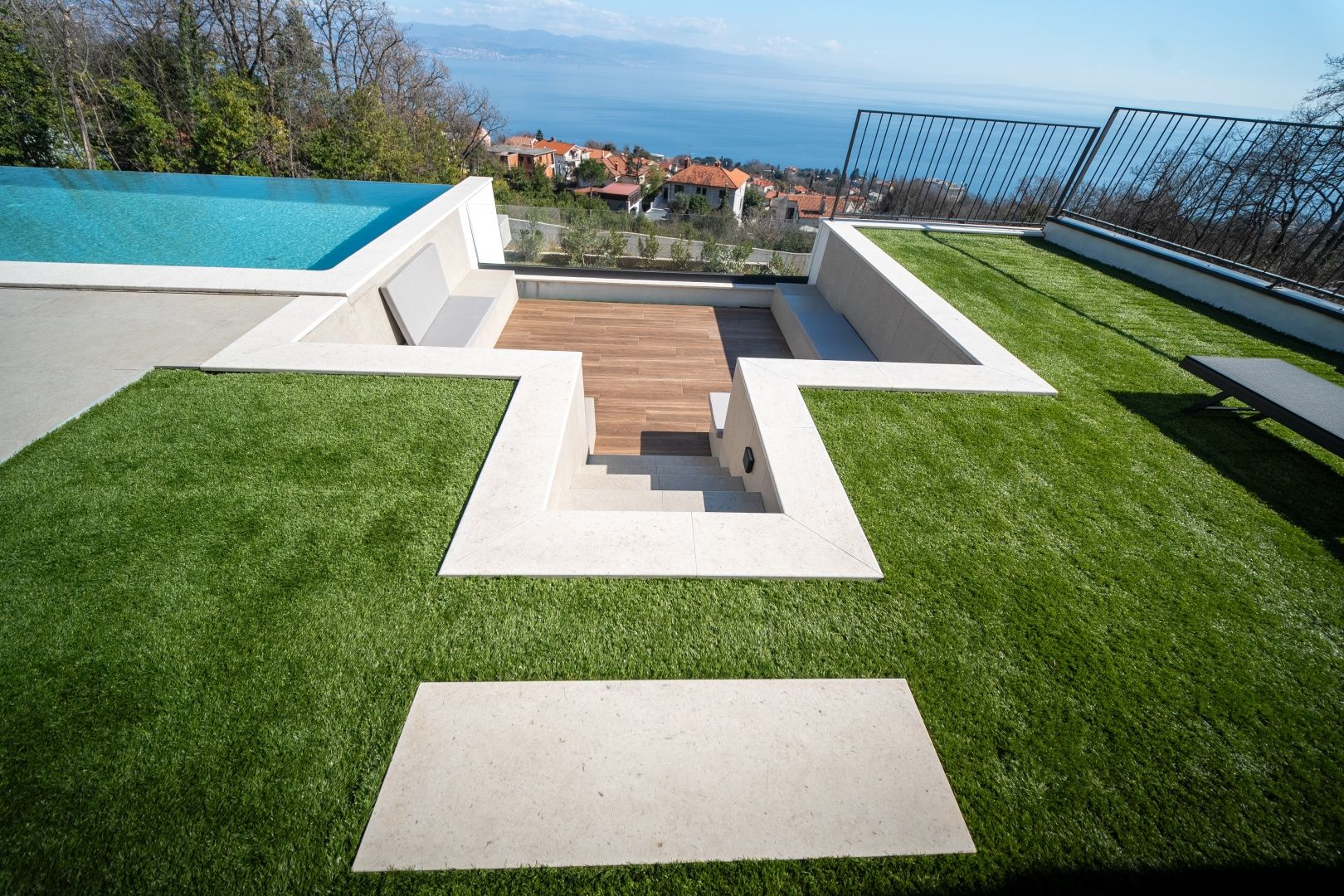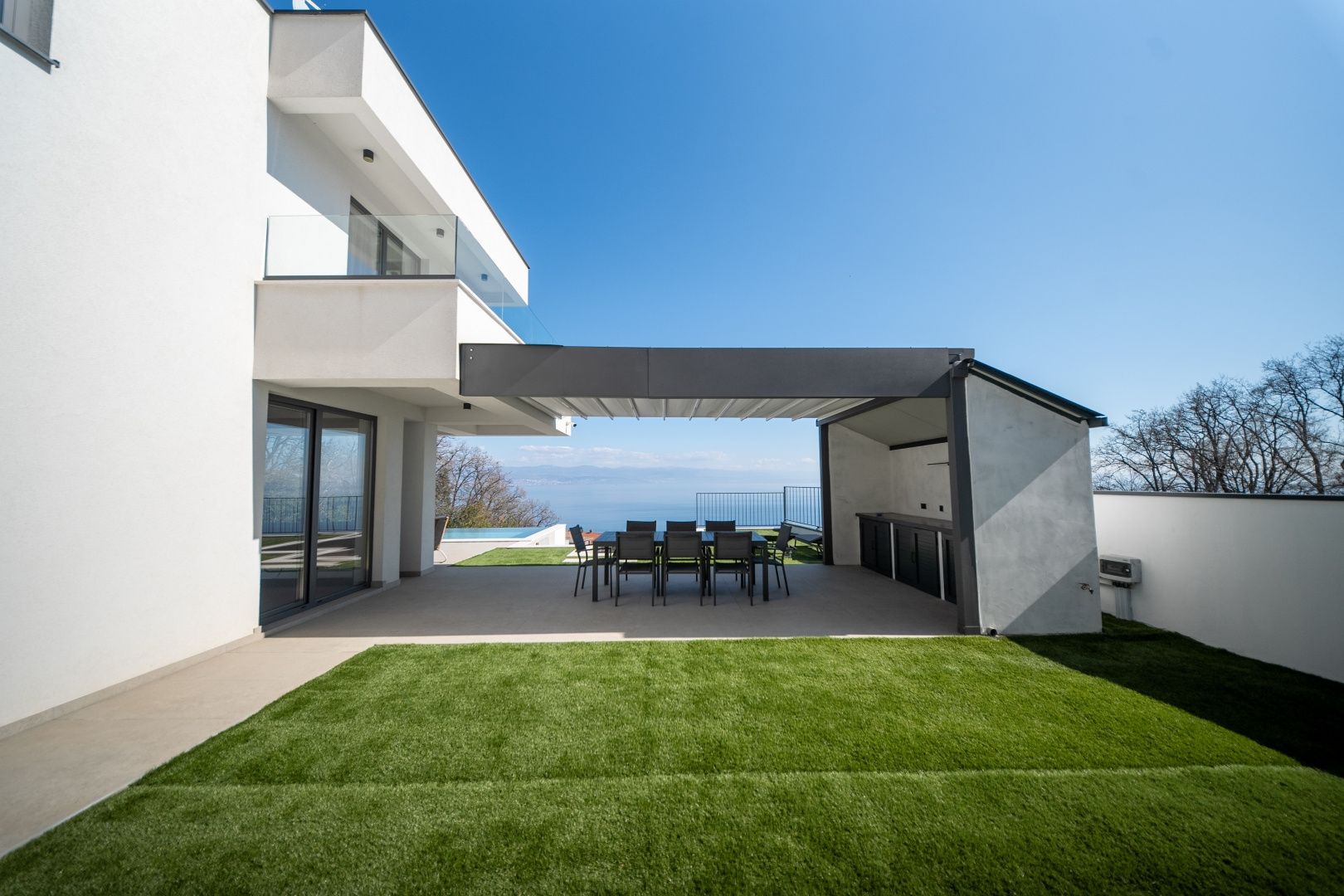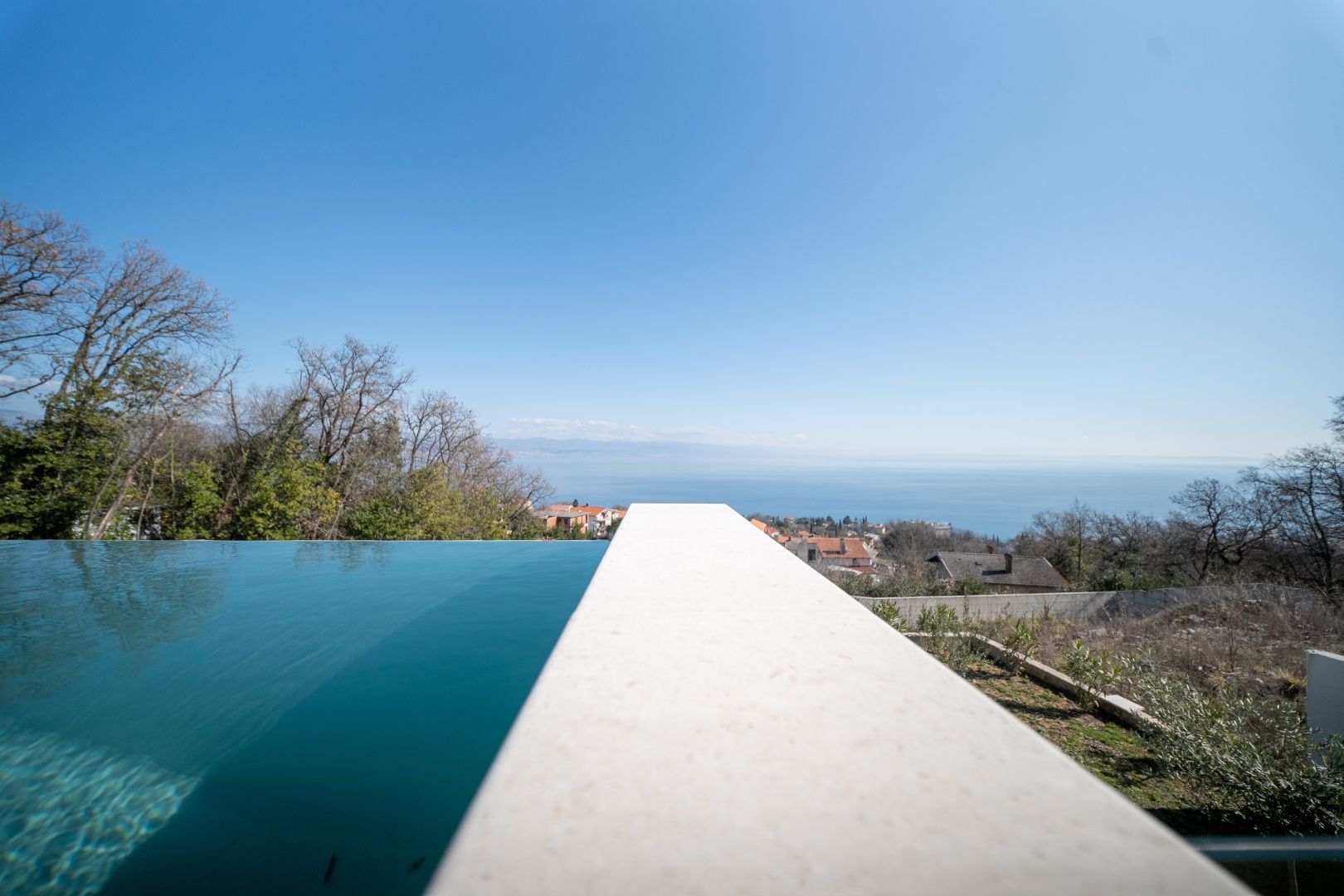 OPATIJA, LOVRAN – Hochwertiger Neubau mit Pool und Panoramablick Wir freuen uns, Ihnen eine luxuriöse Villa auf einem 900 m² großen Grundstück präsentieren zu dürfen. Der geschmackvoll gestaltete Garten bietet eine Terrasse mit einem zehn Meter langen Infinity-Pool, WC, Feuerstelle und Sommerküche. Auf derselben Ebene befindet sich ein großzügiger, offener Wohnbereich mit Küche, Esszimmer, Wohnzimmer und einem Schlafzimmer mit Bad. Im ersten Stock befinden sich drei weitere Schlafzimmer. Selbstverständlich verfügt jedes Schlafzimmer über ein eigenes Bad und einen Balkon mit freiem Panoramablick. Die Villa ist hochwertig gebaut und luxuriös ausgestattet. Alle verwendeten Materialien, Boden- und Wandbeläge entsprechen höchsten Standards. Dieses einzigartige Anwesen an der Riviera von Opatija setzt neue Maßstäbe für Luxus. Es ist ideal für ein luxuriöses Familienleben, eignet sich aber auch hervorragend als Investition im Bereich des exklusiven Tourismus. Die Villa ist nach Süden ausgerichtet und bietet einen atemberaubenden Panoramablick über die gesamte Kvarner Bucht und die vorgelagerten Inseln. Es liegt 800 Meter Luftlinie vom Meer entfernt, mit dem Auto sind es 1,5 km (ca. 3 Minuten). Auf dem Grundstück kann ein Nebengebäude mit bis zu 50 m² errichtet werden. Lovran ist eine Stadt mit einer langen und reichen Geschichte und einer jahrhundertealten Tourismustradition. Sie wurde nach dem Lorbeer (Laurus nobilis) benannt, der in der Stadt und ihrer Umgebung reichlich wächst. Sehr geehrte Kaufinteressenten, wir freuen uns über Ihr Interesse an den Immobilien in unserem Angebot. Für weitere Informationen und zur Vereinbarung eines Besichtigungstermins kontaktieren Sie uns bitte – eine Beratung auf Deutsch ist möglich. Die Maklergebühr richtet sich nach unseren Allgemeinen Geschäftsbedingungen, die Sie auf unserer Website finden: www.dux-nekretnine.hr/opci-uvjeti-poslovanja