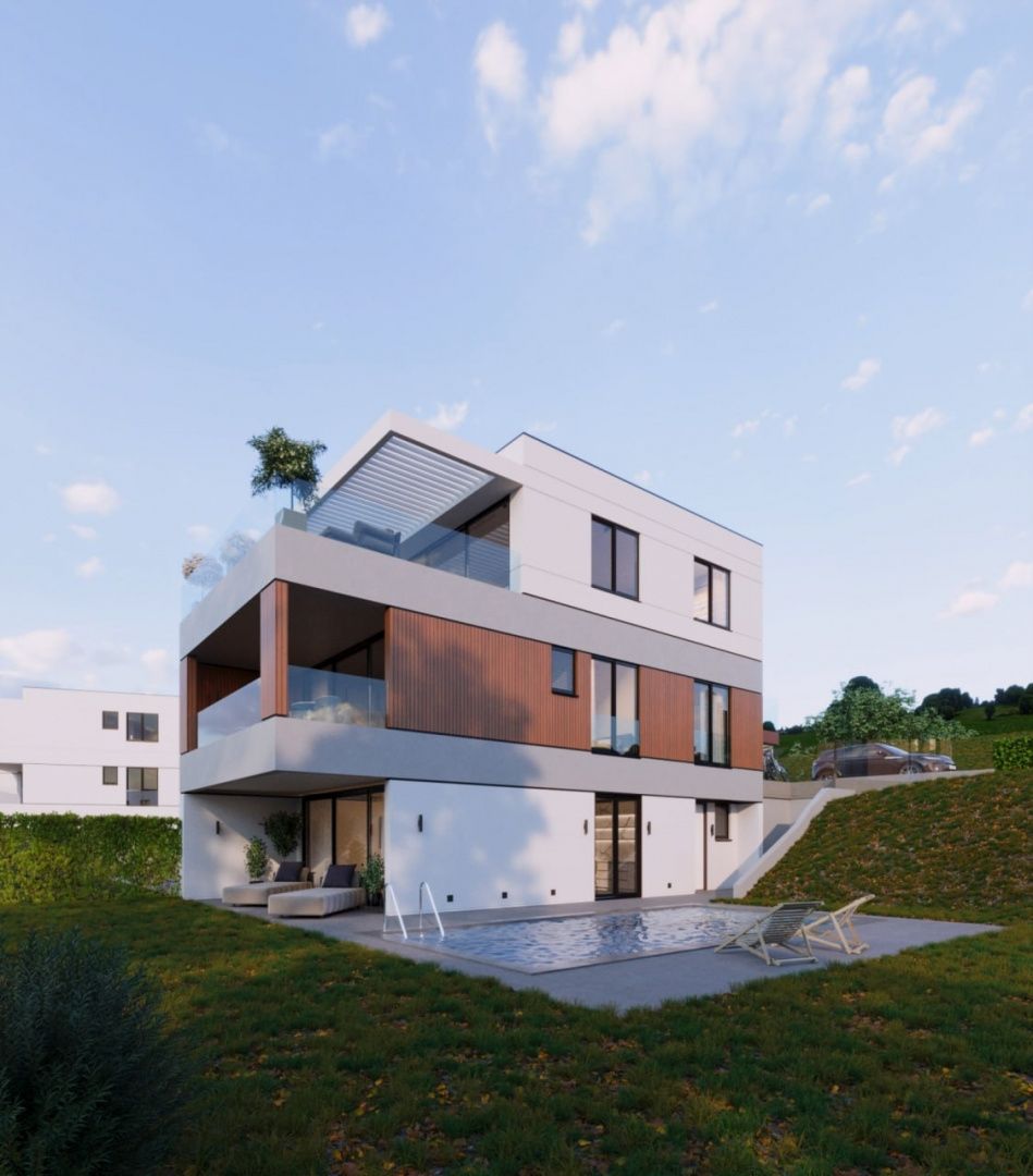 OPATIJA, LOVRAN – Luxuriöses Penthouse in einer exklusiven Wohnanlage mit Panoramablick aufs Meer Im exklusiven Verkauf von Dux präsentieren wir Ihnen eine einzigartige Gelegenheit: ein Neubau in Lovran, nahe Opatija. Dieses Penthouse befindet sich in einer ruhigen Straße oberhalb des Strandes von Lovran und bietet einen atemberaubenden Panoramablick aufs Meer. Es liegt in einem Haus mit drei Wohneinheiten und verfügt über einen separaten Eingang. Die Anlage ist umzäunt und bietet einen exklusiven Lifestyle mit Luxus, Panoramablick aufs Meer, Swimmingpool, Sonne und hochwertiger Bauweise. Das Penthouse erstreckt sich über zwei Etagen. Im Erdgeschoss befindet sich ein offener Wohnbereich mit angrenzender Küche und Essbereich. Hier finden Sie außerdem ein Gäste-WC, einen Ankleideraum und einen Hauswirtschaftsraum. Im ersten Stock befinden sich drei Schlafzimmer, ein Badezimmer und ein zusätzliches WC. Beide Etagen verfügen über eine überdachte Terrasse mit herrlichem Meerblick. Zur Wohnung gehören zwei Parkplätze und ein eigener Swimmingpool – ein weiterer Pluspunkt dieser Immobilie. Die Wohnung wird schlüsselfertig verkauft und ist somit sofort bezugsfertig. Besonders hervorzuheben sind die hohen Decken, die großen Glasfronten mit einem atemberaubenden Panoramablick auf das Meer, die Fußbodenheizung mit Wärmepumpe, die hochwertigen Keramikfliesen, Parkettböden und Sanitäreinrichtungen, die Aluminiumfenster und -türen, der beheizte Swimmingpool, der üppig bepflanzte Garten und die Bewässerungsanlage. Die Lage ist fantastisch: Das Zentrum von Lovran und der erste Strand sind über die Landstraße in nur 5 Minuten erreichbar. Die Gebäude befinden sich unterhalb dieser Straße in einer verkehrsberuhigten Zone, was absolute Ruhe garantiert. Das Zentrum von Opatija ist in 12 Minuten mit dem Auto zu erreichen. Dies ist eine ideale Gelegenheit für eine Kapitalanlage oder zum Wohnen an der Riviera von Opatija – perfekt als Eigenheim oder zur luxuriösen Ferienvermietung. Für eine Besichtigung kontaktieren Sie bitte einen unserer vertrauenswürdigen Makler. Eine Beratung auf Deutsch ist möglich.