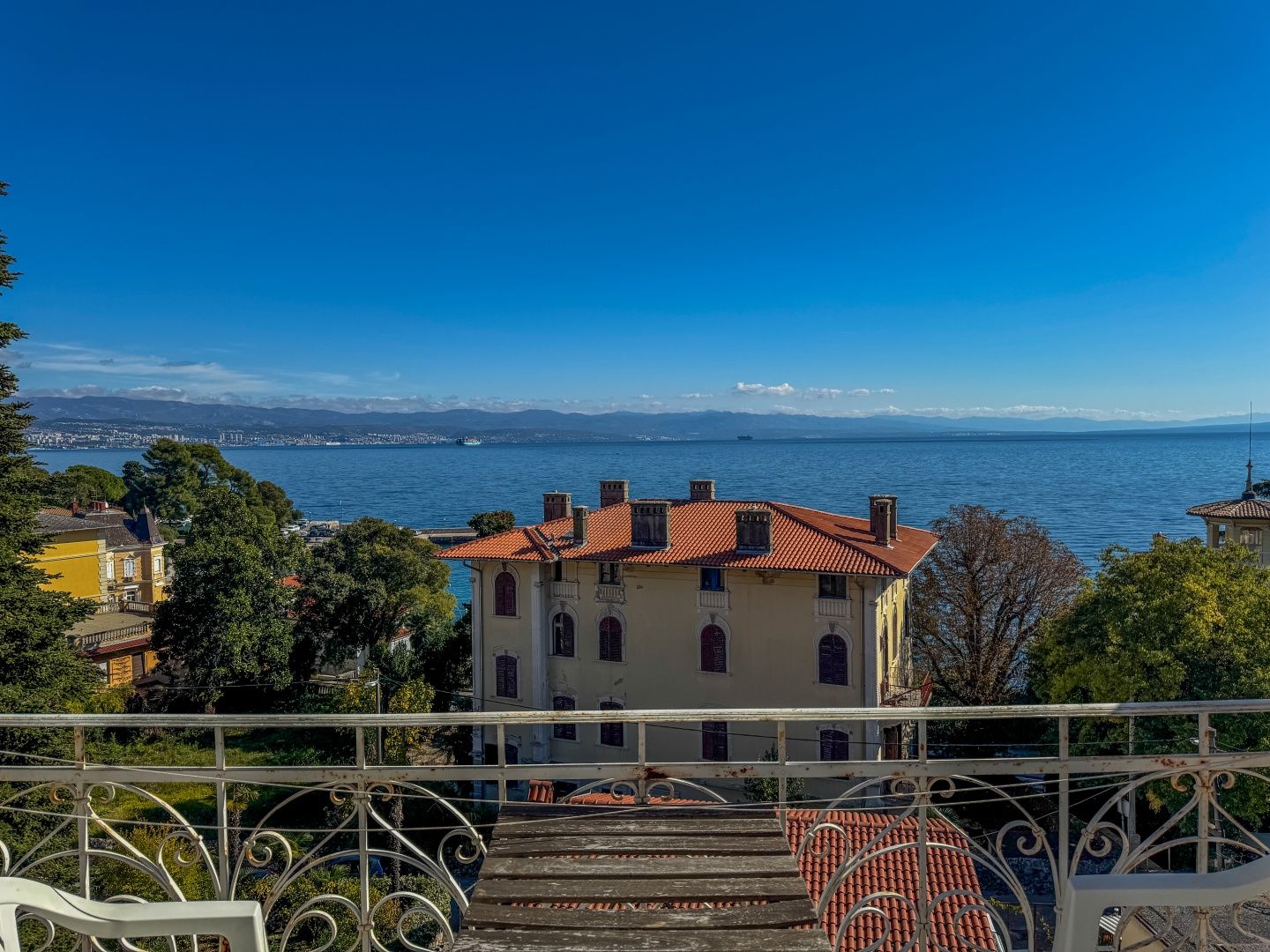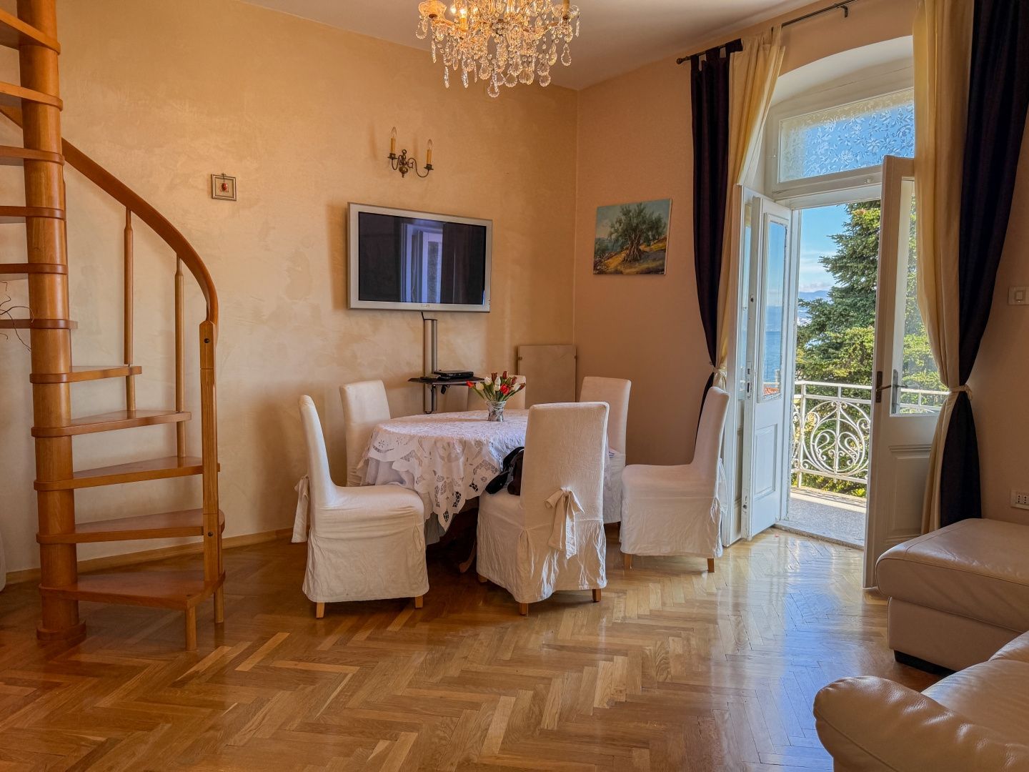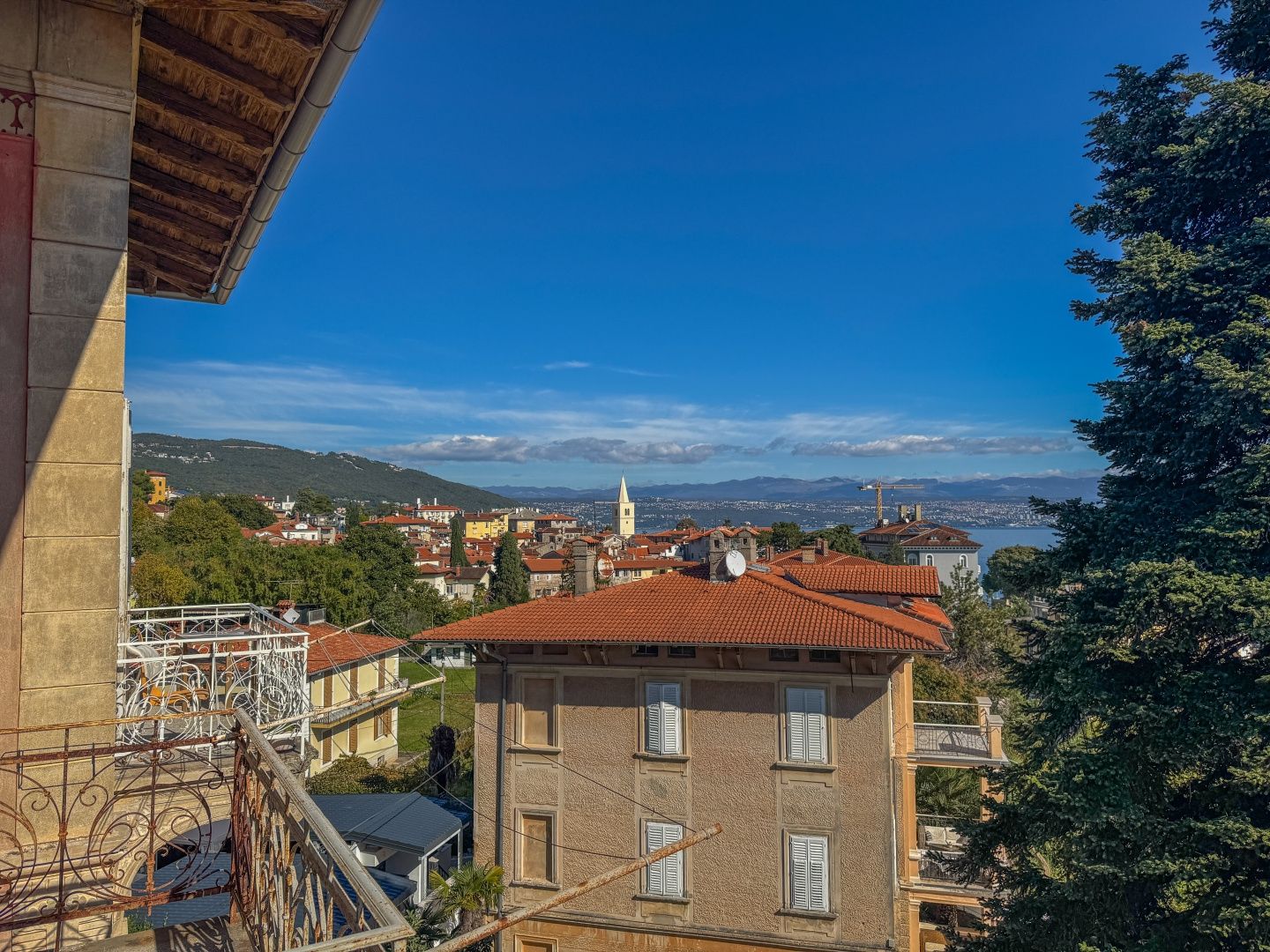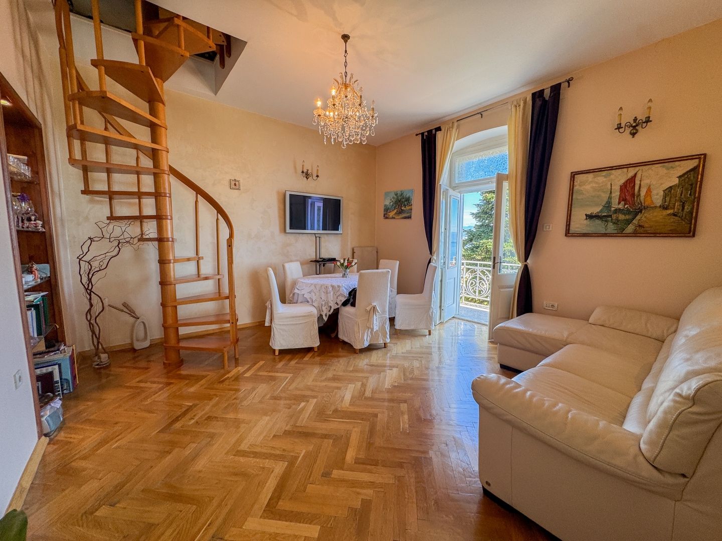 OPATIJA, LOVRAN – Eine einmalige Gelegenheit: Historische Villa-Wohnung in zweiter Reihe zum Meer mit Terrasse und Meerblick Exklusiv im Angebot von DUX präsentieren wir Ihnen eine Wohnung in zweiter Reihe zum Meer in einer historischen Villa in einer der besten Straßen von Lovran (bei Opatija). Die Wohnung befindet sich im 3. Obergeschoss einer österreichisch-ungarischen Villa und besteht aus Flur, Küche, großem Badezimmer mit Fenster, geräumigem Schlafzimmer nach Süden mit eigenem Balkon und Meerblick sowie einem offenen Wohnbereich mit Zugang zu einem weiteren Balkon mit Panoramablick auf das Meer. Eine Wendeltreppe führt zum Dachgeschoss mit einem zweiten Schlafzimmer und eigenem Bad. Wohnung und Anwesen befinden sich in einem guten und funktionalen Zustand. Die Schreinerarbeiten sind original und aus Holz, ebenso die Balkongeländer. Die hohen Decken unterstreichen die Authentizität dieser Immobilie. Dies ist eine fantastische Investitionsmöglichkeit und die ideale Wahl für Liebhaber historischer Gebäude. Die Villa verfügt über einen 400 m² großen Gemeinschaftsgarten. Das Meer ist nur wenige Schritte entfernt. Auch das Zentrum von Lovran und die berühmte Strandpromenade Lungomare sind bequem zu Fuß erreichbar. Für eine Besichtigung rufen Sie den Makler gerne an – eine Beratung auf Deutsch ist möglich.