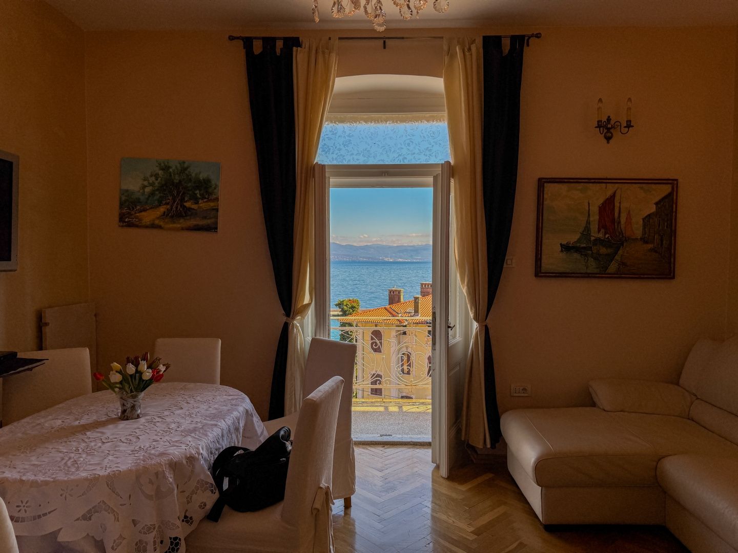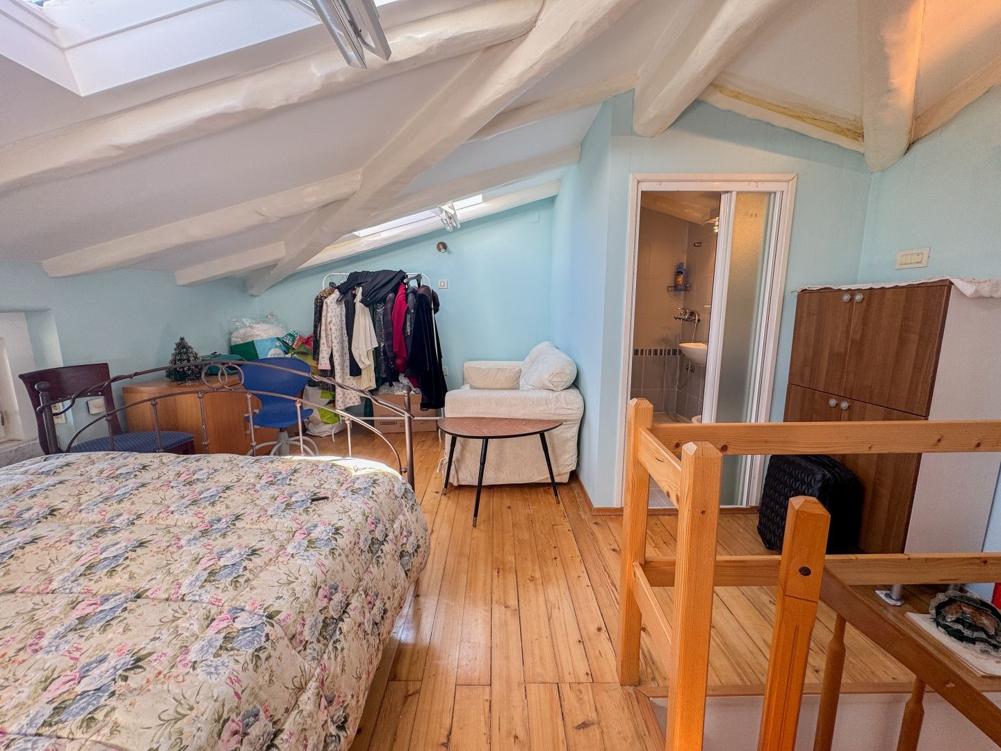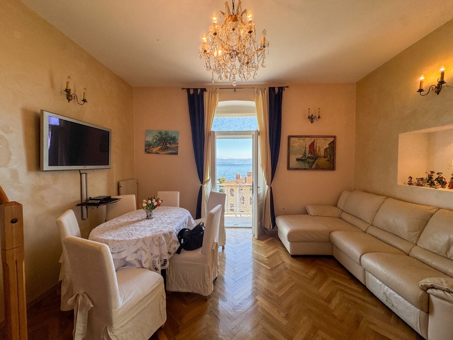 OPATIJA, LOVRAN – Eine einmalige Gelegenheit: Historische Villa-Wohnung in zweiter Reihe zum Meer mit Terrasse und Meerblick Exklusiv im Angebot von DUX präsentieren wir Ihnen eine Wohnung in zweiter Reihe zum Meer in einer historischen Villa in einer der besten Straßen von Lovran (bei Opatija). Die Wohnung befindet sich im 3. Obergeschoss einer österreichisch-ungarischen Villa und besteht aus Flur, Küche, großem Badezimmer mit Fenster, geräumigem Schlafzimmer nach Süden mit eigenem Balkon und Meerblick sowie einem offenen Wohnbereich mit Zugang zu einem weiteren Balkon mit Panoramablick auf das Meer. Eine Wendeltreppe führt zum Dachgeschoss mit einem zweiten Schlafzimmer und eigenem Bad. Wohnung und Anwesen befinden sich in einem guten und funktionalen Zustand. Die Schreinerarbeiten sind original und aus Holz, ebenso die Balkongeländer. Die hohen Decken unterstreichen die Authentizität dieser Immobilie. Dies ist eine fantastische Investitionsmöglichkeit und die ideale Wahl für Liebhaber historischer Gebäude. Die Villa verfügt über einen 400 m² großen Gemeinschaftsgarten. Das Meer ist nur wenige Schritte entfernt. Auch das Zentrum von Lovran und die berühmte Strandpromenade Lungomare sind bequem zu Fuß erreichbar. Für eine Besichtigung rufen Sie den Makler gerne an – eine Beratung auf Deutsch ist möglich.