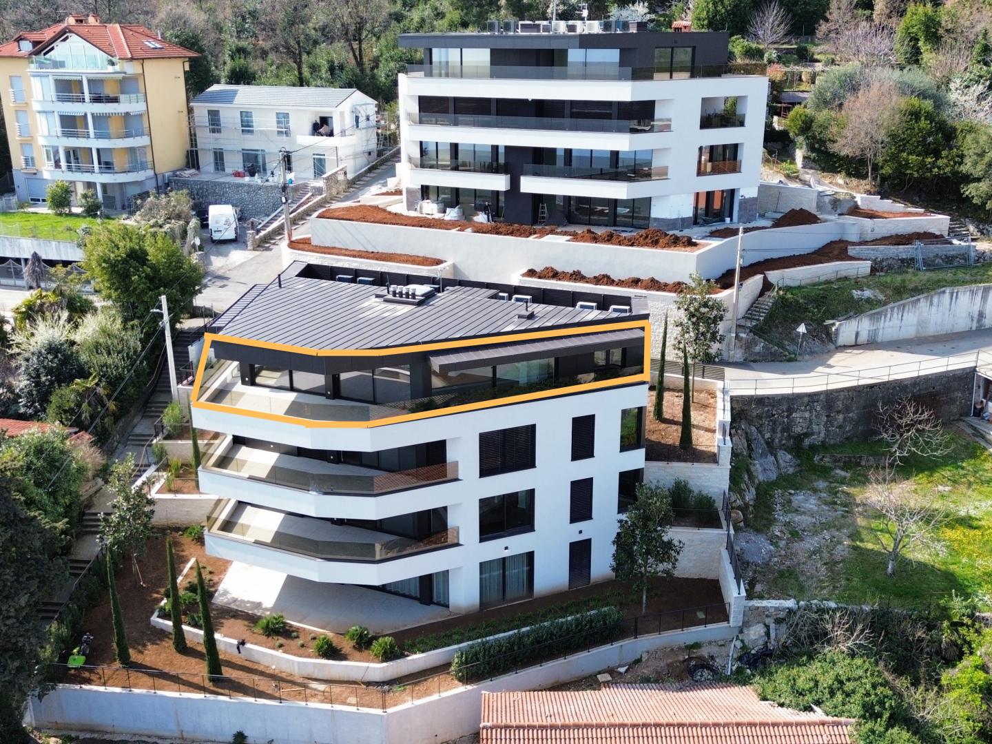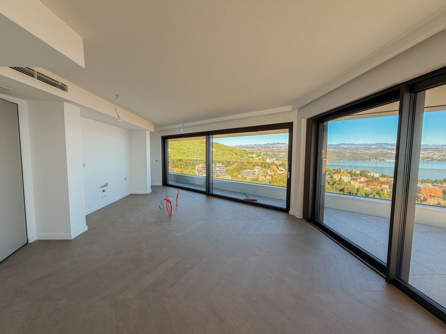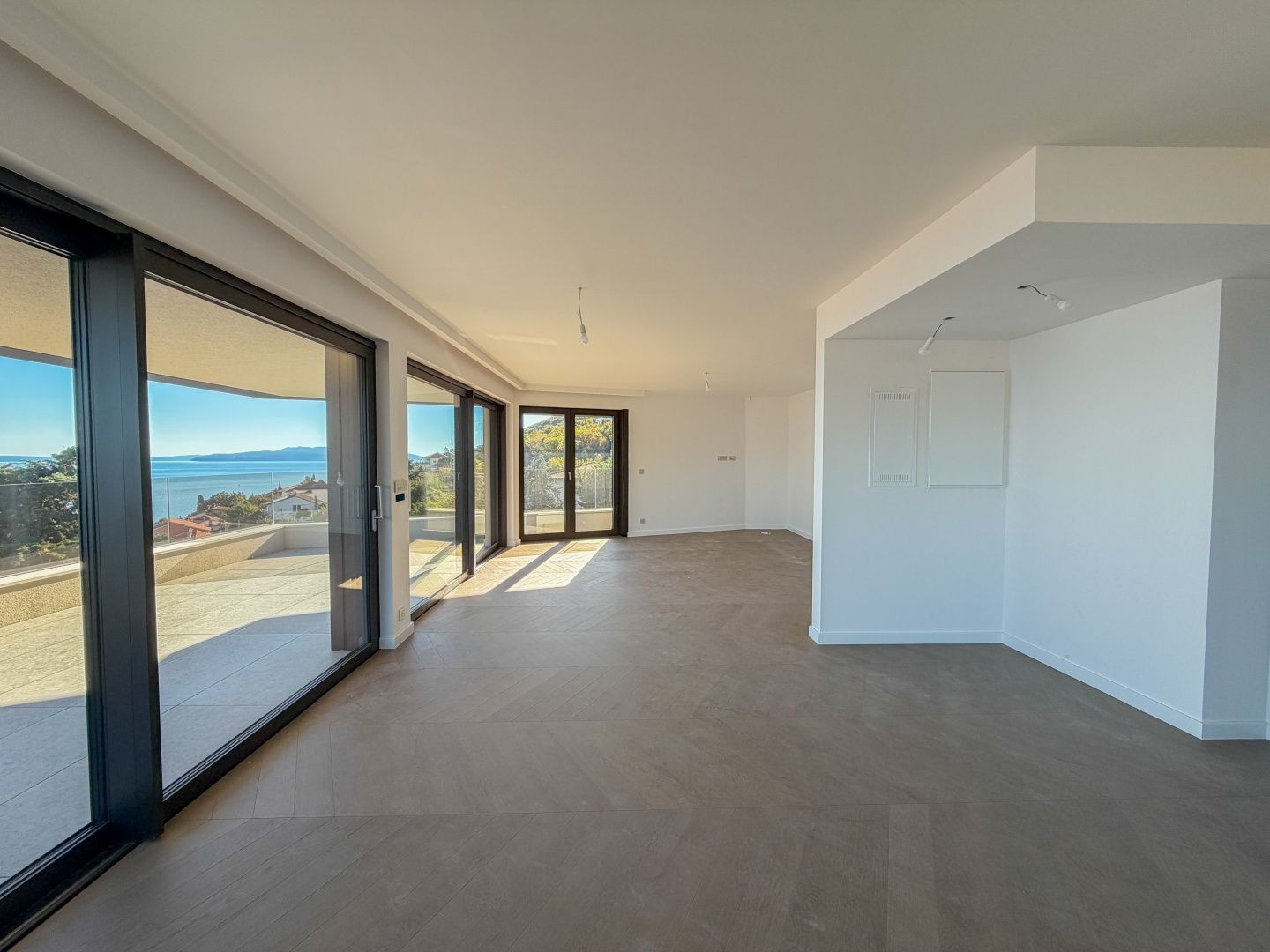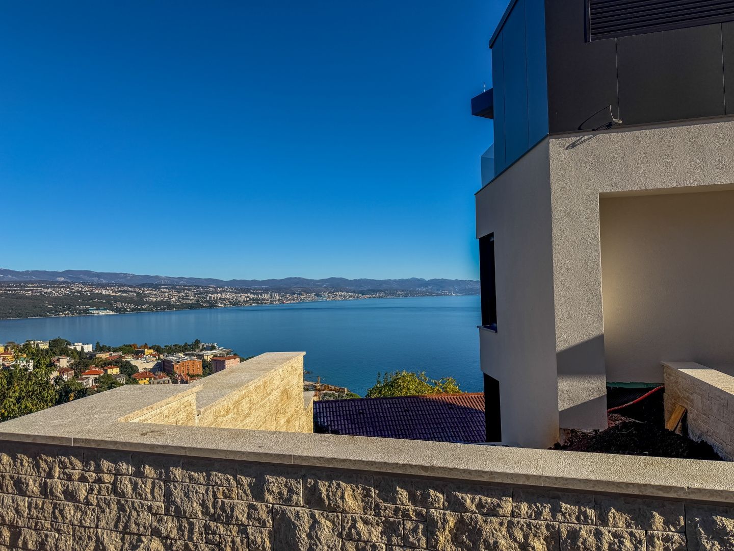 OPATIJA, ZENTRUM – Luxus-Penthouse in einem Neubau mit Wellnessbereich, Fitnessstudio und Garage Exklusive Gelegenheit bei Dux Real Estate: Penthouse mit 143 m² Wohnfläche, davon 21 m² überdachte und 4 m² offene Terrasse. Die Terrasse bietet einen traumhaften Meerblick. Das Penthouse besteht aus: Eingangsbereich, Flur, Wohnzimmer mit Küche, 2 Schlafzimmern, 2 Badezimmern und einem Abstellraum. Die Terrasse ist sowohl von den Schlafzimmern als auch vom Wohnzimmer aus zugänglich. Zur Wohnung gehören 2 Parkplätze, die auf Anfrage zusätzlich angemietet werden können. Es besteht die Möglichkeit, weitere Parkplätze zu erwerben. Die Wohnung verfügt außerdem über einen Abstellraum und einen Außenstellplatz. Dieses moderne Neubaugebäude bietet erstklassige Bauqualität und Ausstattung: - Luftrückgewinnung mit Pollen- und Allergenfilter - Fußbodenheizung in allen Räumen und energieeffiziente Heizung über Wärmepumpen - Fenster und Türen aus braunem Aluminium mit dreifach verglastem IZO-Glas - Smart-Home-System mit Zugangskontrolle (ABB Free@home) - Sanitäreinrichtungen von Hansgrohe, Eichenparkett und Sicherheitstüren - elektrische Aluminium-Jalousien, LED-Beleuchtung und Videoüberwachung der Gemeinschaftsbereiche - gemeinschaftlicher Fitness- und Wellnessbereich - 260 cm Deckenhöhe und ein leiser OTIS-Aufzug mit luxuriöser Kabine Eine perfekte Gelegenheit, eine Luxuswohnung im Herzen von Opatija zu erwerben – in einem Neubau, der Komfort, Technologie und eleganten mediterranen Stil mit einem atemberaubenden Ausblick vereint. Für eine Besichtigung kontaktieren Sie bitte einen unserer vertrauenswürdigen Makler – Beratung auf Deutsch möglich.