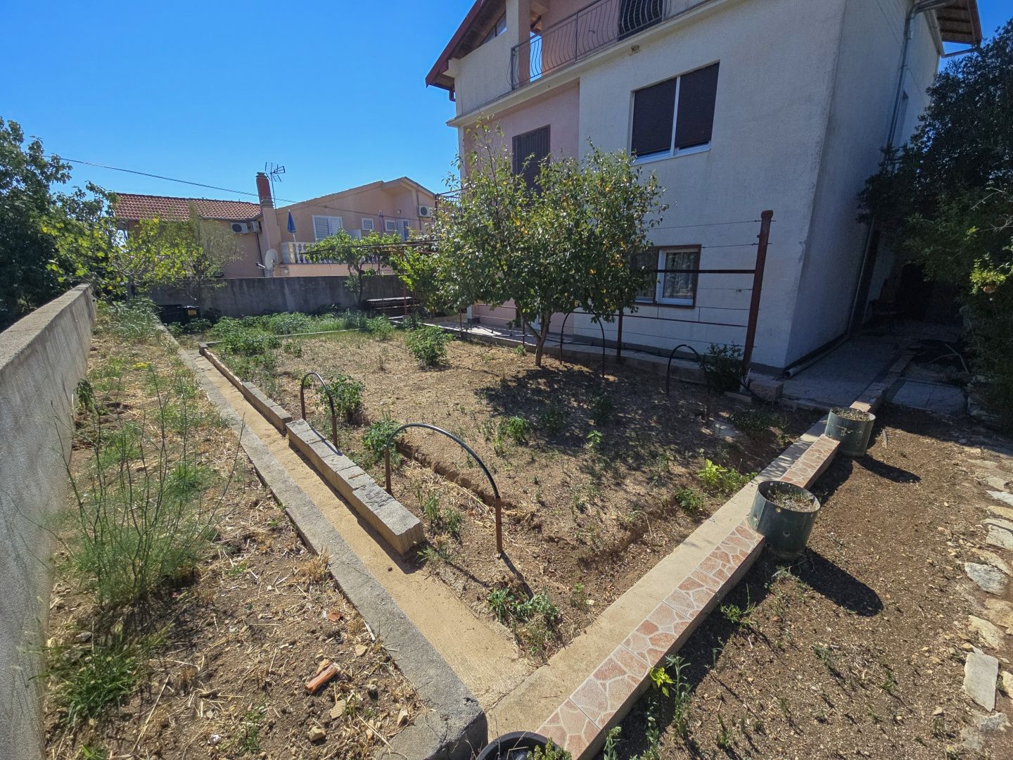 POLAČA, KAKMA – Großzügiges Haus mit drei Apartments in ruhiger Lage Polača ist ein beschauliches dalmatinisches Dorf in Ravni Kotari, bekannt für seine natürliche Schönheit, fruchtbaren Felder und die entspannte Familienatmosphäre. Zur Gemeinde Polača gehört auch Kakma, ein kleines, ruhiges Dorf, umgeben von Weinbergen und Olivenhainen. Es hat sich seinen ländlichen Charme bewahrt und bietet absolute Ruhe bei gleichzeitig guter Anbindung an Biograd und Zadar. Kakma entwickelt sich zu einem Ziel für nachhaltigen Landtourismus: Besucher können hier einheimische Weine, Olivenöl und hausgemachte Köstlichkeiten genießen, die von lokalen Erzeugern bei Verkostungen und hochwertigen Produkten angeboten werden. Auch Radtouren rund um Ravni Kotari bieten die Möglichkeit, bezaubernde Landschaften, kulturelle Geschichten und den friedlichen, kontinentalen Rhythmus des dalmatinischen Hinterlandes zu erleben. Unweit des malerischen Dorfzentrums steht ein äußerst geräumiges Haus zum Verkauf. Das Haus besteht aus drei voll ausgestatteten Apartments, die durch eine Innentreppe miteinander verbunden sind. Die gesamte Wohnfläche beträgt 275 m². Das Haus erstreckt sich über drei Etagen. Im Erdgeschoss befindet sich eine luxuriöse 122 m² große Wohnung mit zwei Schlafzimmern, einer geräumigen Wohnküche, einem Badezimmer, zwei Abstellräumen und einer großen Garage (27 m²). Im ersten Obergeschoss befindet sich eine helle 75 m² große Wohnung mit zwei komfortablen Schlafzimmern, einem Badezimmer, einer Wohnküche, drei Balkonen (je ca. 7 m²) und einer beeindruckenden 31 m² großen Terrasse, die ein Gefühl von Weite und Privatsphäre vermittelt. Im zweiten Obergeschoss befindet sich eine 78 m² große Wohnung mit drei geschlossenen Loggien, zwei Schlafzimmern, einer Küche, einem Esszimmer, einem Wohnzimmer und einem zusätzlichen Abstellraum – ein sehr komfortabler und funktionaler Wohnraum. Das Haus ist technisch hervorragend ausgestattet. Das Dach besteht aus einer robusten Metallkonstruktion, die Langlebigkeit und minimalen Wartungsaufwand garantiert. Jede Wohnung verfügt über eine Klimaanlage und einen Stromzähler. Der Stromanschluss ist dreiphasig und von maximaler Stärke, was den reibungslosen Betrieb aller Geräte gewährleistet. Ein weiterer Pluspunkt ist die bereits erfolgte Vermietungsregistrierung des Hauses. Die beiden oberen Wohnungen verfügen über eine Drei-Sterne-Kategorisierung. Das Haus befindet sich auf einem 460 m² großen Grundstück, die Grünfläche umfasst 281 m² und schafft so ein großzügiges und sehr angenehmes Außenambiente. Diese Raumaufteilung bietet ausreichend Platz für den Bau eines eleganten Swimmingpools, die Gestaltung eines mediterranen Gartens, die Schaffung weiterer Gartenanlagen oder ruhiger Entspannungsecken. Dies unterstreicht das besondere Erlebnis, inmitten einer ruhigen, naturnahen Landschaft zu wohnen. Diese Immobilie ist die ideale Wahl für alle, die Komfort, Sicherheit und langfristigen Wertzuwachs suchen. Die großzügige Raumaufteilung, die solide Bauweise, die hervorragende technische Ausstattung, die touristische Registrierung und die ruhige Lage machen dieses Haus zu einer außergewöhnlichen Gelegenheit zum Wohnen, Urlaub machen oder als Kapitalanlage im dalmatinischen Tourismus dienen.