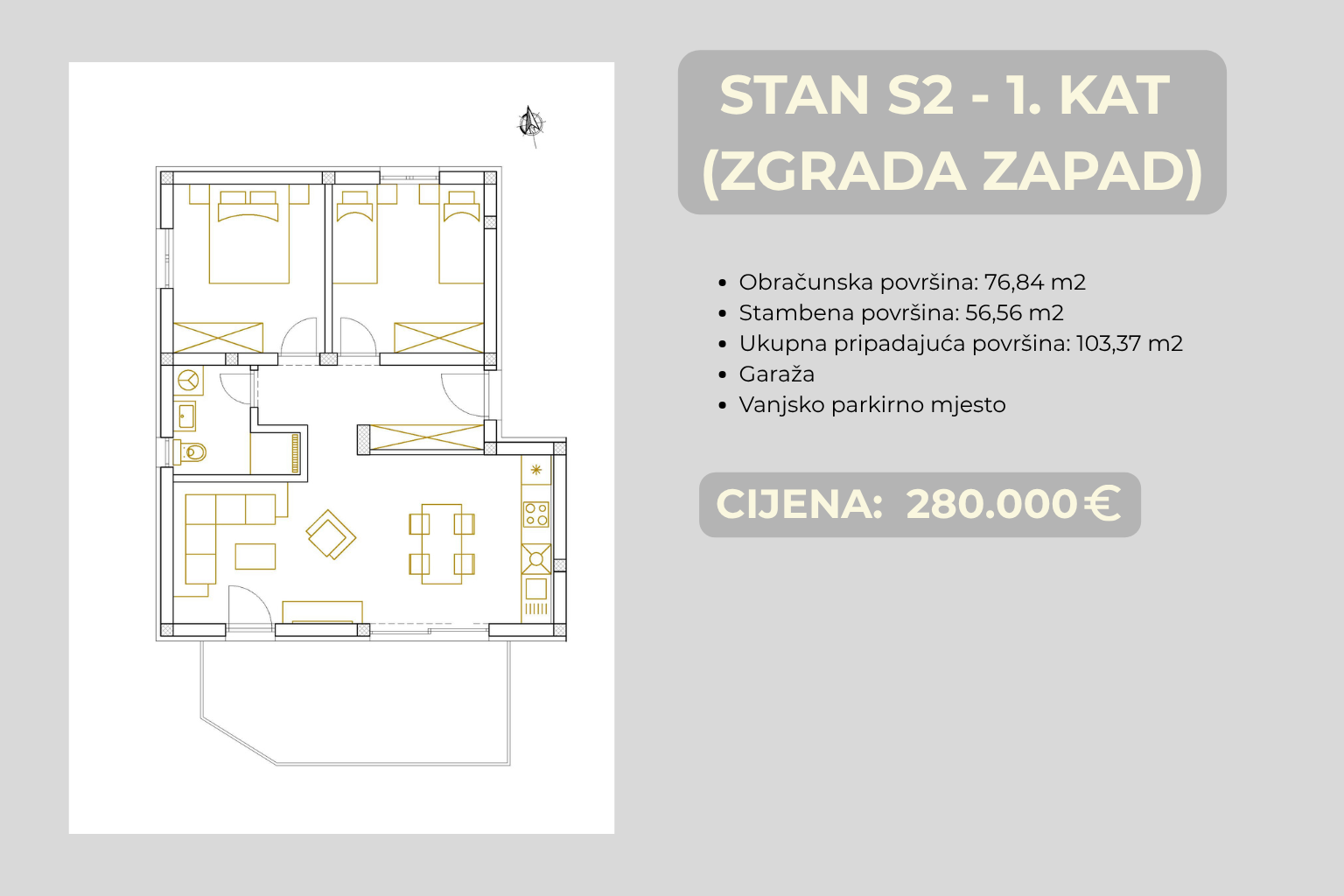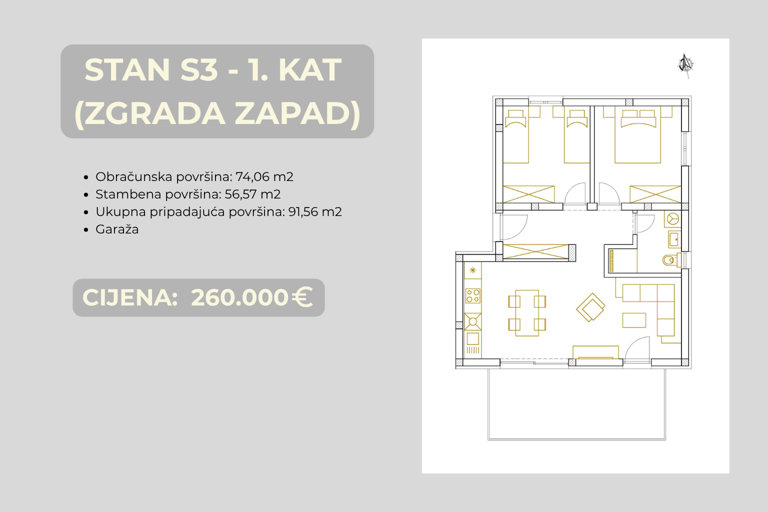 ŠIBENIK, BRODARICA – NEUBAU, Terrasse 15 m² und Garage, 270 m vom Meer In der derzeit begehrtesten Lage von Šibenik – Brodarica – nur 270 m vom Meer entfernt und in unmittelbarer Nähe zu allen Annehmlichkeiten des täglichen Lebens, entsteht ein neues Projekt, ideal für Familien und Kapitalanleger. Das Projekt besteht aus zwei kleineren Gebäuden mit insgesamt 8 Wohnungen (jeweils 4 Wohnungen), verteilt auf Erdgeschoss und zwei Obergeschosse. Dies bedeutet weniger Nachbarn und mehr Privatsphäre. Im Erdgeschoss befinden sich Garagen und eine Wohnung, im ersten Obergeschoss zwei Wohnungen und im zweiten Obergeschoss Penthäuser mit Meerblick. Jede Wohnung verfügt über eine eigene Garage und einen zusätzlichen Außenstellplatz (Wohnung S3 hat keinen Außenstellplatz), die im Preis inbegriffen sind – eine Seltenheit auf dem heutigen Immobilienmarkt. Kleinere Projekte erfreuen sich zunehmender Beliebtheit, da Käufer Ruhe, eine überschaubare Anzahl von Nachbarn und einen geringeren Wartungsaufwand immer mehr schätzen. Die Kombination aus Garage, Außenstellplatz und der Nähe zum Meer (nur wenige Gehminuten entfernt) bietet hier einen zusätzlichen Mehrwert. WOHNUNGSBESCHREIBUNG Wohnung S3 (GEBÄUDE WEST) befindet sich im 1. Obergeschoss und verfügt über eine Gesamtfläche von 74,07 m², wovon 56,57 m² reiner Wohnraum sind. Die Südostausrichtung sorgt für viel Tageslicht. Der Eingangsbereich trennt Wohn- und Schlafbereich und schafft so eine klare und funktionale Raumaufteilung. Wohnzimmer, Küche und Essbereich bilden einen offenen, nach Süden ausgerichteten Wohnbereich, der eine angenehme, helle Atmosphäre mit direktem Zugang zur Terrasse für entspannte Stunden im Freien bietet. Funktionale Raumaufteilung mit klar getrennten Wohn- und Schlafbereichen sorgt für Ruhe und optimale Raumausnutzung ohne unnötige Durchgänge. GRUNDRISS • Offener Wohn-/Essbereich mit Küche • Zugang zur Terrasse (15 m²) • 2 Schlafzimmer • Badezimmer • Flur zwischen Wohn- und Schlafbereich BAUQUALITÄT UND AUSSTATTUNG • 10 cm Wärmedämmfassade – für mehr Wohnkomfort und niedrigere Heizkosten • Fußbodenheizung in allen Räumen außer den Schlafzimmern • Klimaanlage in allen Räumen • Kunststoffbeschichtete Aluminiumfenster mit Dreifachverglasung – für bessere Wärmedämmung und Ruhe • Elektrische Rollläden und Moskitonetze – praktischer Schutz vor Insekten ohne zusätzliche Kosten • Kombination aus Keramik und Parkett – langlebig und behaglich LAGE Brodarica zählt zu den begehrtesten Wohnlagen in der Region Šibenik, gerade wegen der hohen Lebensqualität und der Nähe zum Meer. Alle wichtigen Einrichtungen sind in wenigen Minuten erreichbar, und die nur 270 Meter zum Meer ermöglichen einen schnellen und unkomplizierten Strandbesuch ohne Auto. Die Nähe zu Šibenik bietet schnellen Zugang zu allen städtischen Annehmlichkeiten, während die Lage selbst Funktionalität und gute Verkehrsanbindung gewährleistet. • Meer: 270 m • Geschäft: 400 m • Schule/Kindergarten: 1,2 km • Zentrum Šibenik: 7,7 km • Flughafen Split: 55,5 km • Flughafen Zadar: 78,5 km • Nationalpark Krka: 17 km • Autobahn: 11 km Die Lage an der Hauptstraße erleichtert die tägliche Fortbewegung und vermeidet enge Gassen – ein klarer Vorteil gegenüber vergleichbaren Lagen. FÜR WEN IST DIESE IMMOBILIE IDEAL? Eine ausgezeichnete Wahl für Käufer, die das Leben am Meer mit ganzjähriger Funktionalität und der Sicherheit einer Garage und zusätzlicher Parkplätze verbinden möchten. Aufgrund der Nähe zum Meer und der hohen Nachfrage nach Immobilien dieser Art stellt sie auch eine logische Wahl als langfristige Investition dar.