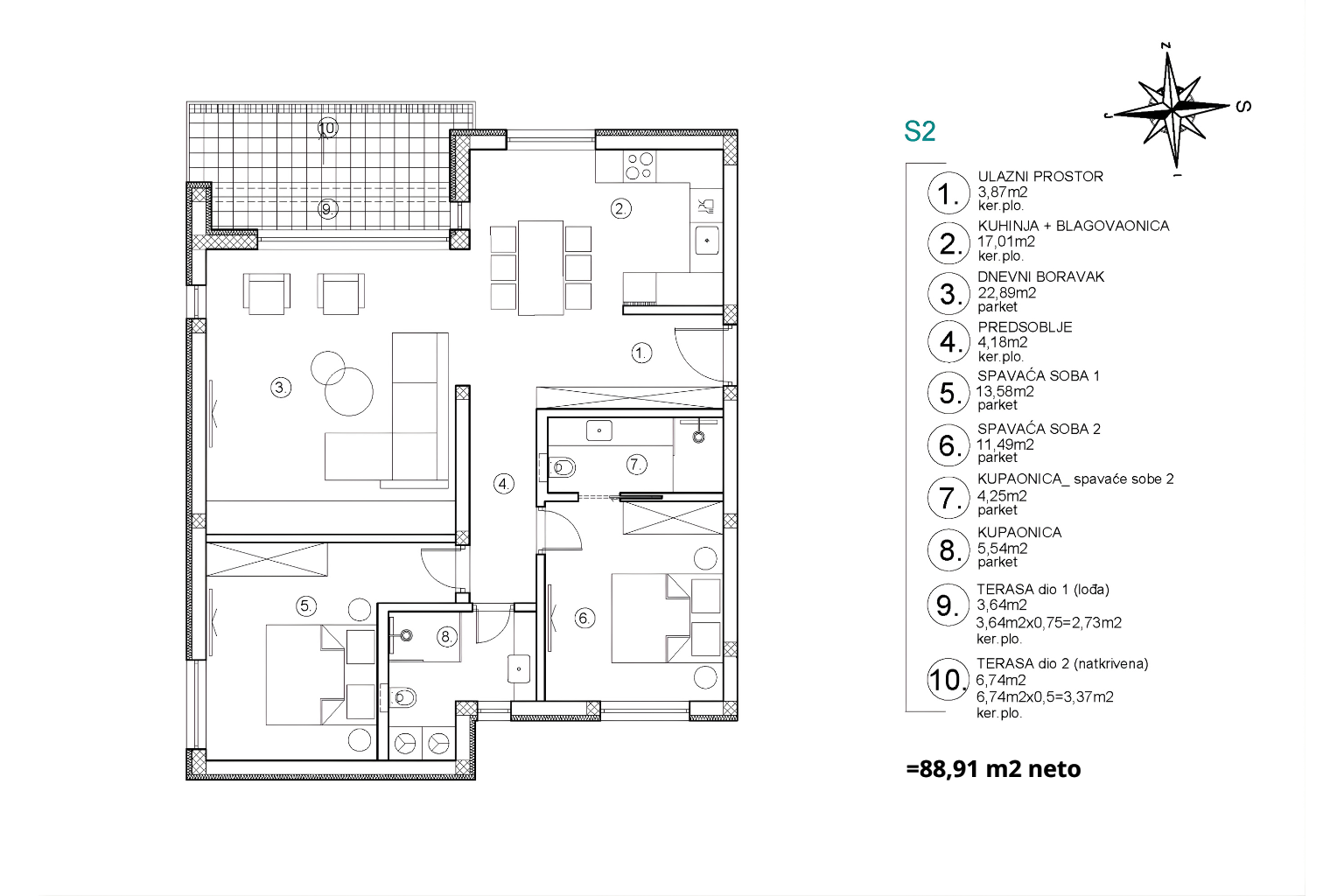 ŠIBENIK, VODICE – Drei-Zimmer-Wohnung in einem Neubau mit Garage, Abstellraum und 102 m² großer Dachterrasse mit Meerblick In einem kleineren Wohngebäude mit insgesamt 5 Wohnungen in ruhiger Lage in Vodice steht die Wohnung S4 im 2. Obergeschoss zum Verkauf. Die Wohnung S4 befindet sich im 2. Obergeschoss, verfügt über 86,76 m² beheizte Wohnfläche (126,58 m² Nutzfläche) und ist nach Süden ausgerichtet, wodurch sie viel Tageslicht erhält. Beim Betreten der Wohnung gelangt man direkt in den Wohnbereich mit Wohnzimmer, Küche und Essbereich, der an eine überdachte Terrasse angrenzt. Über einen Flur erreicht man die restlichen drei Schlafzimmer, darunter ein Hauptschlafzimmer mit eigenem Bad und ein weiteres Badezimmer. Was diese Immobilie auf dem Markt jedoch auszeichnet, ist die 102 m² große Dachterrasse mit Panoramablick aufs Meer – ein Ort, der sich mühelos in Ihre private Oase verwandeln lässt: • Sommerküche • Wohnbereich • Whirlpool oder Lounge-Bereich • Abendessen bei Sonnenuntergang AUFTEILUNG Sie besteht aus: • offenem Wohnbereich mit Küche und Essbereich • überdachter Terrasse (7 m²) • 3 Schlafzimmer • 2 Badezimmer (eines davon en suite) • Flur, der den Schlafbereich abtrennt • Dachterrasse • Garage und Abstellraum im Erdgeschoss Die Raumaufteilung ist optimal genutzt – ohne ungenutzten Platz, mit klarer Trennung von Wohn- und Schlafbereich. Ausstattung und Qualität: Die Wohnung wurde mit Fokus auf langfristigen Komfort und Energieeffizienz erbaut: • Fußbodenheizung in Wohnbereich und Bädern – ganzjährig angenehmes Wohnklima • Klimaanlage in allen Räumen – individuelle Temperaturregelung • PVC-Fenster (Gealan) mit Dreifachverglasung – Ruhe, Wärmedämmung und geringere Kosten • Elektrische Rollläden und Moskitonetze – zusätzlicher Komfort • Schiebewände – mehr Licht und bessere Verbindung zur Terrasse • Vorbereitung für eine Sommerküche auf dem Dach (Strom, Wasser, Abwasser) • Vorbereitung für Solaranlage – langfristige Einsparungen • Vorbereitung zum Laden von Elektrofahrzeugen in der Garage Zur Wohnung gehören ein Garagenstellplatz und ein Abstellraum. LAGE: Die Nähe zum Meer und zum neueren Teil von Vodice schafft eine ideale Balance zwischen entspanntem Wohnen und der Verfügbarkeit aller Annehmlichkeiten. Die Lage ermöglicht eine schnelle Anbindung an das Zentrum und bietet gleichzeitig Ruhe abseits der touristischen Hauptströme. Käufer entscheiden sich für diesen Stadtteil aufgrund der Kombination aus Privatsphäre, Aussicht und Wertstabilität. • Meer: 500 m • Zentrum: ca. 1 km (15 Gehminuten) • Einkaufsmöglichkeiten: 900 m • Schule/Kindergarten: 1,2 km Die Lage inmitten neuerer Gebäude sorgt für einen einheitlichen Standard und ein gepflegtes Umfeld. FÜR WEN IST DIESE IMMOBILIE IDEAL? Für Käufer, die ihren eigenen Aufenthalt am Meer mit der Möglichkeit der touristischen Vermietung verbinden möchten und dabei besonderen Wert auf viel Platz im Freien und eine traumhafte Aussicht legen. Immobilien wie diese – mit einer großen Dachterrasse in Meeresnähe und freiem Meerblick – sind selten auf dem Markt. Kontaktieren Sie uns für weitere Informationen und um einen Besichtigungstermin zu vereinbaren – solange die Immobilie noch verfügbar ist. VODICE – Charmante Stadt mit pulsierendem Nachtleben und traumhaften Stränden Vodice ist ein beliebtes Touristenziel 10 Kilometer nördlich von Šibenik. Es ist besonders bei jungen Besuchern beliebt, die ein lebendiges Nachtleben suchen. Vodice bietet erstklassige Hotels, Strände und ein vielfältiges Nachtleben. Der Name „Vodice“ wurde erstmals 1402 schriftlich erwähnt, obwohl bekannt ist, dass dort bereits in römischer Zeit Menschen lebten. Der Ort erhielt seinen Namen aufgrund des reichlichen Wasservorkommens und der zahlreichen Brunnen. Die Insel Prvić liegt in der Nähe, die Stadt Split ist 69 km, Zadar 59 km und der nächste Flughafen 49 km entfernt.