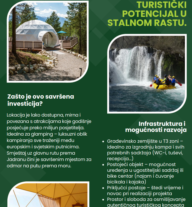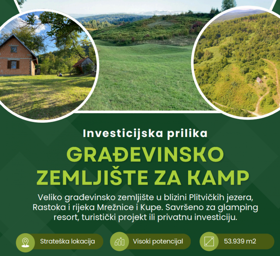 SLUNJ, PRIMIŠLJE – Investitionsmöglichkeit – Baugrundstück für einen Campingplatz der Kategorie T3! Zum Verkauf steht ein äußerst attraktives Baugrundstück mit einer Gesamtfläche von 53.939 m² in der Nähe der Plitvicer Seen, Rastoke sowie der Flüsse Mrežnica und Kupa: eine Lage mit erheblichem touristischem Potenzial und stetig steigender Nachfrage. Das Grundstück befindet sich in der T3-Campingzone und ermöglicht den Bau eines Feriencamps mit folgenden Einrichtungen: • Gastronomie • Rezeption und Nebengebäude • Sanitäranlagen (WC, Duschen) • Glamping-Unterkünfte (Cottages, Zelte, Glamping-Kuppeln) • Zusätzliche Einrichtungen wie ein Fahrradverleih oder Flächen für Outdoor-Aktivitäten Hauptvorteile: ✔ Strategisch günstig und gut erreichbar ✔ Ruhige, naturnahe Umgebung – ideal für ein luxuriöses Glamping-Konzept ✔ Vorhandene Anlage auf dem Grundstück – Umbau zu Gastronomie möglich ✔ Infrastrukturanschlüsse vorhanden (erhebliche Zeit- und Kostenersparnis) ✔ Unterkunft an der Hauptstraße zur Adria – ein perfektes Ziel für einen Zwischenstopp Die Lage inmitten unberührter Natur, Hügeln und Panoramablick bietet die ideale Grundlage für die Entwicklung eines authentischen Tourismusprojekts mit hohem Mehrwert. Angesichts der stetig wachsenden Nachfrage nach Glamping und nachhaltigem Tourismus bietet diese Immobilie eine außergewöhnliche Gelegenheit für Investoren, die in einer der vielversprechendsten Regionen Kroatiens ein modernes Camp oder ein Boutique-Resort entwickeln möchten. Für weitere Informationen und zur Vereinbarung eines Besichtigungstermins kontaktieren Sie uns bitte.