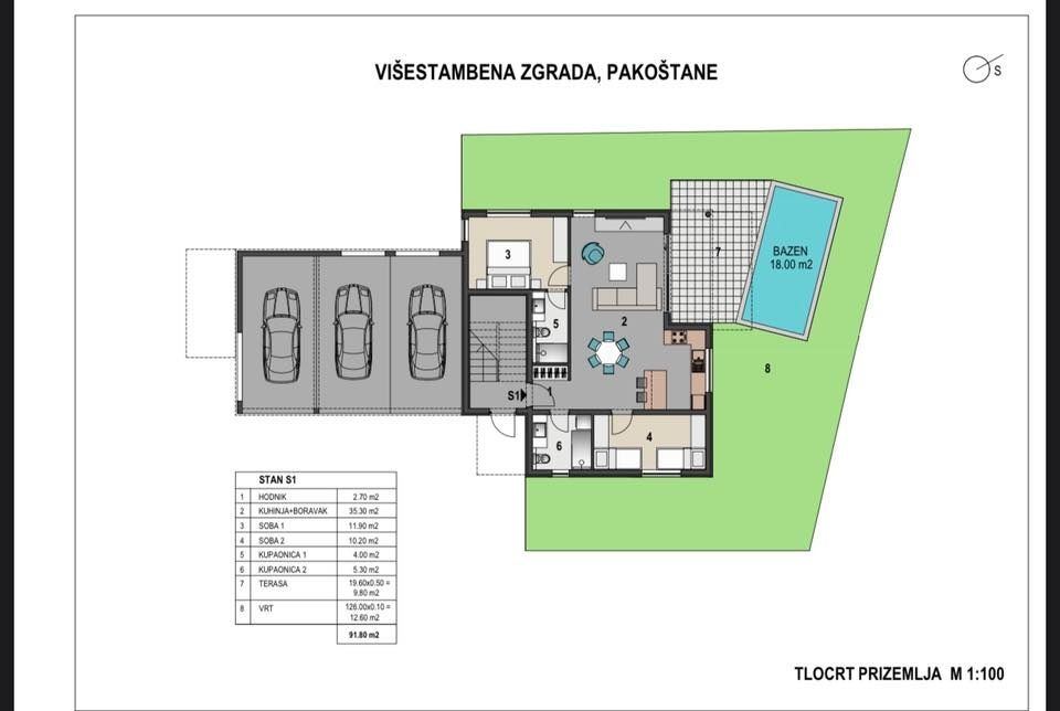 ZADAR, PAKOŠTANE – Neubauwohnung mit 2 Schlafzimmern und Wohnzimmer, 1. Stock Die Wohnung verfügt über zwei Schlafzimmer, zwei Badezimmer, ein offenes Wohnzimmer mit Küche und Esszimmer, eine Terrasse und einen Parkplatz. Zur modernen Ausstattung gehören: ✔ PVC-Fenster mit Dreifachverglasung ✔ Elektrische Rollläden, Moskitonetze und Fußbodenheizung im WC (möglicherweise in allen Räumen) ✔ Klimaanlage in jedem Zimmer ✔ Einbruch-/Brandschutztüren Südwestausrichtung – viel Tageslicht! Baubeginn ist im Herbst 2025, voraussichtliche Fertigstellung Ende 2026. Immobilieneigentum, Kauf bereits während der Bauphase möglich. Für weitere Informationen rufen Sie uns bitte an.
