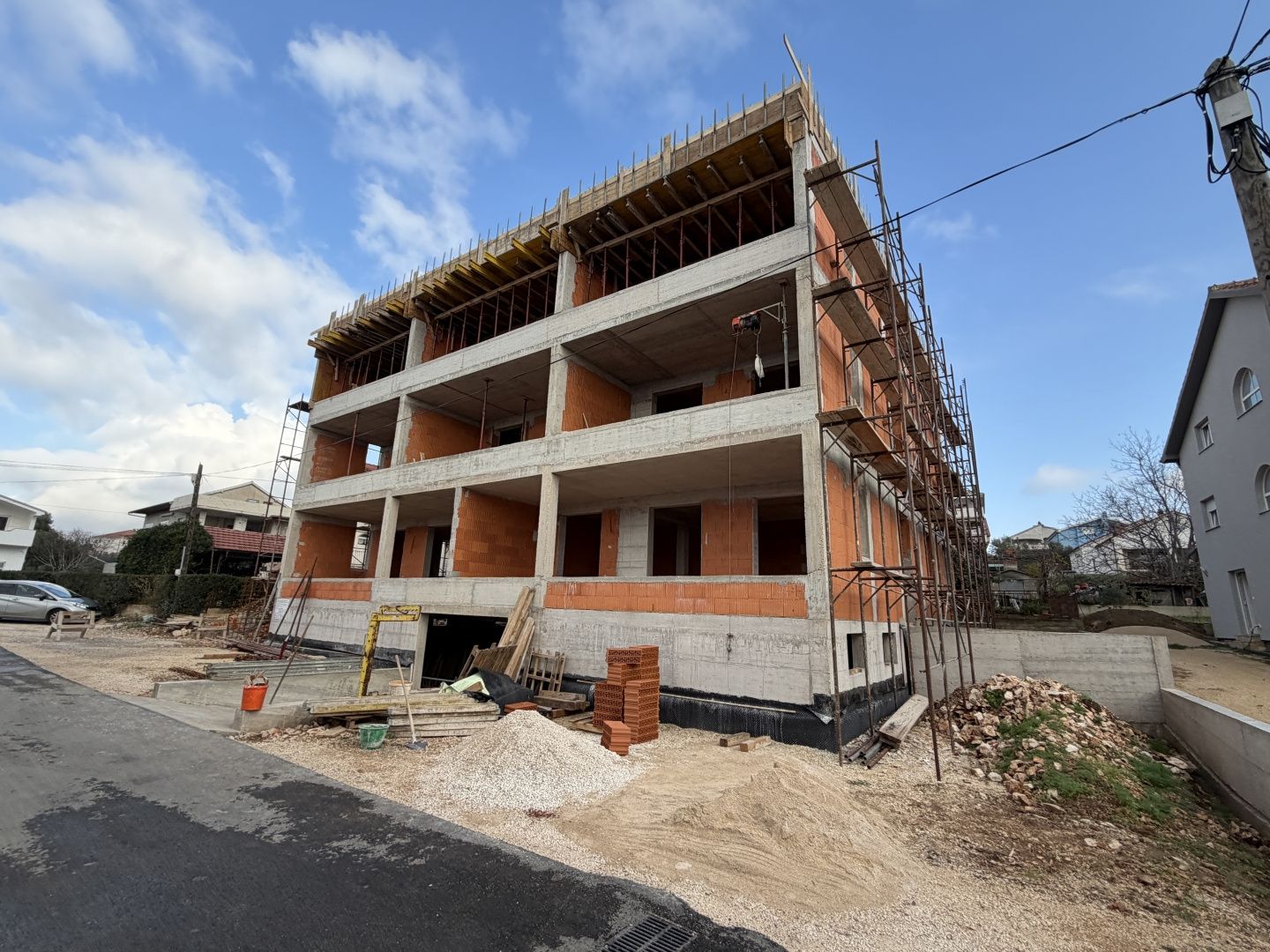 ZADAR, CRVENE KUĆE – Wohnung 61,13 m², Garage + Stellplatz! In einer ruhigen und begehrten Gegend von Zadar, im Viertel Crvene kuće, befindet sich ein modernes Wohngebäude mit insgesamt acht Wohnungen. Bei der Gestaltung wurde besonderer Wert auf hochwertige Bauweise, Funktionalität und ein angenehmes Wohnklima gelegt. Besonders hervorzuheben ist die Wohnung S6 im zweiten Obergeschoss mit einer Wohnfläche von 61,1 m² inklusive aller Annehmlichkeiten. Es handelt sich um eine komfortable Einzimmerwohnung mit optimaler Raumaufteilung, bestehend aus einem Wohnzimmer mit angrenzender Küche, Schlafzimmer, Flur und einer gemütlichen Loggia. Die Wohnung ist mit hochwertigen PVC-Fenstern, elektrischen Rollläden und Insektenschutzgittern ausgestattet. Klimaanlagen im Wohn- und Schlafzimmer sorgen für angenehme Temperaturen. Ein Kamin mit der Möglichkeit zum Beheizen mit einem Festbrennstoffofen bietet zusätzlichen Komfort. Zur Wohnung gehören ein eigener Abstellraum und zwei Stellplätze – einer in der Garage und einer im Freien –, was maximalen Komfort im Alltag gewährleistet. Das gesamte Gebäude wurde mit hochwertigen und geprüften Materialien errichtet. Alle Wohnungen verfügen über einen Kamin für Festbrennstoffheizung, Klimaanlage in Wohn- und Schlafzimmern sowie Fußbodenheizung in den Badezimmern. Die Schlafzimmer sind mit Parkettboden ausgestattet, die übrigen Räume mit hochwertigen Fliesen. Jede Wohnung bietet einen Abstellraum, eine Garage und einen Außenstellplatz. Die Lage ist ideal für Familien: In unmittelbarer Nähe befinden sich eine Grundschule, ein Kindergarten und alle notwendigen Einrichtungen. Die Nachbarschaft selbst bietet Ruhe, Privatsphäre und ein angenehmes Wohnumfeld – perfekt für eine sichere, langfristige Investition.